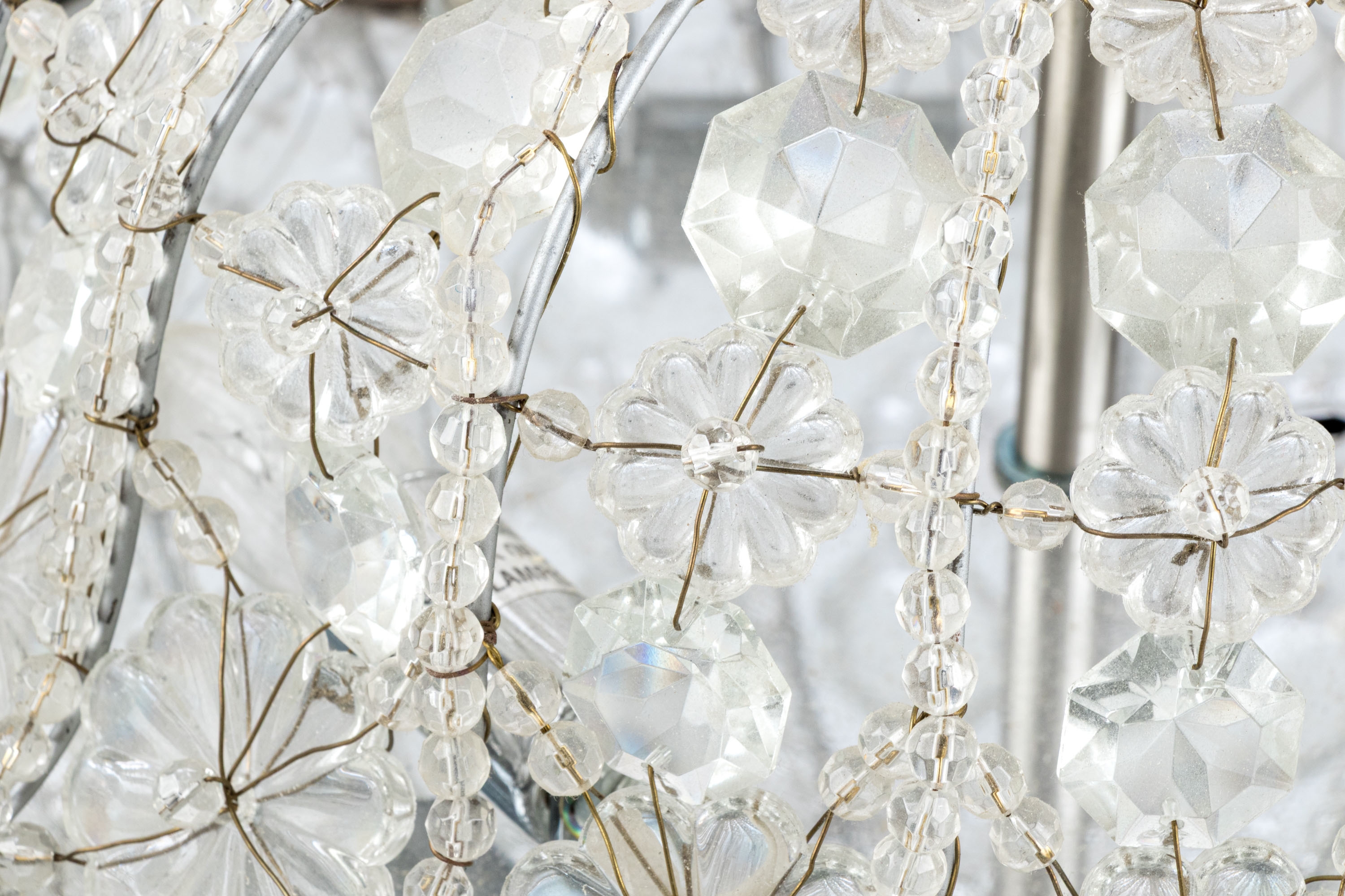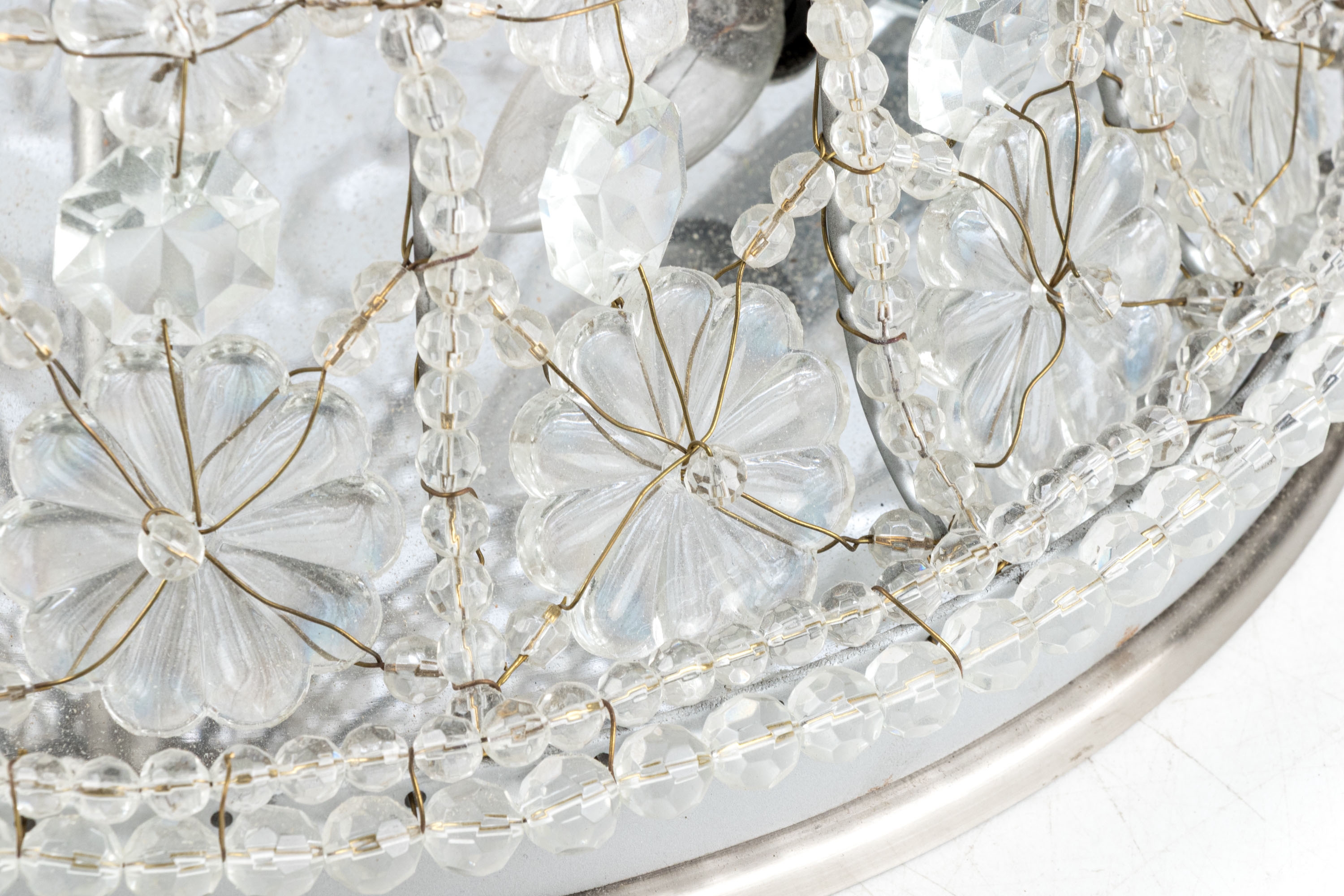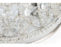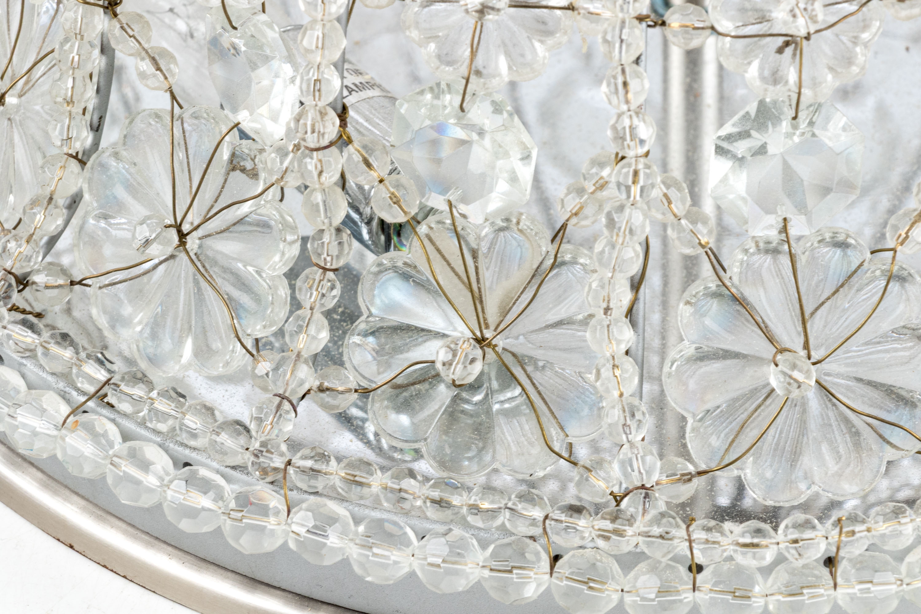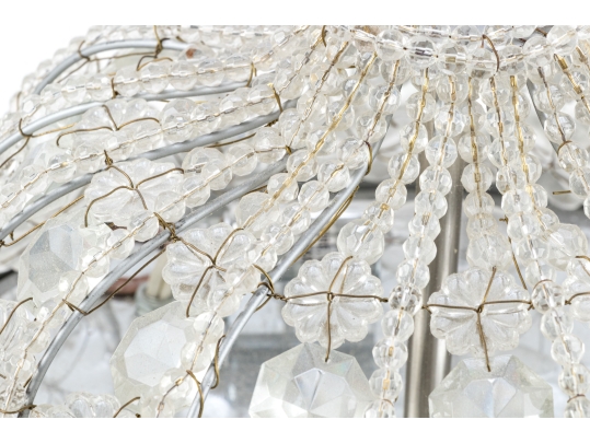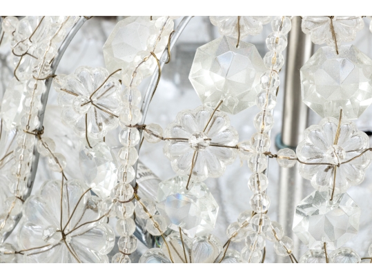 Vintage crystal macaroni beaded basket chandelier made by New Metal Crafts Inc. The chandelier has a domed shape, constructed with a wire frame adorned with numerous round, faceted and flower form clear crystal beads. These beads create a textured, almost net-like appearance. The lower portion of the chandelier is finished with a metal ring, which appears to be chrome. The overall design is reminiscent of a retro or vintage style, and it's designed to be mounted flush against a ceiling. Retains the original label.