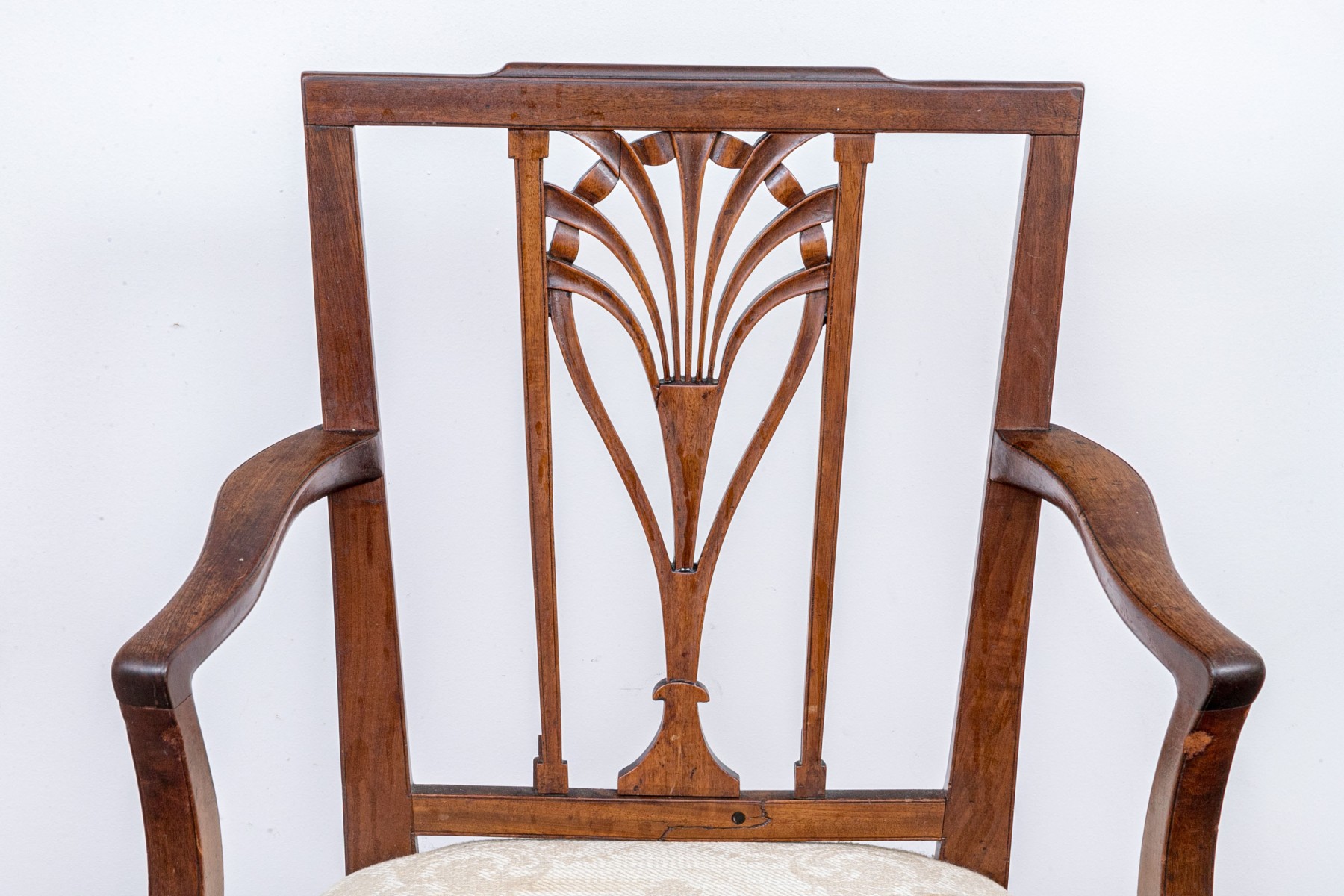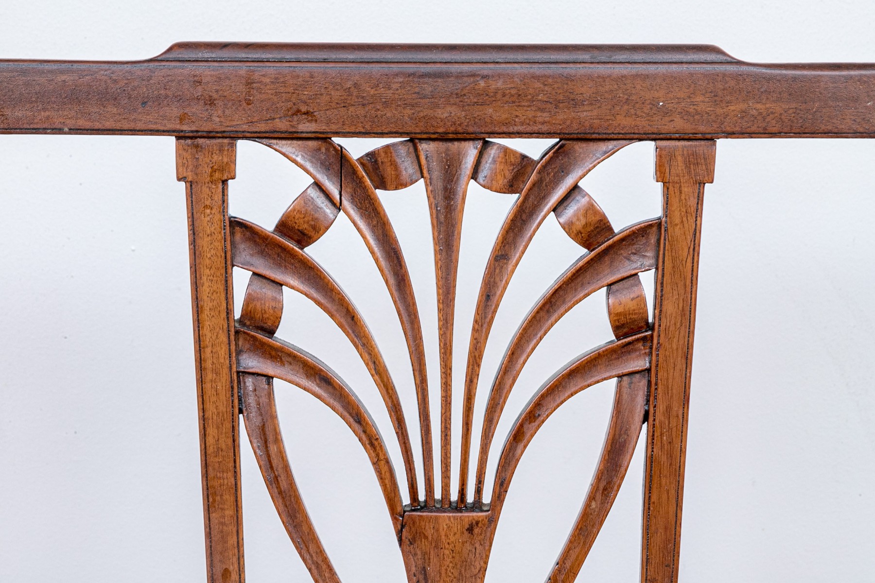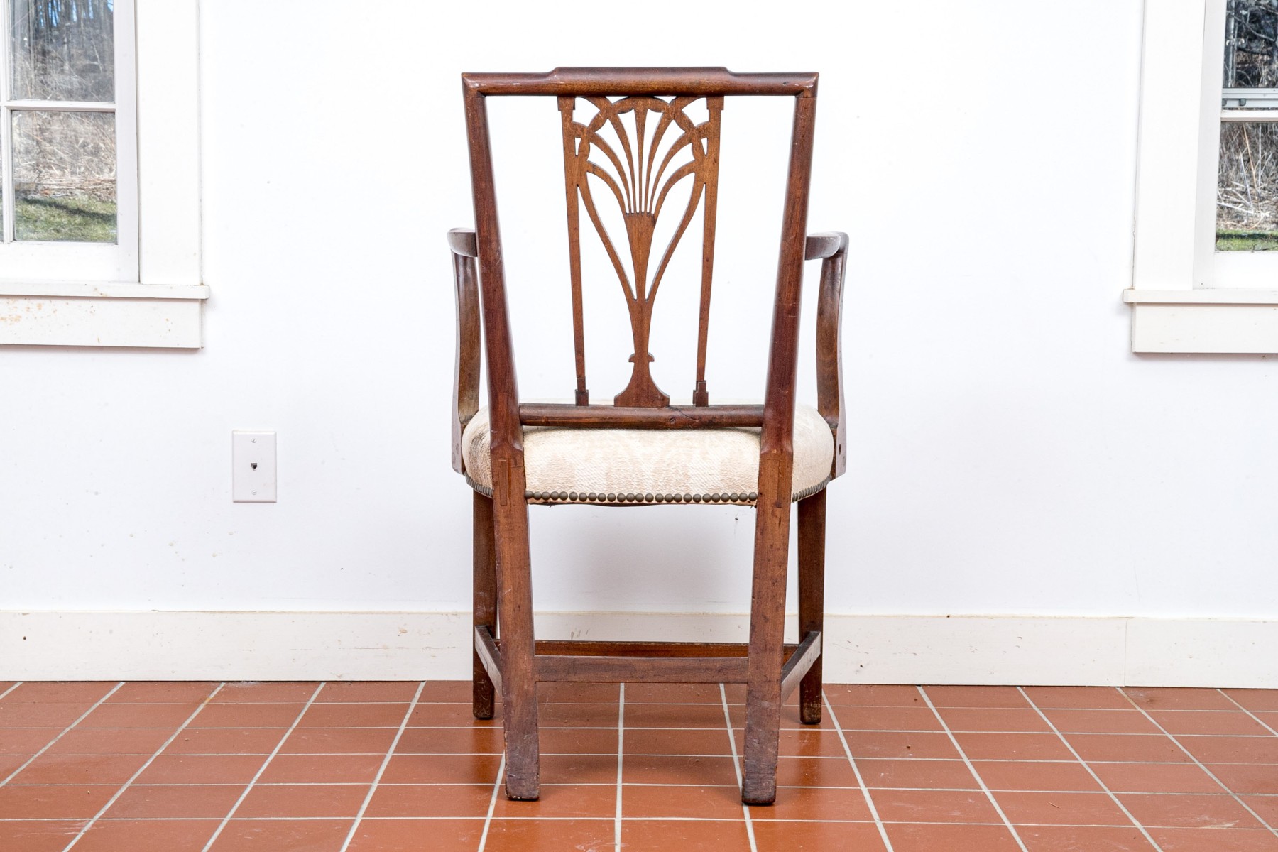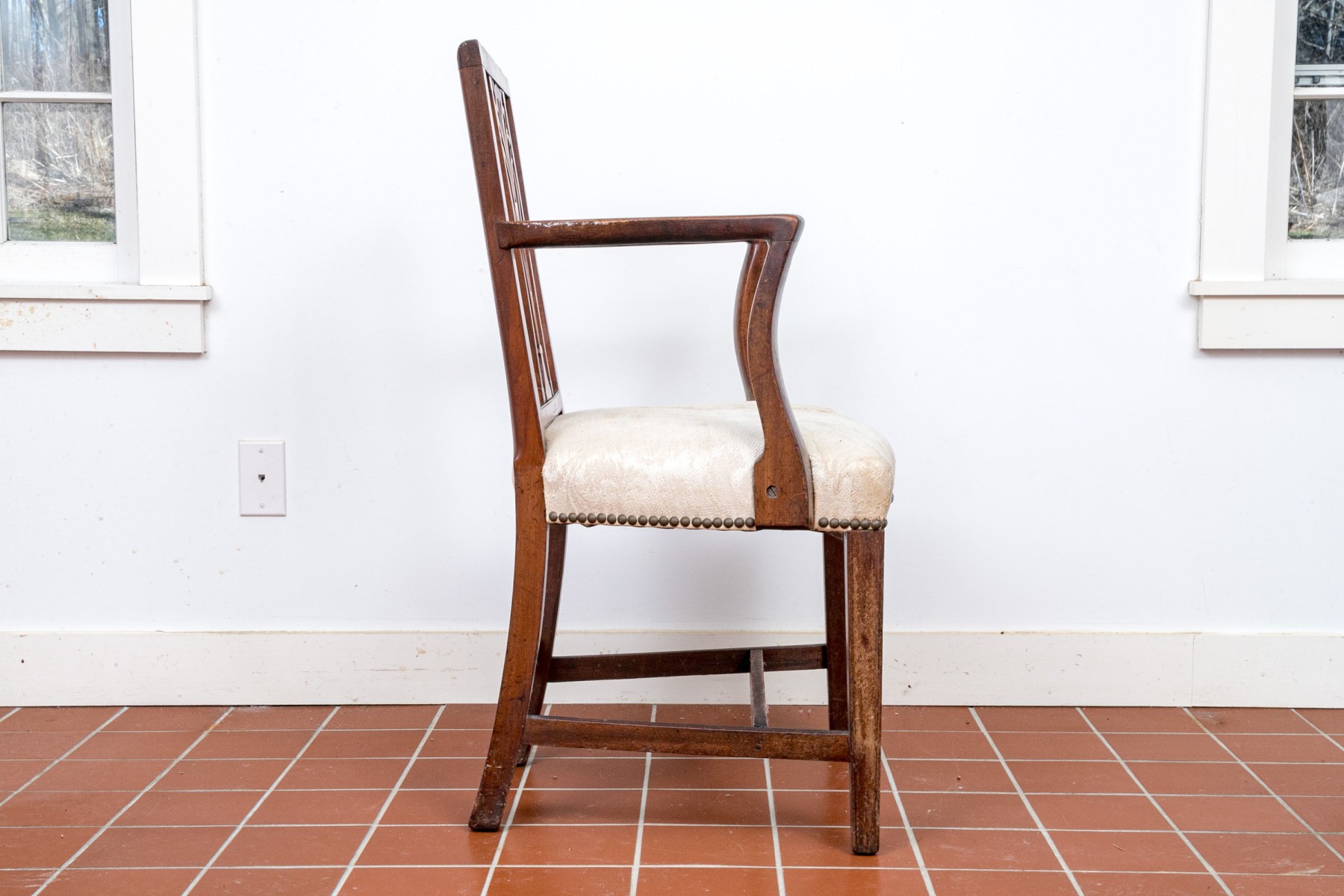 Raised on four squared tapered legs with stretcher support. The chair has an upholstered seat cushion with brass nailhead trim. Nicely carved arms and a beautiful pierced vase with floral bouquet form back splat.