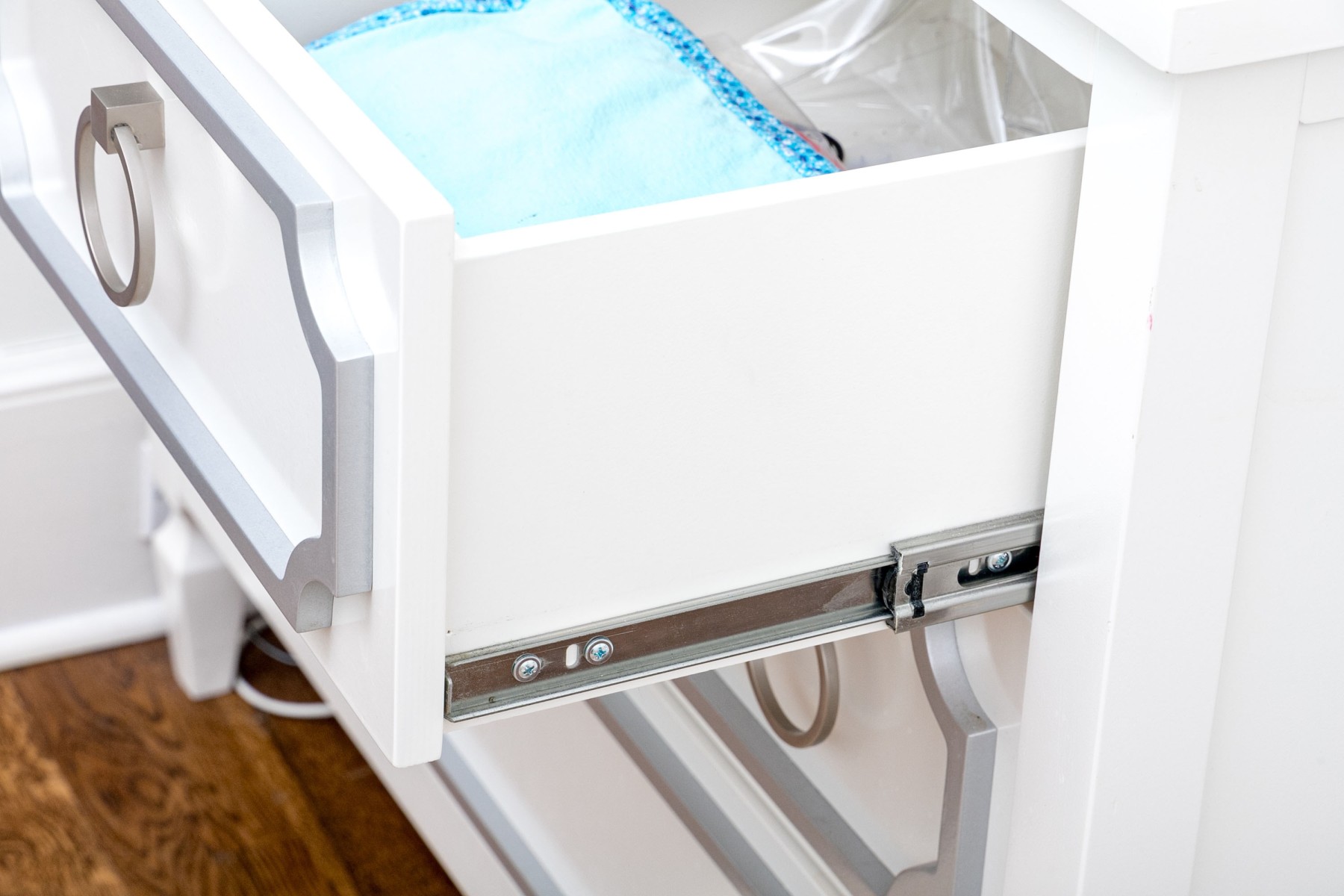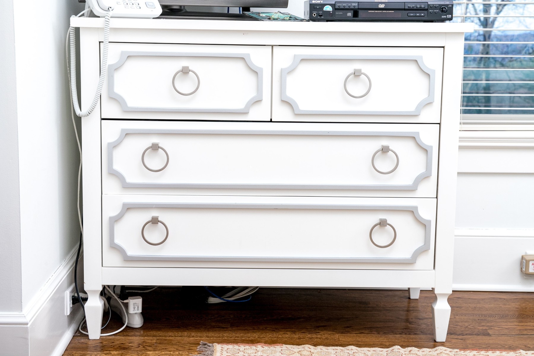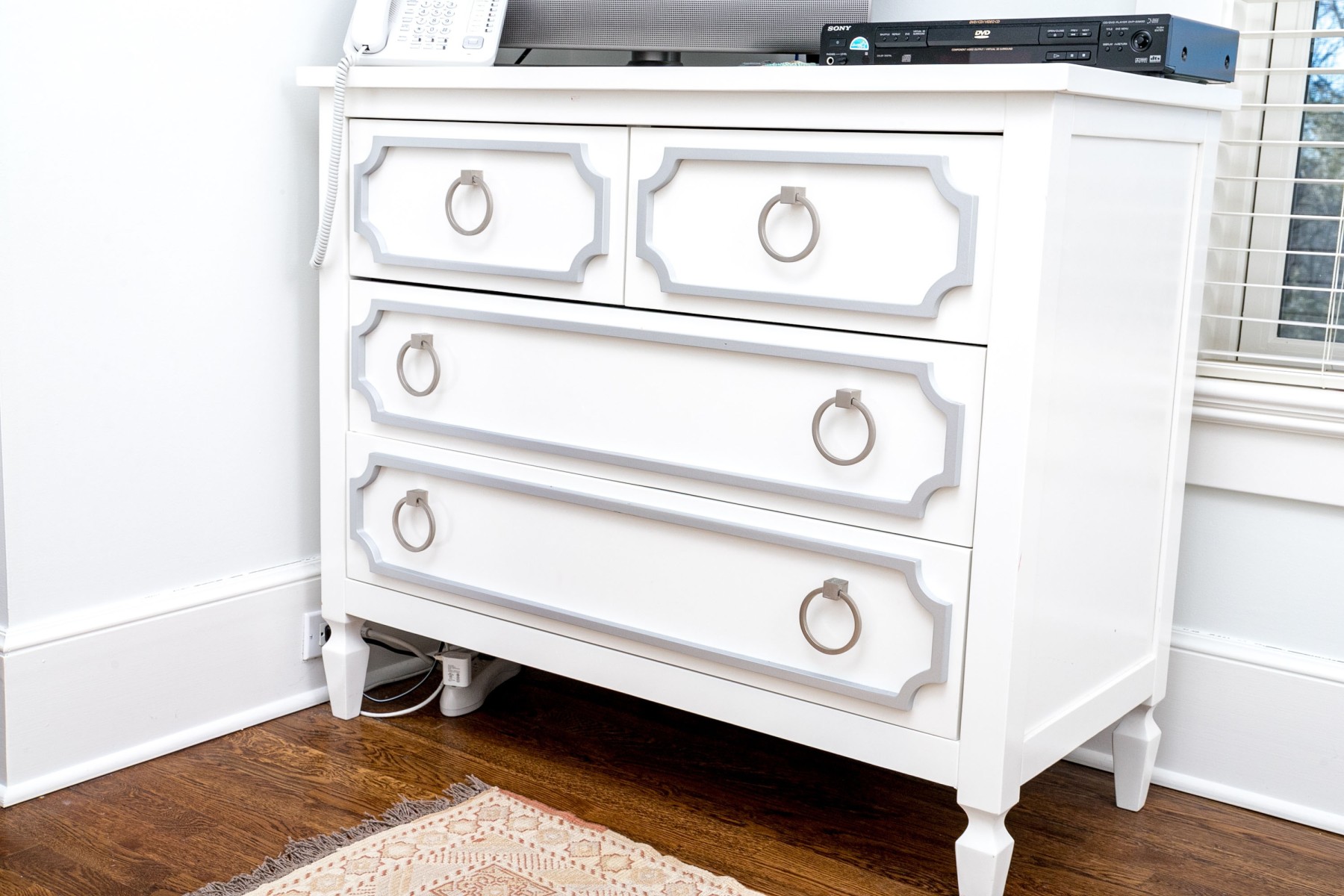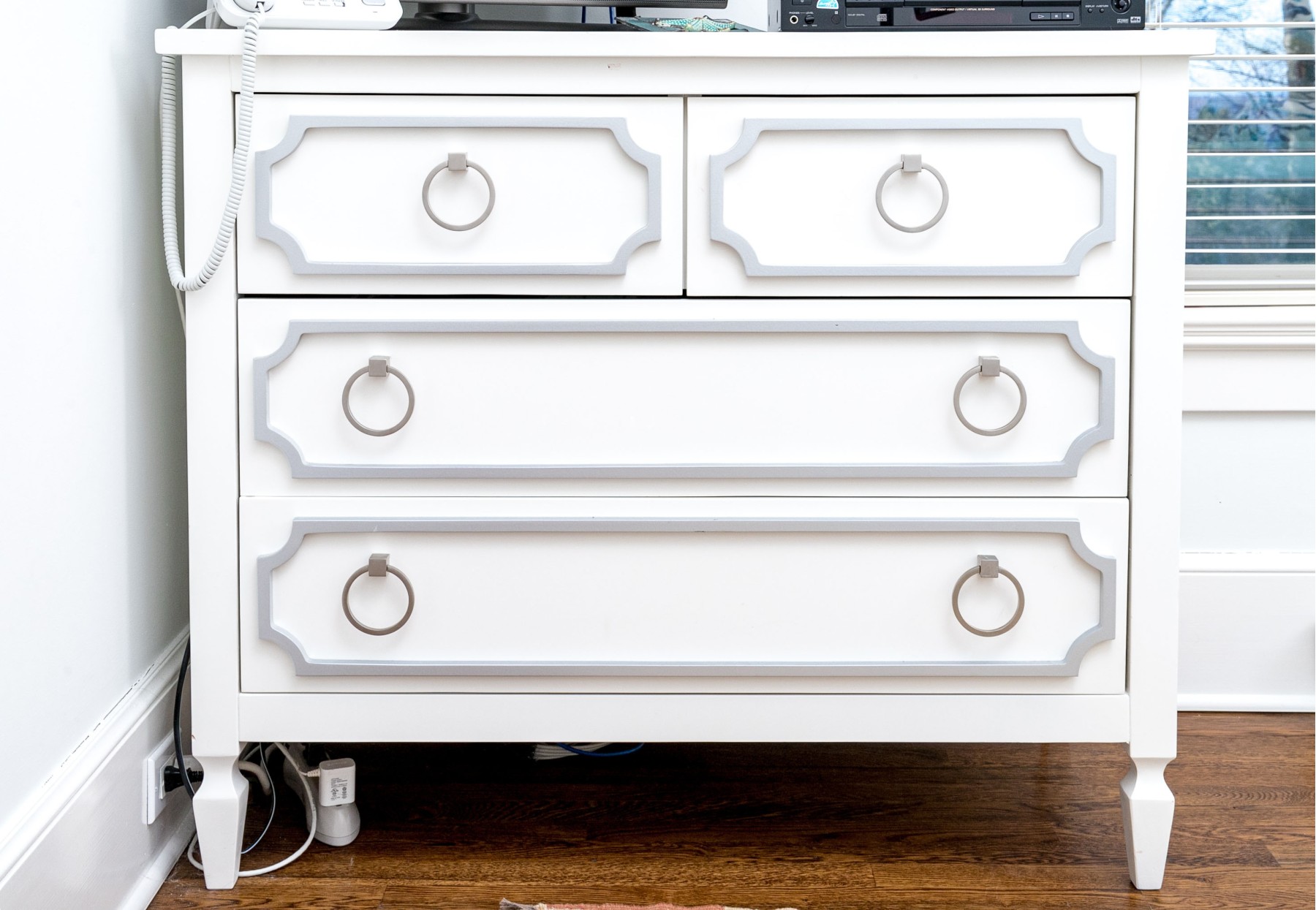 A fabulous Newport Cottages "Beverly" dresser exuding modernized Hollywood Regency charm with a bright white finish over a rectangular top overhanging a two-over-two arrangement of drawers with with light blue paneling adorned with large gray loop handles. Raised over straight rectangular legs with a three quarters box stretcher raised on spade feet.