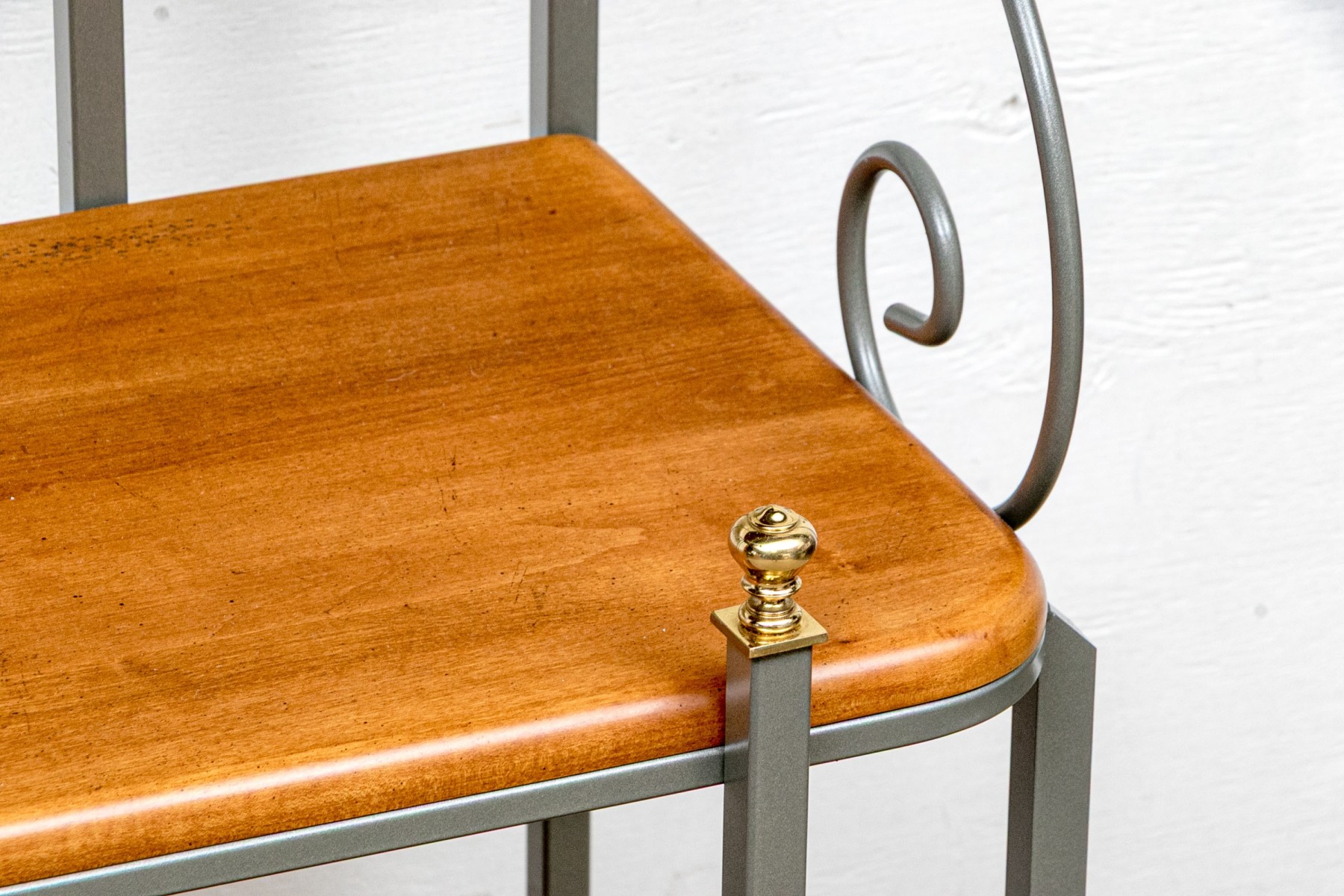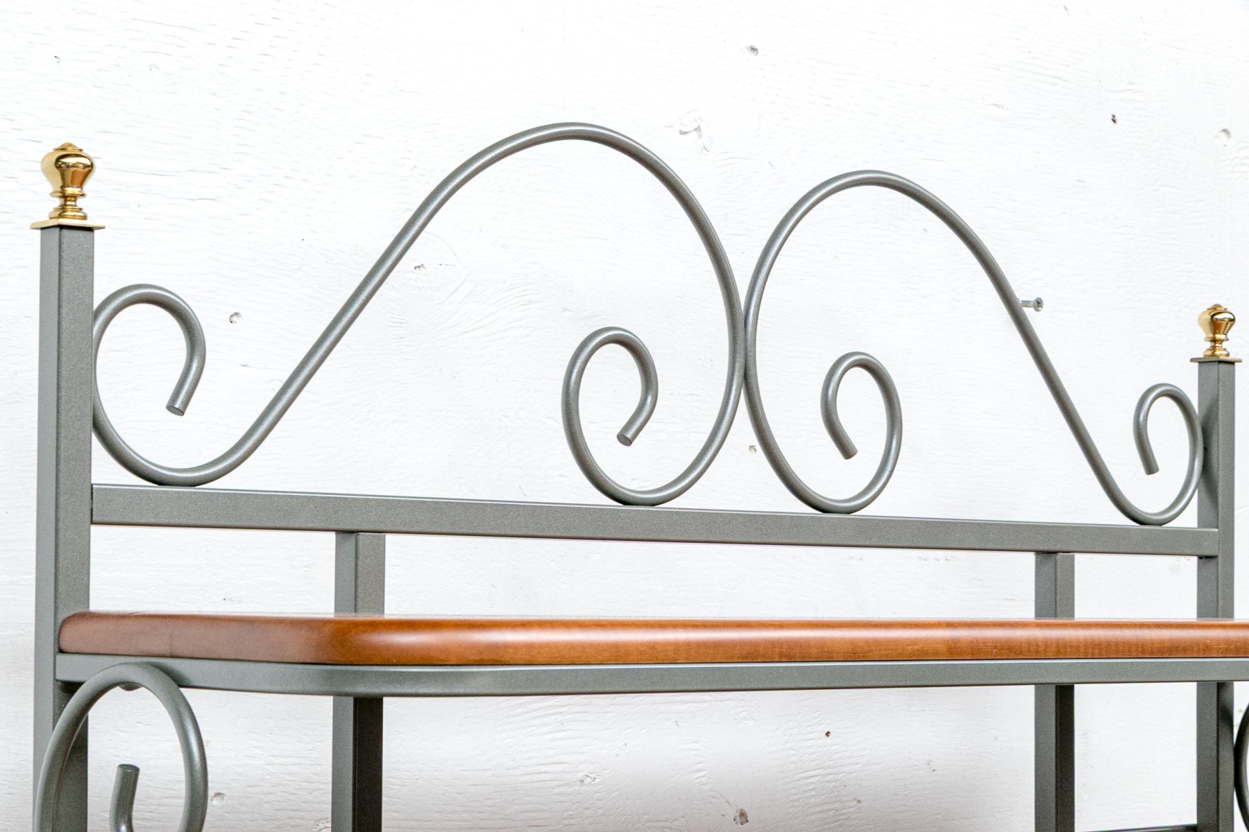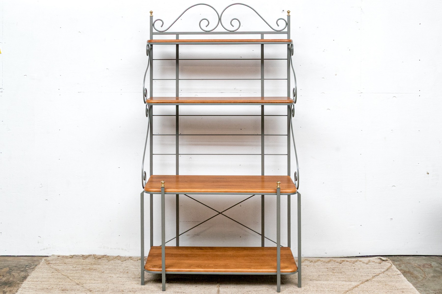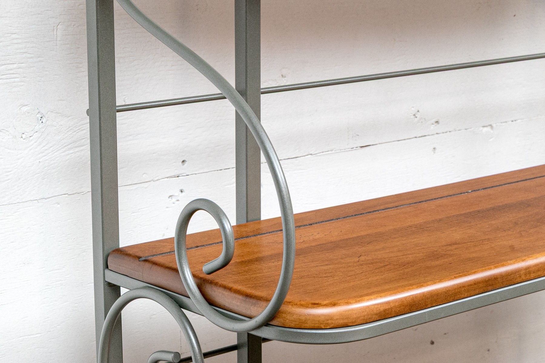 The bakers rack with four maple shelves with a wonderful grey finished Art Nouveau inspired frame with brass finished finials in front of the lower two shelves and upper back. Scrolled ends on either side.