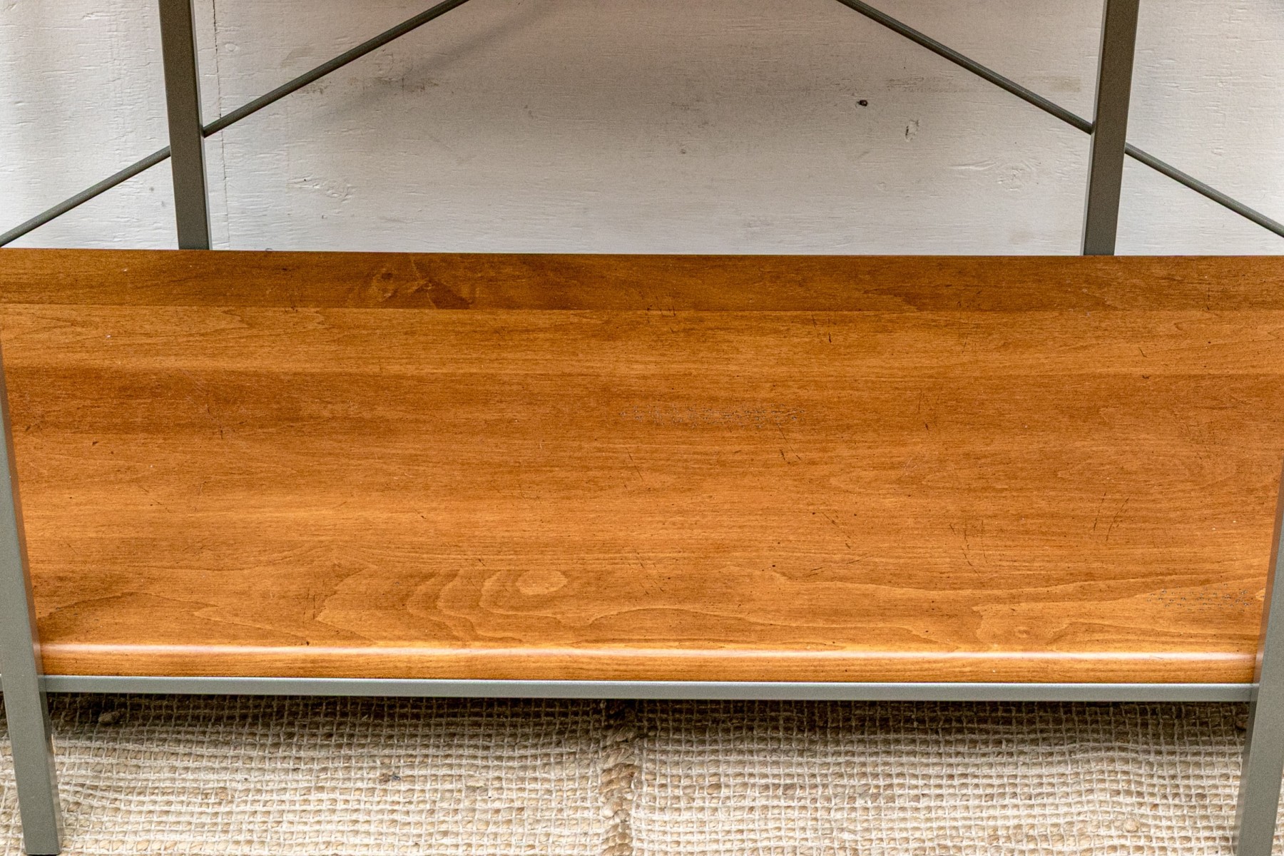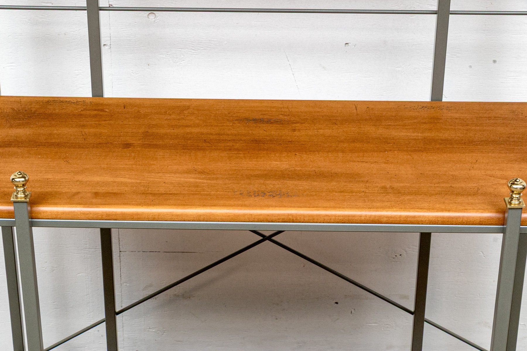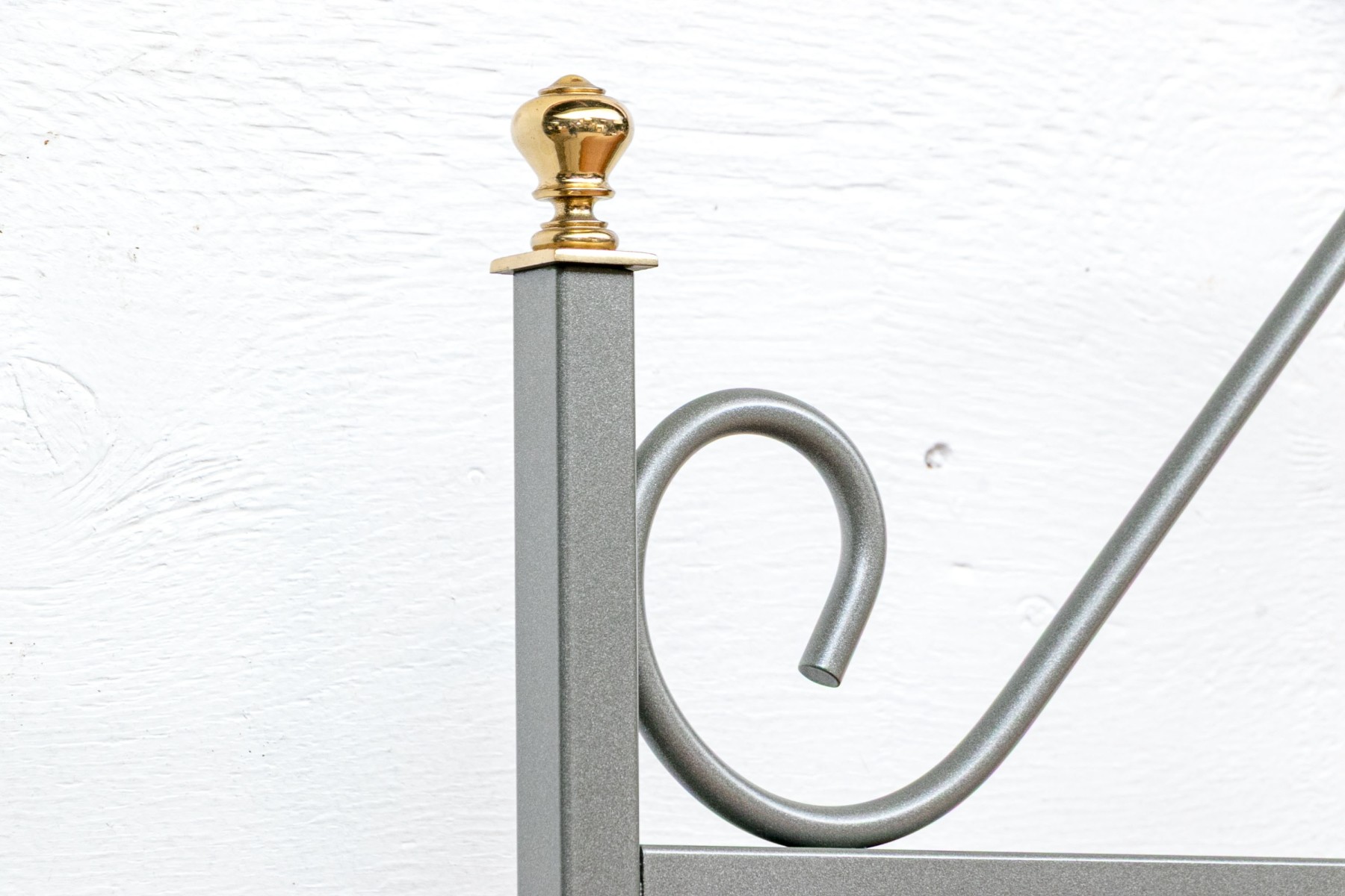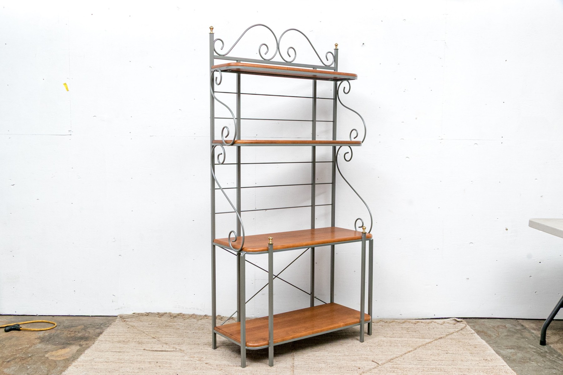 The bakers rack with four maple shelves with a wonderful grey finished Art Nouveau inspired frame with brass finished finials in front of the lower two shelves and upper back. Scrolled ends on either side.