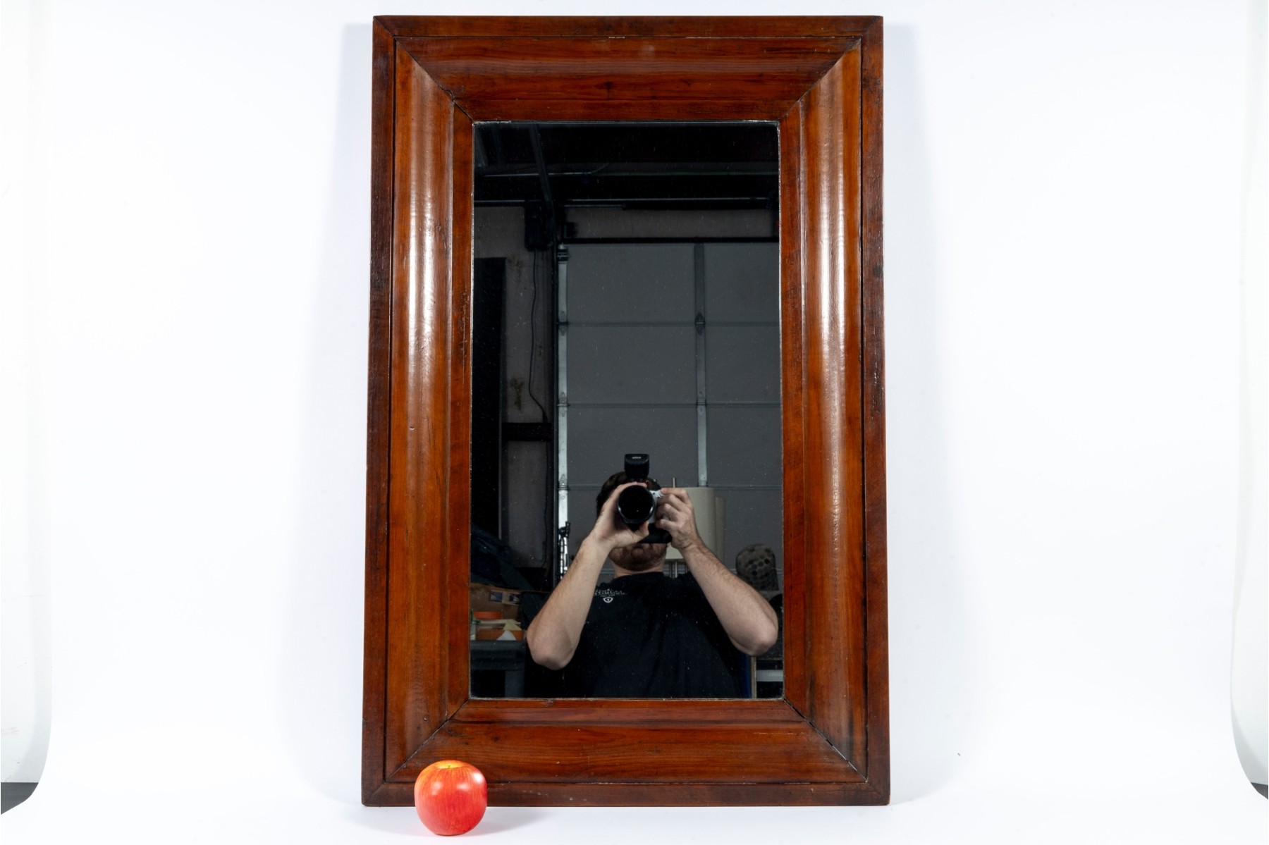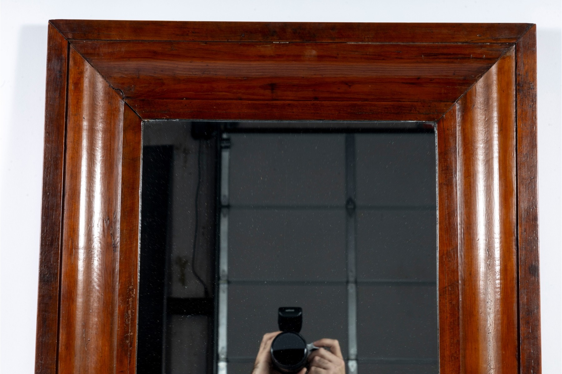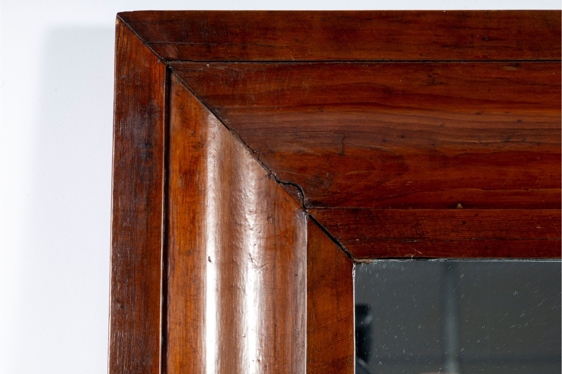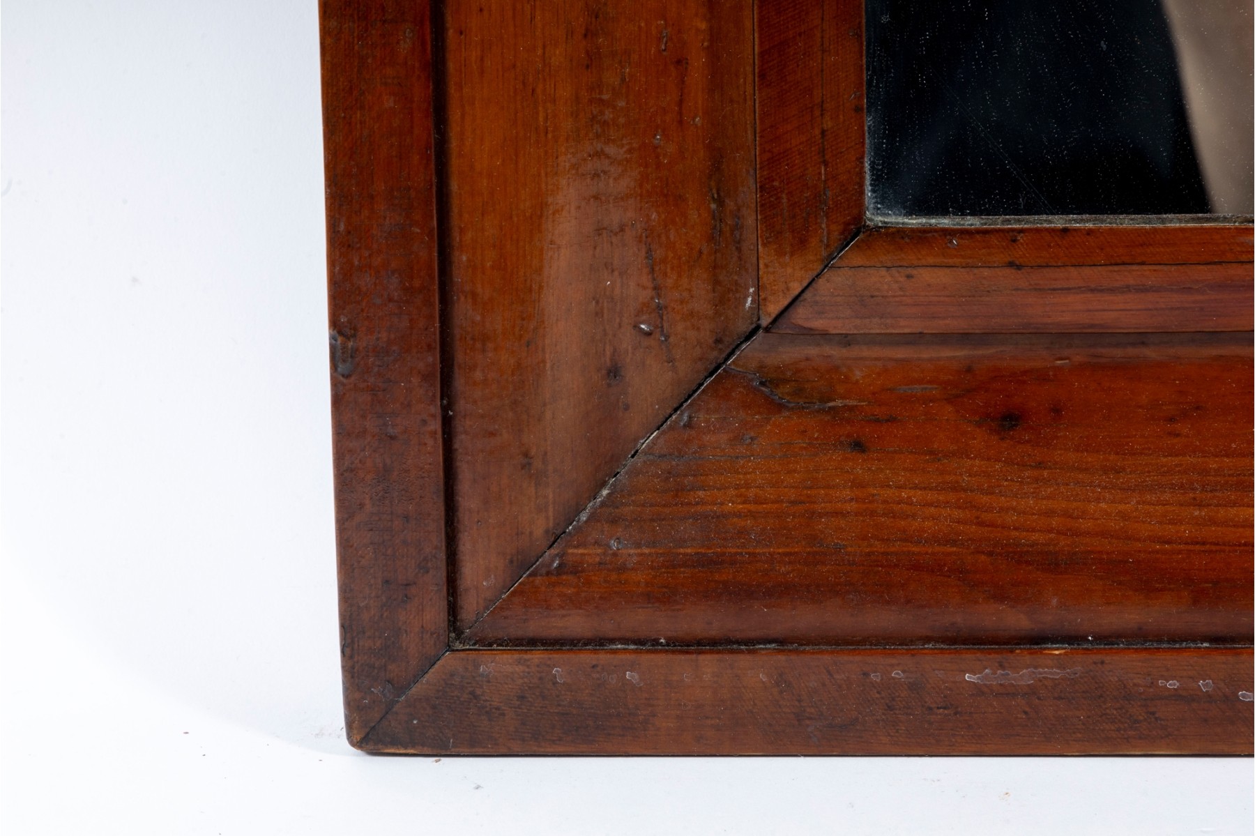 A stately and nicely aged mirror displaying a simple rectangular center in a gorgeous wood frame. The frame is simply beveled for a clean, elegant profile, stained in a rich red-brown finish.