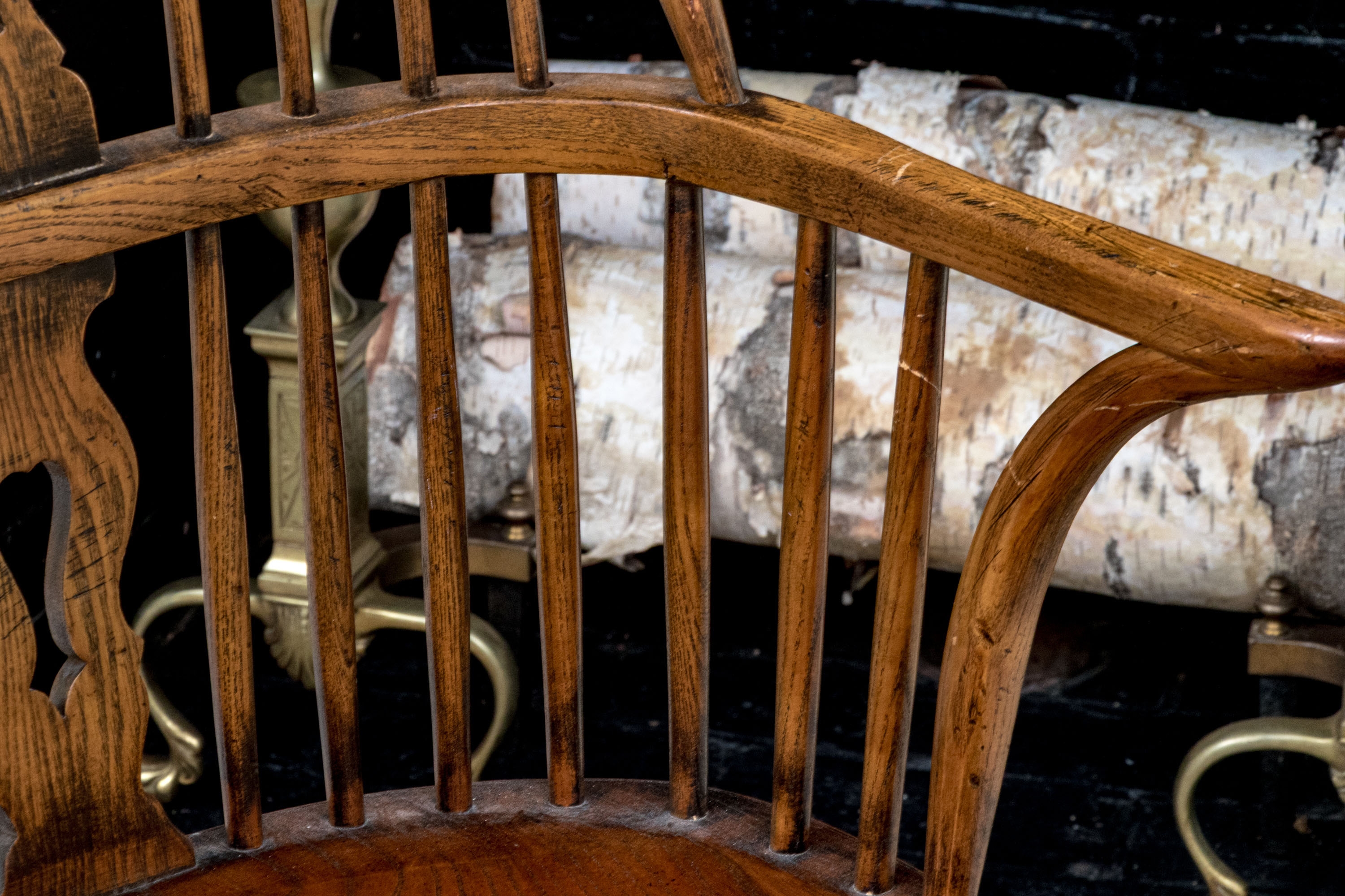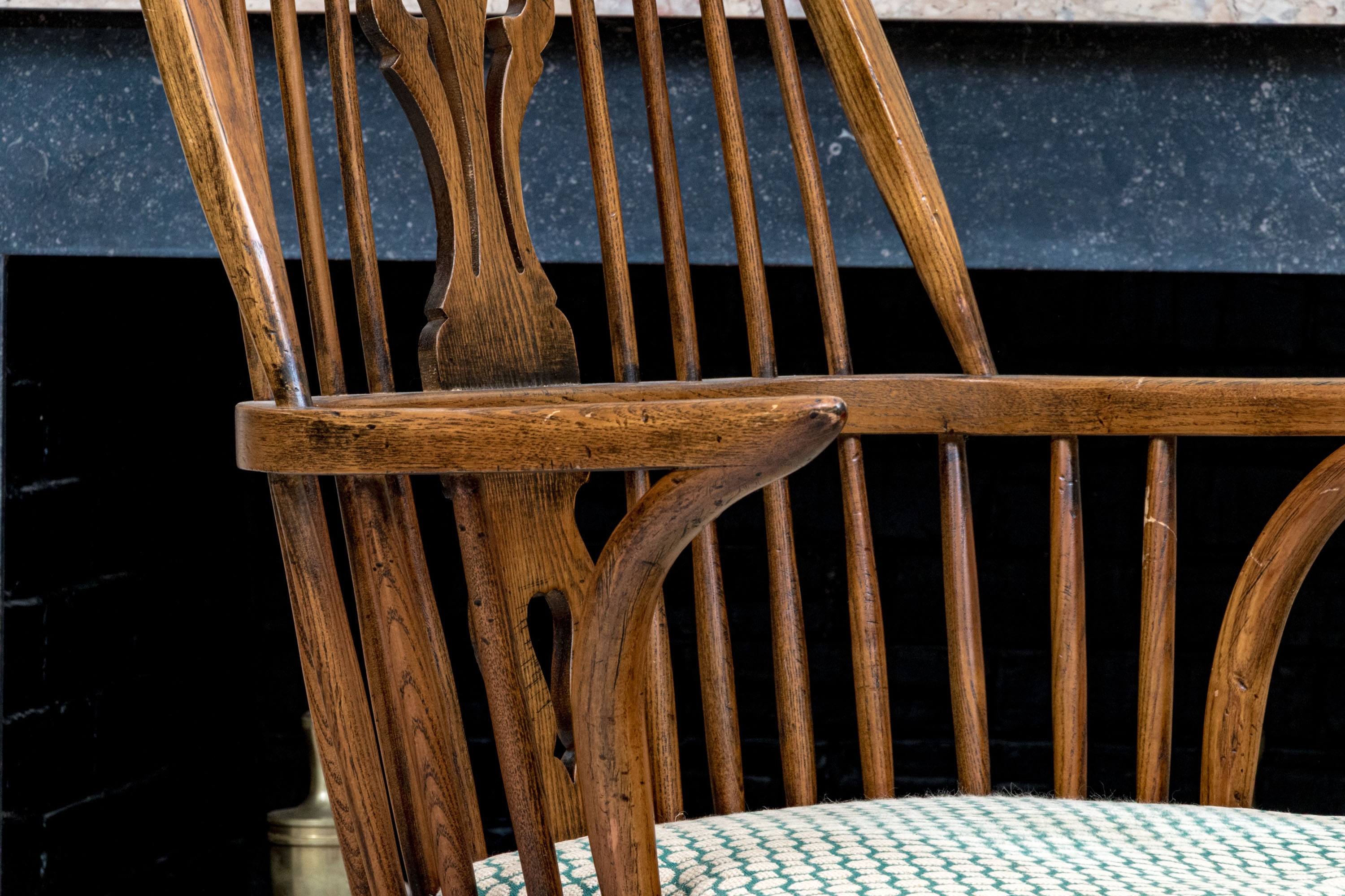 On four turned legs with horseshoe form stretcher and spindle back with arm rail wrapped around and spindles above to the top rail with pierced back splat.