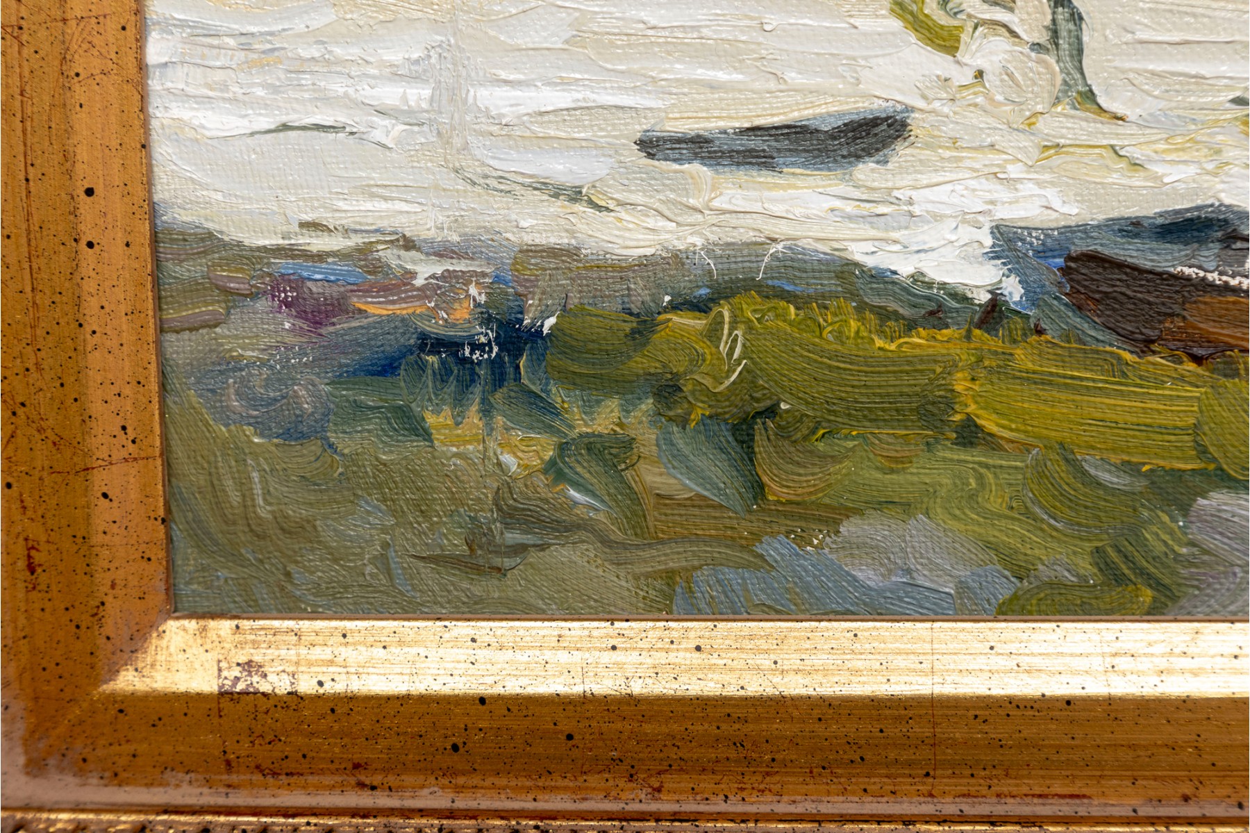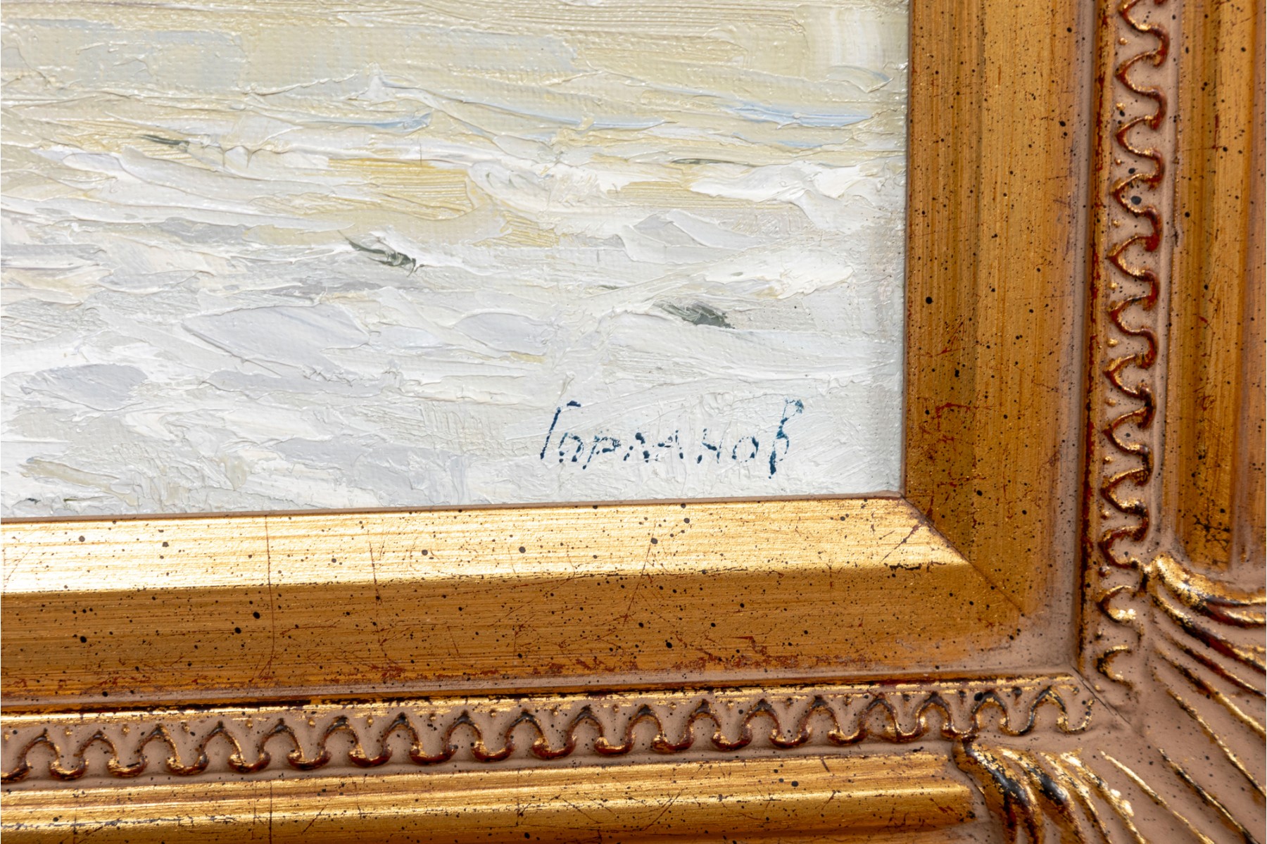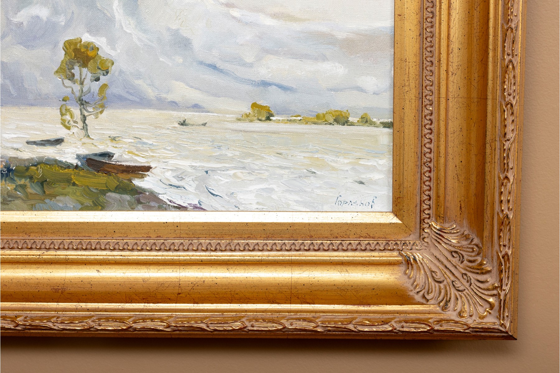 Nikolai Gorlanov (B. 1957) "Winter Etude", dated 2004 oil on canvas painting, impressionism landscape art. The piece is presented openly and displayed in a grand gilt-wood frame rich in carved foliates.