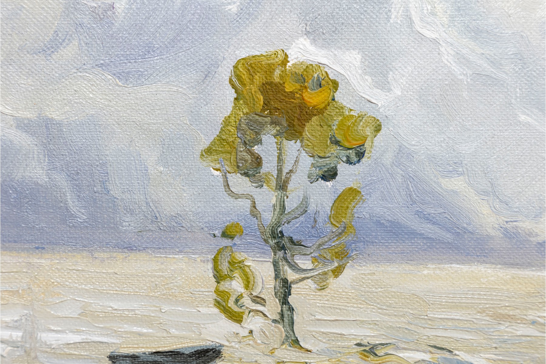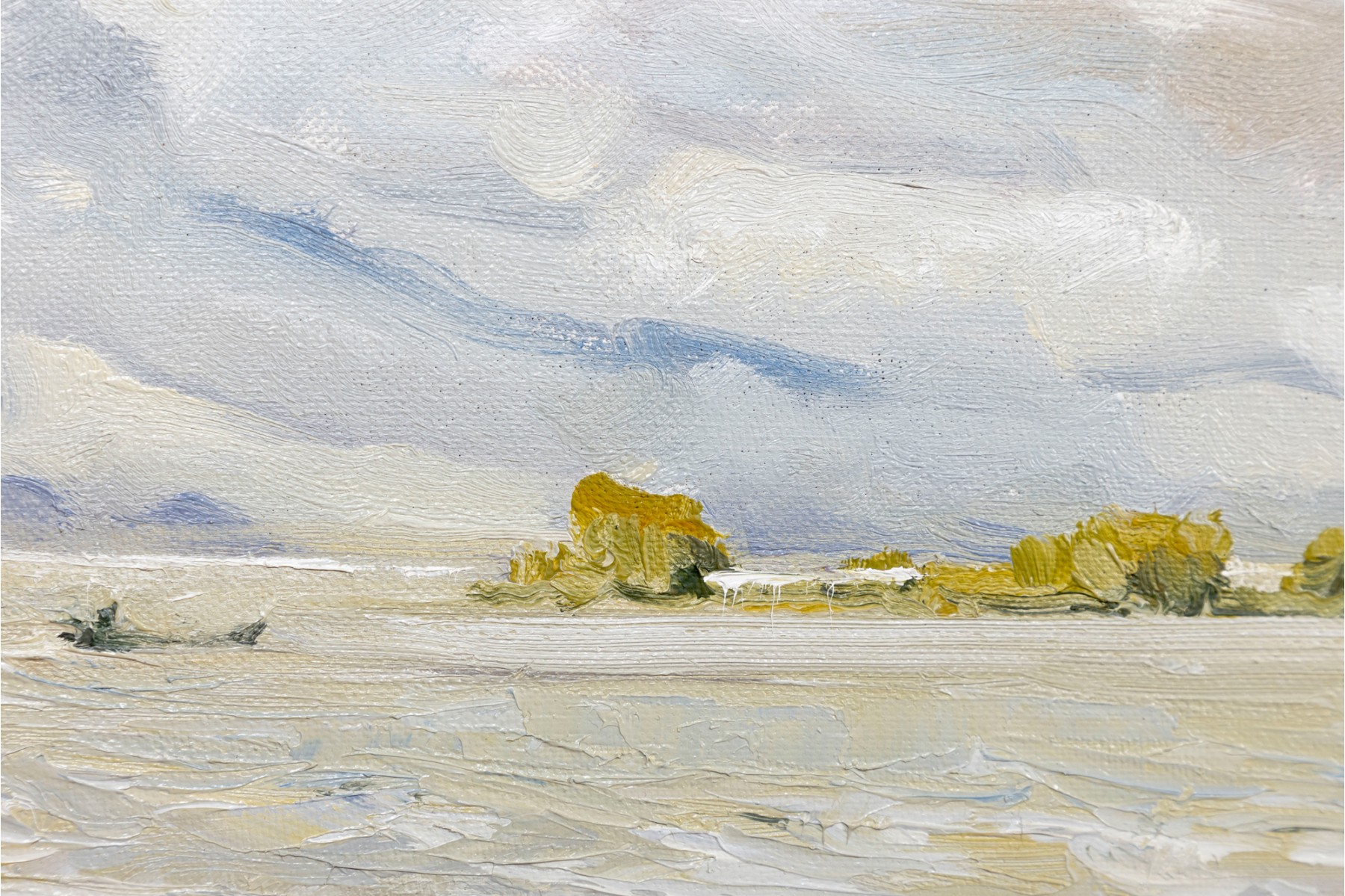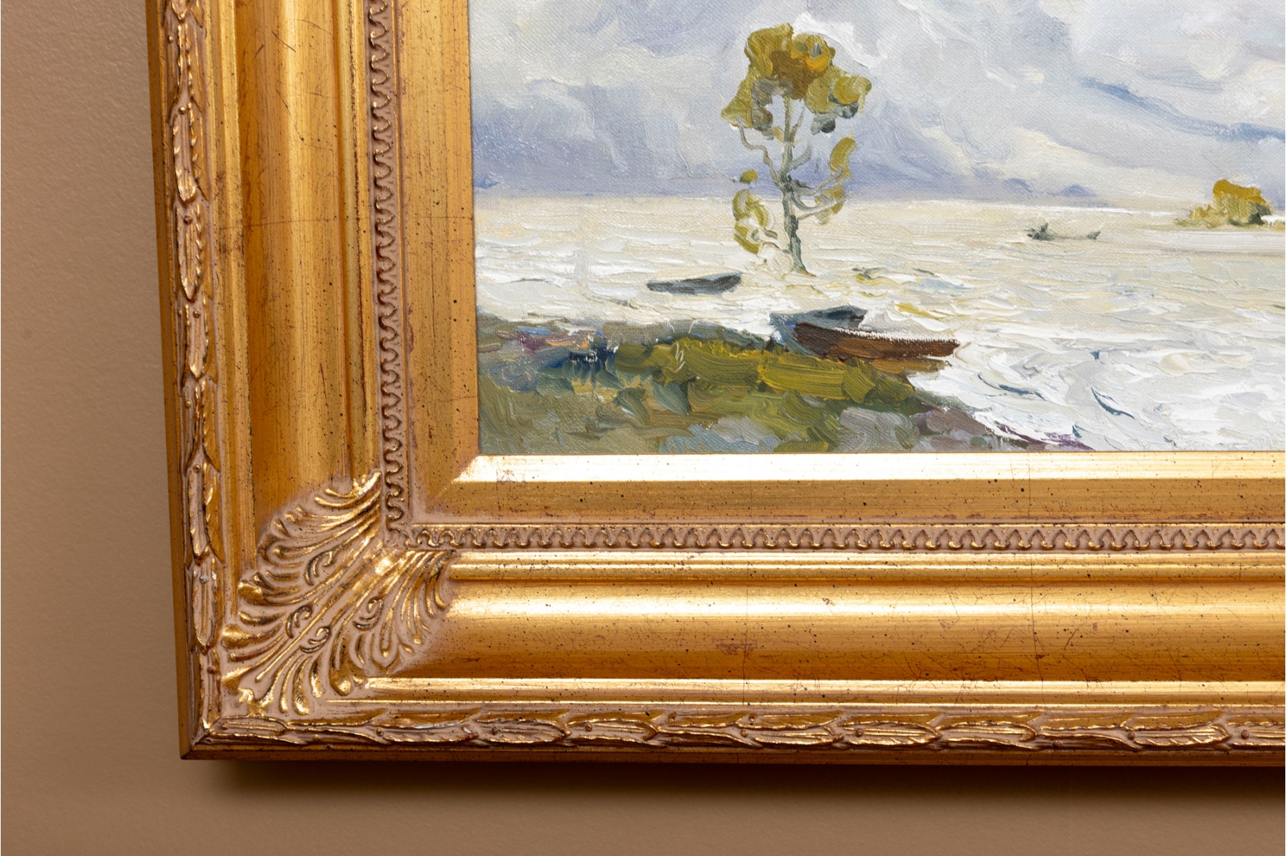 Nikolai Gorlanov (B. 1957) "Winter Etude", dated 2004 oil on canvas painting, impressionism landscape art. The piece is presented openly and displayed in a grand gilt-wood frame rich in carved foliates.