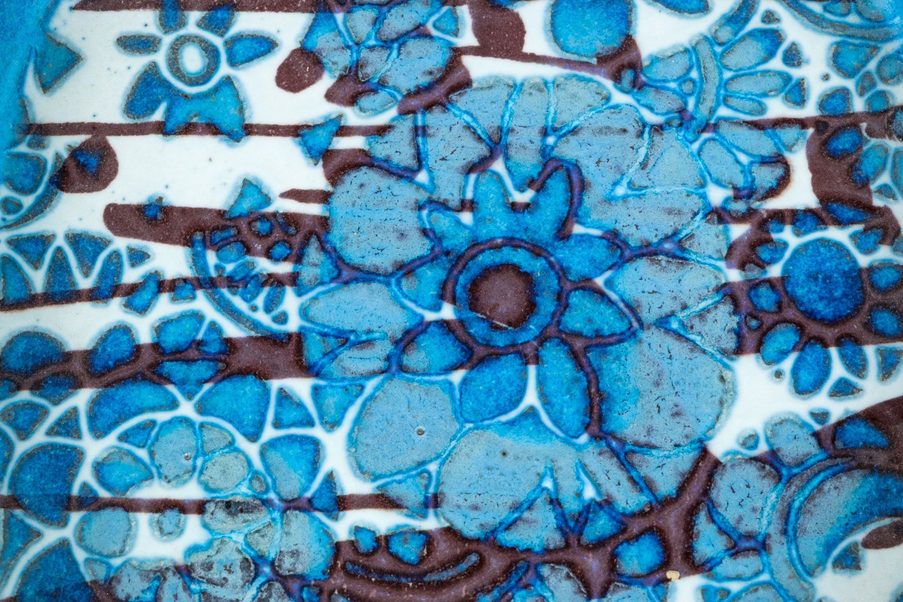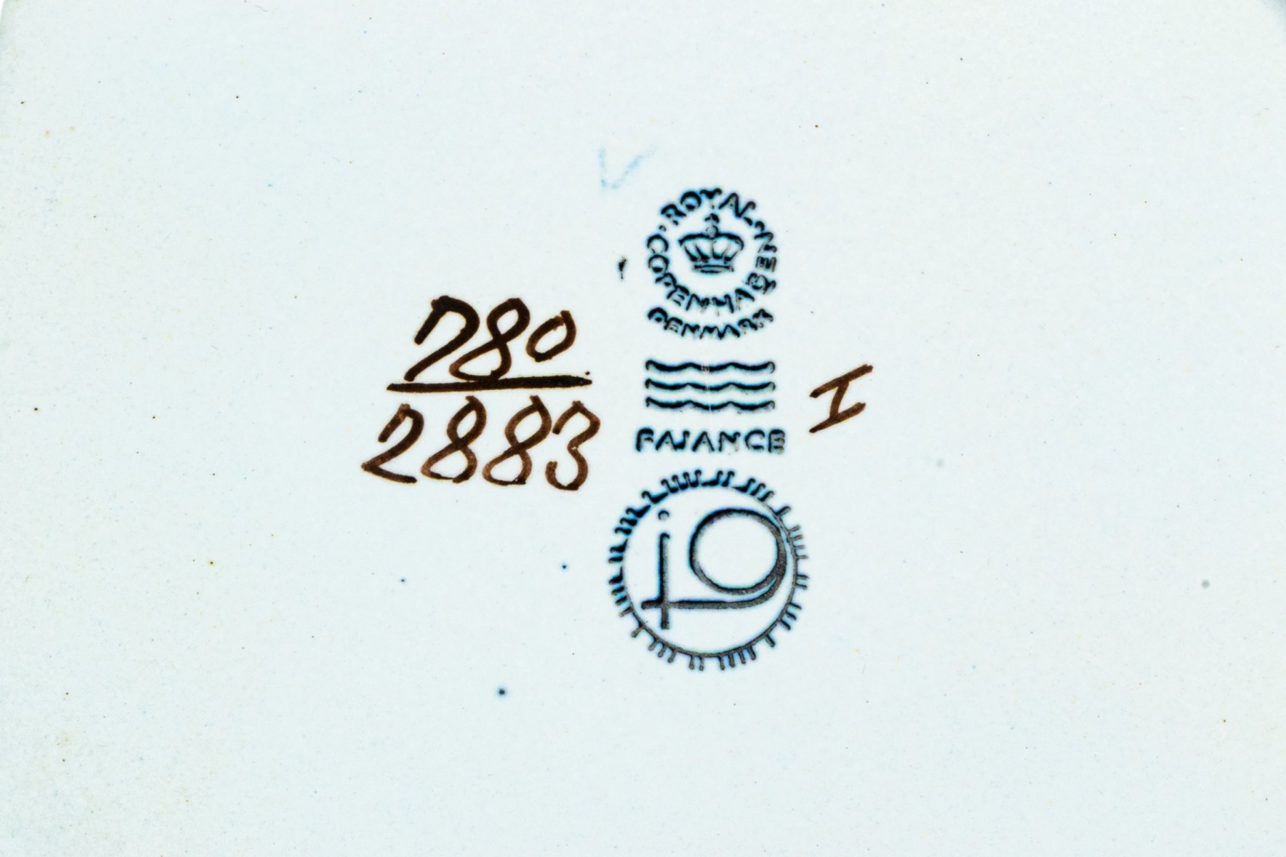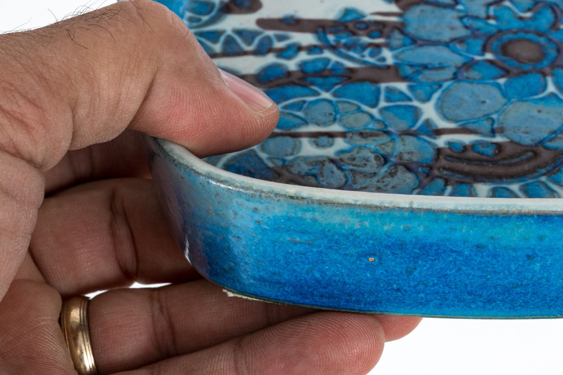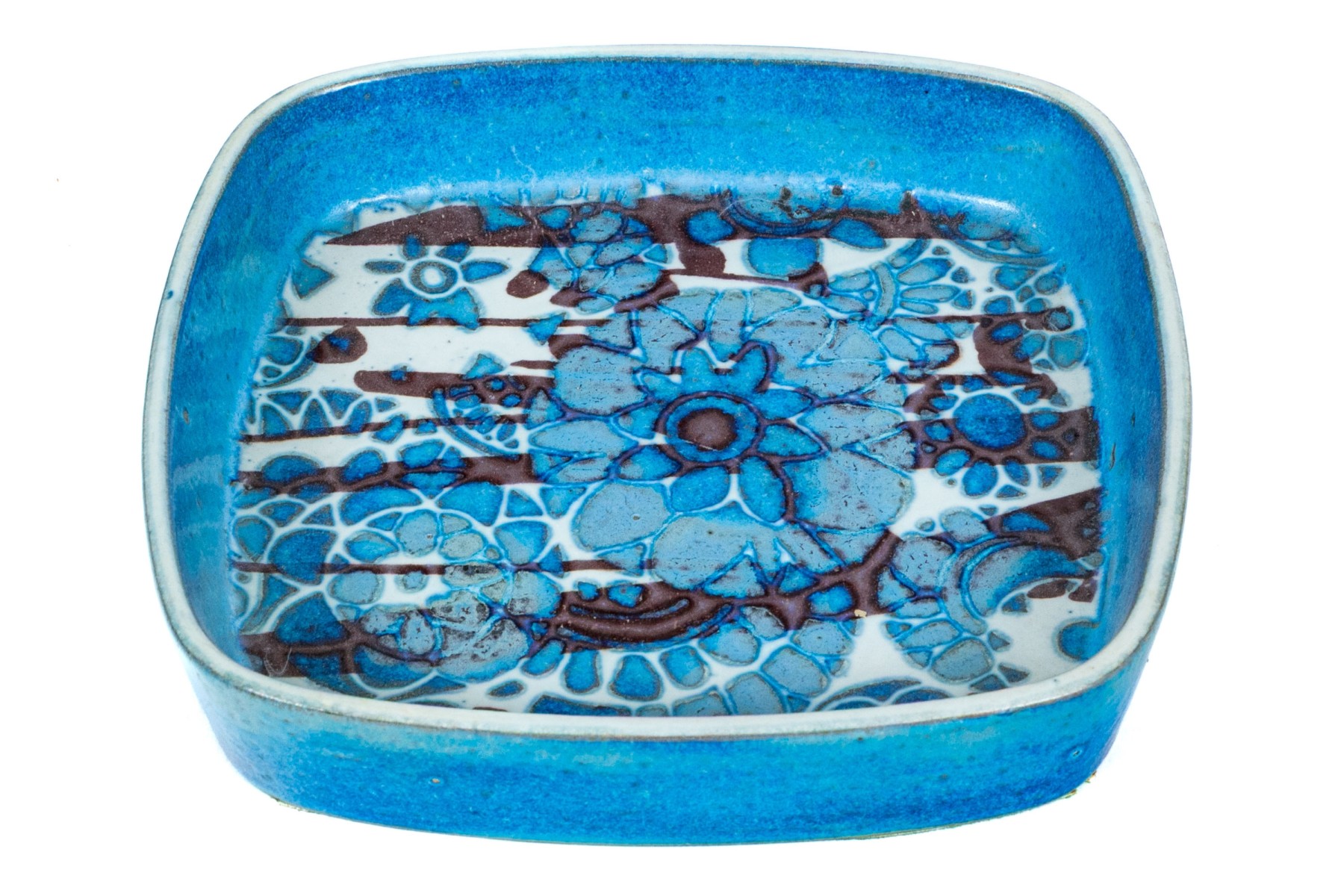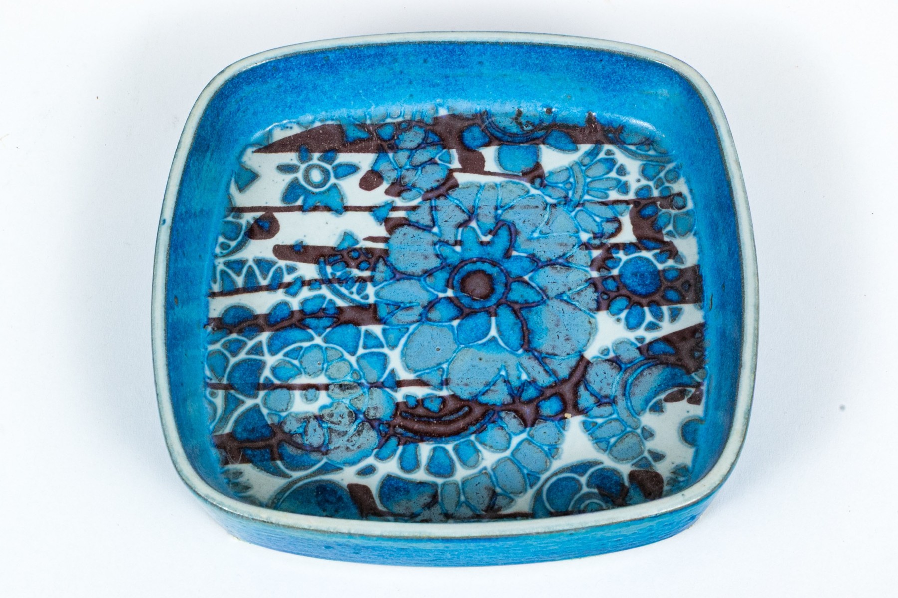 A wonderfully decorated Royal Copenhagen ceramic bowl in rounded square form decorated with blue and brown floral and tree trunk motifs. Marked underfoot.