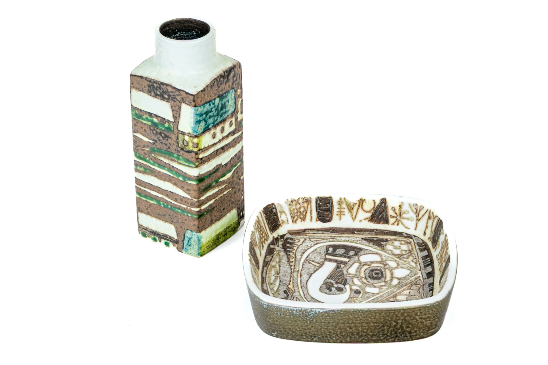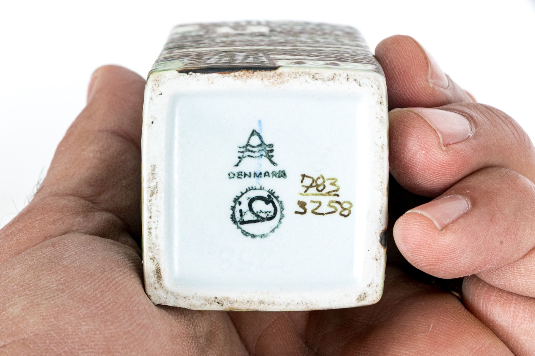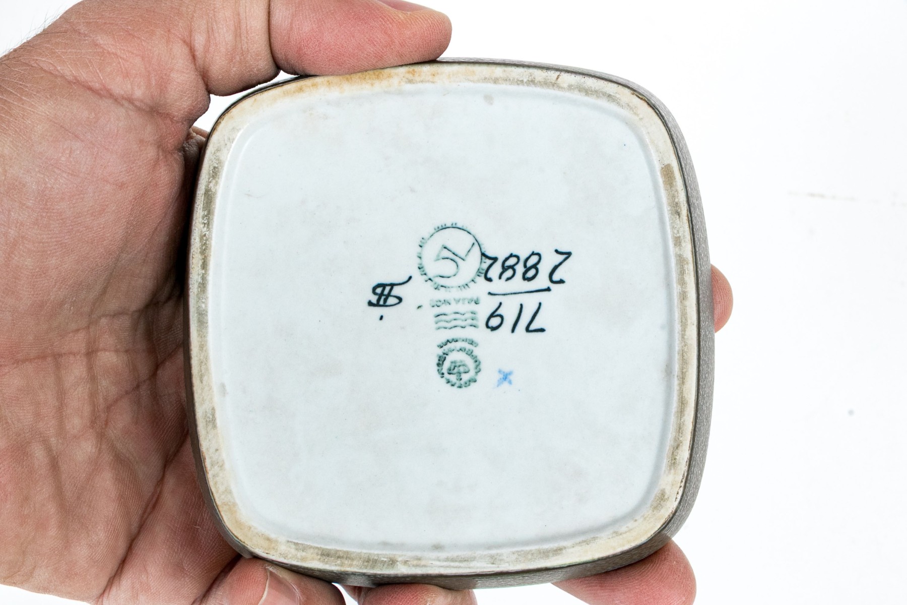 A charming duo of Royal Copenhagen ceramics comprised of a square diminutive bowl and diminutive vase. Both beautifully glazes in textural, earthy hues. Marked underfoot.