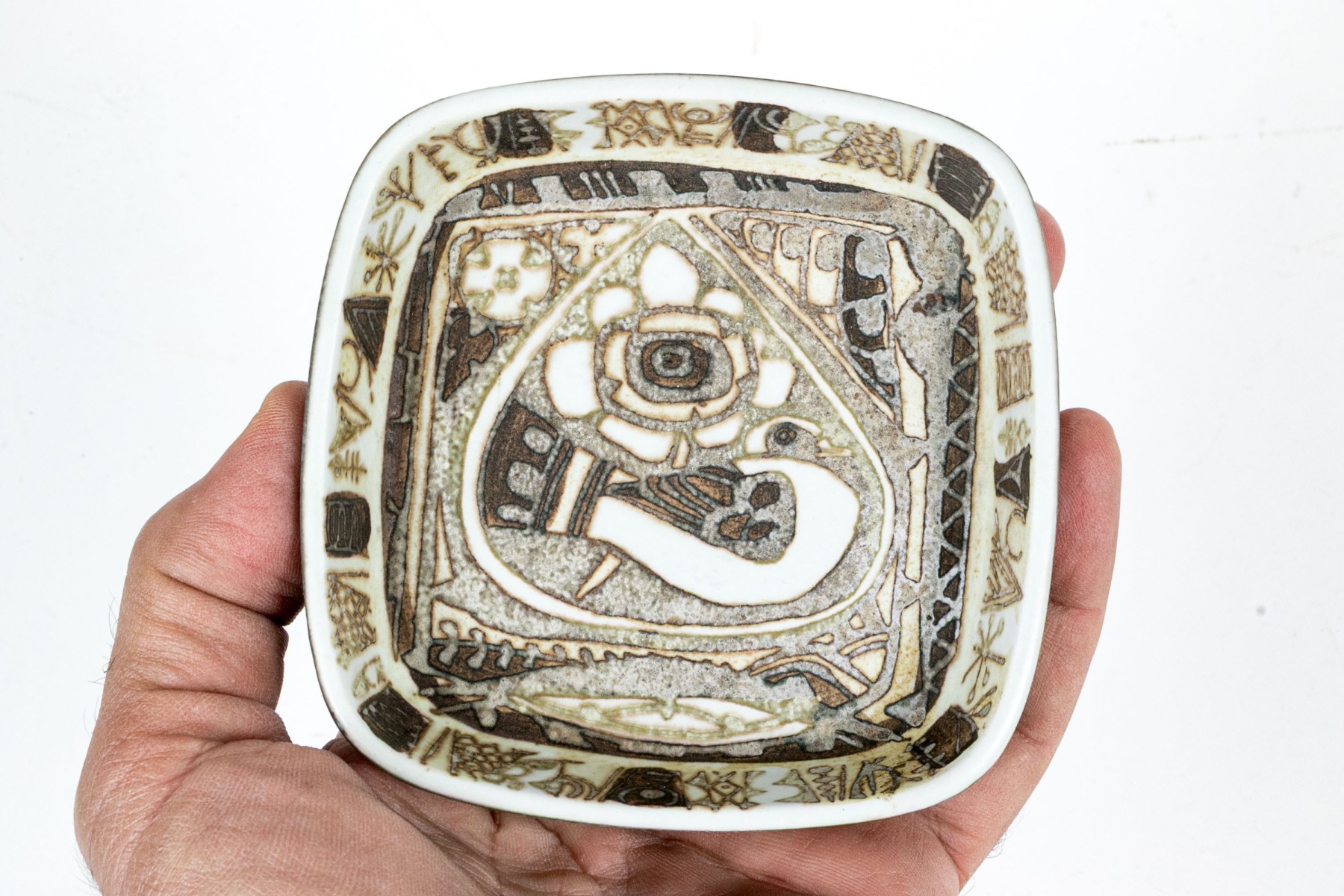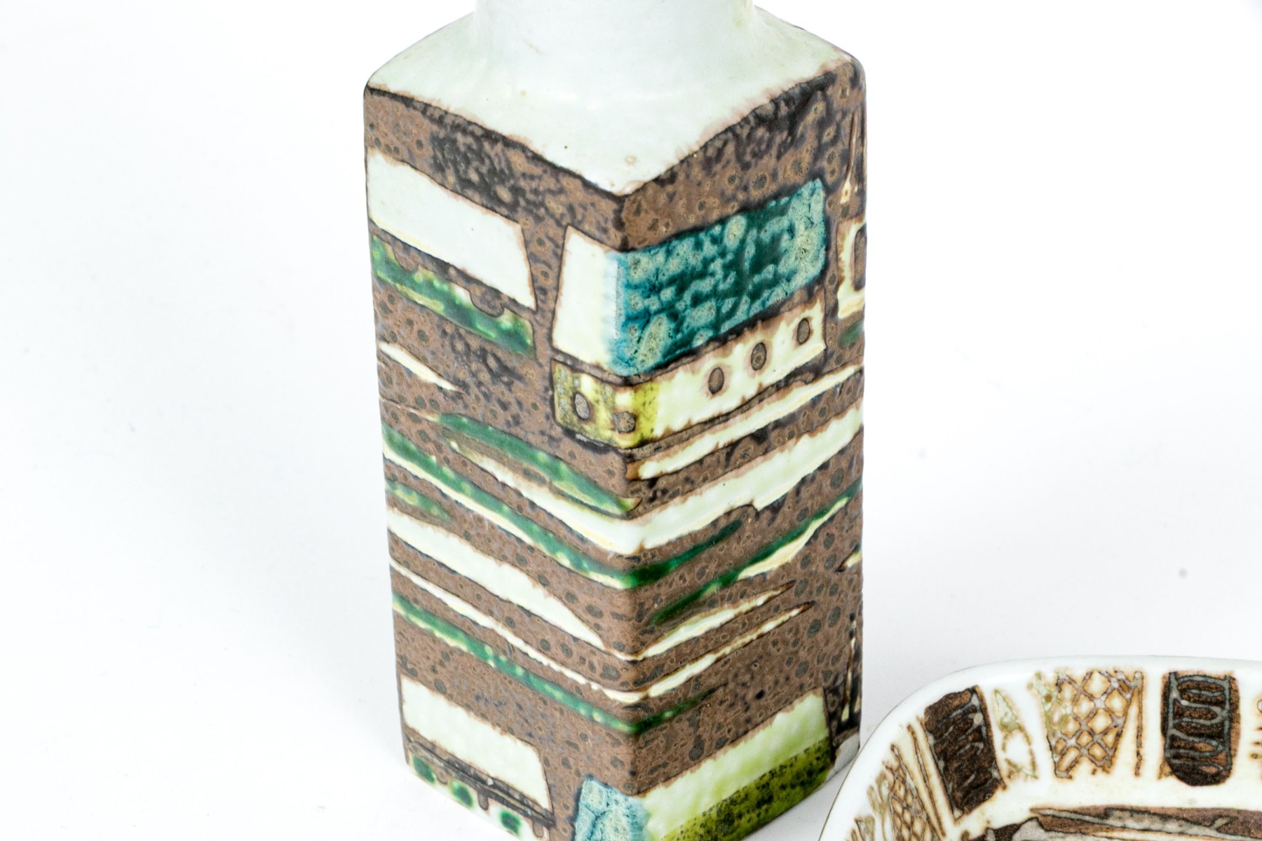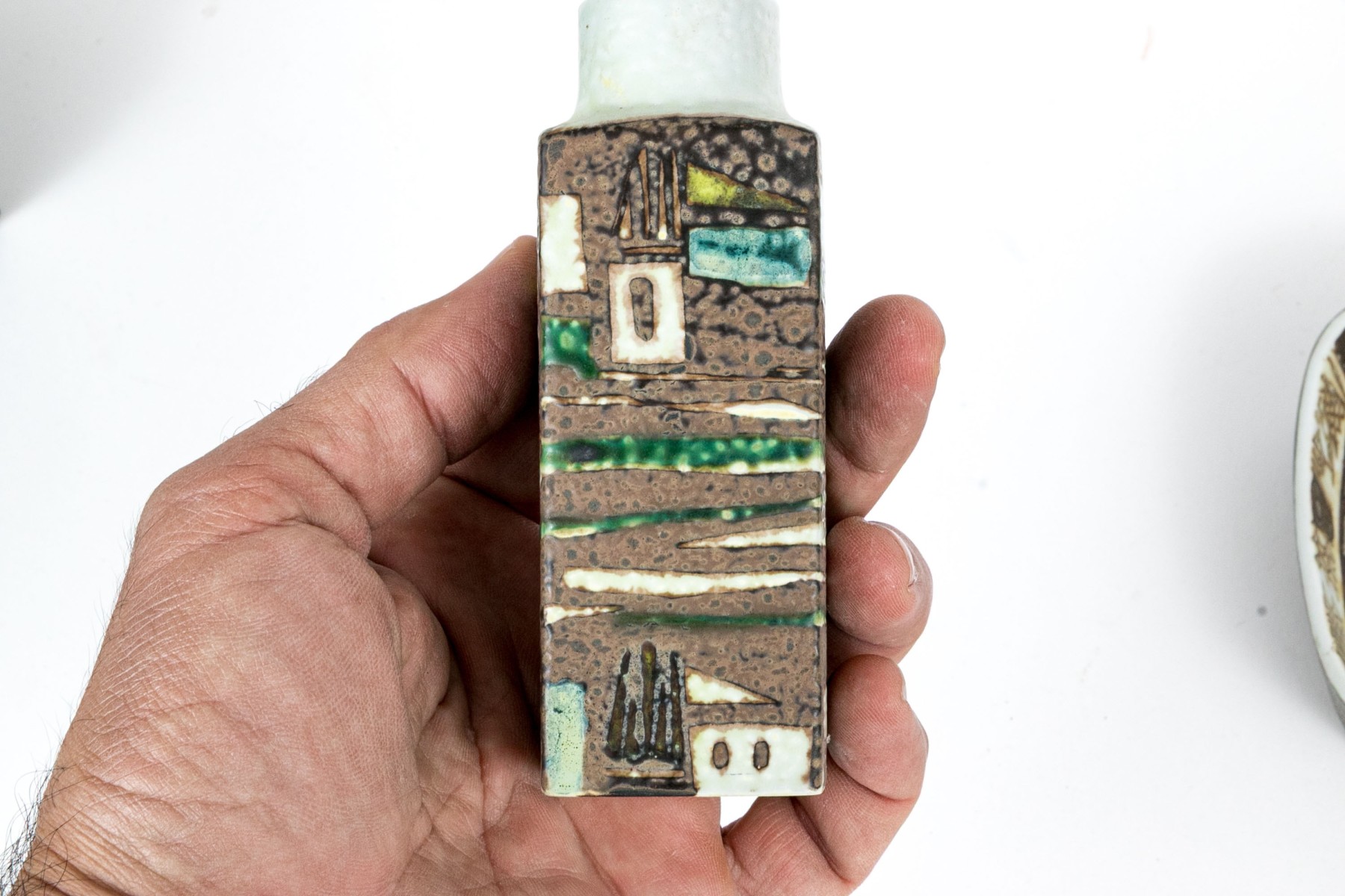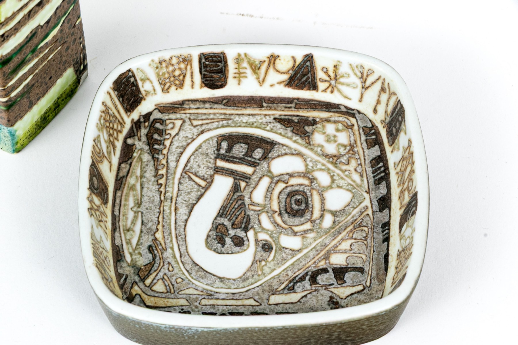 A charming duo of Royal Copenhagen ceramics comprised of a square diminutive bowl and diminutive vase. Both beautifully glazes in textural, earthy hues. Marked underfoot.