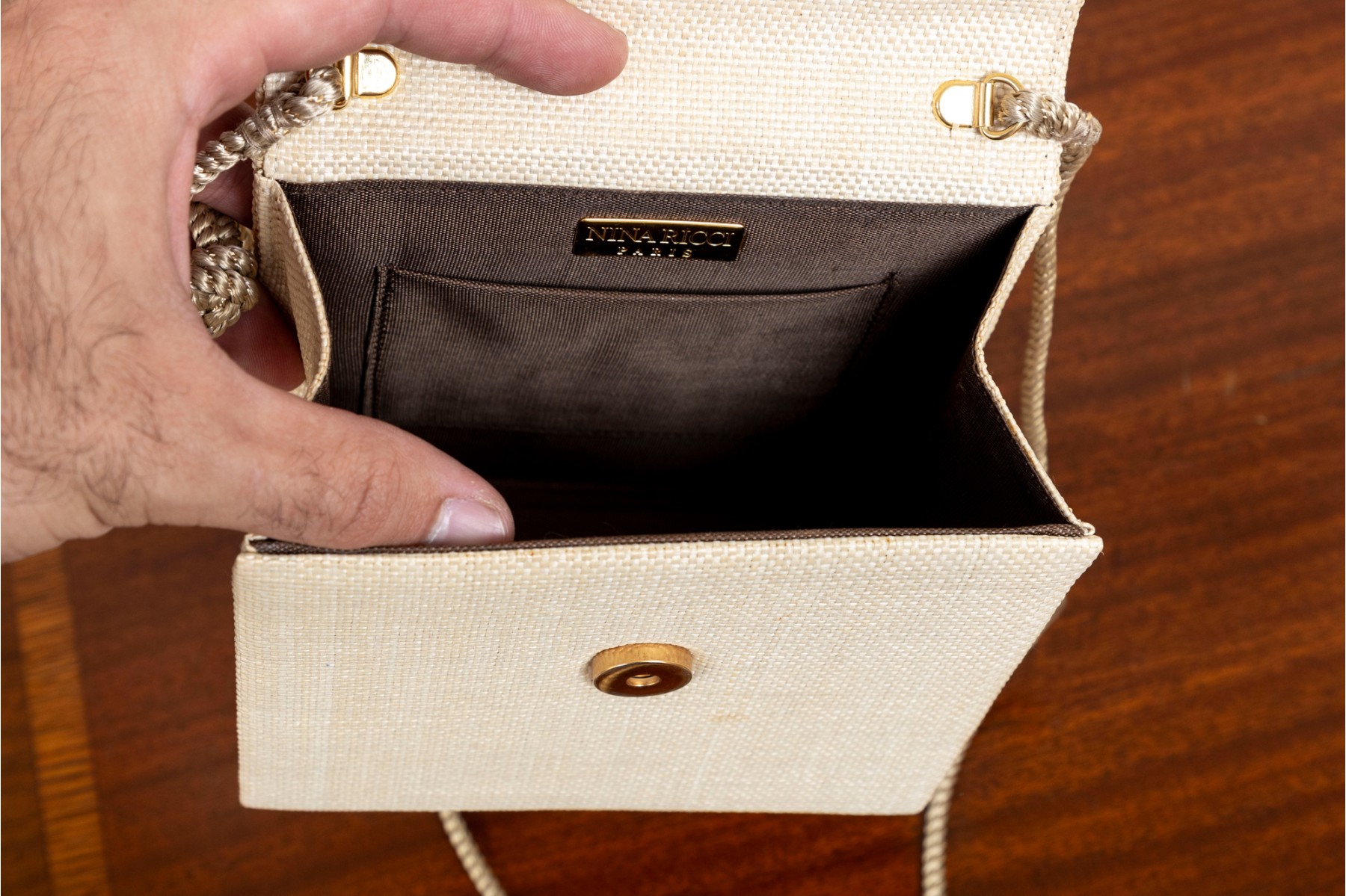 An adorable Nina Ricci pochette clutch in cream fabric, featuring an envelope flap closure with a pierced gilt logo adornment. Lined in dark brown with an open interior pocket and finished with a cord strap.