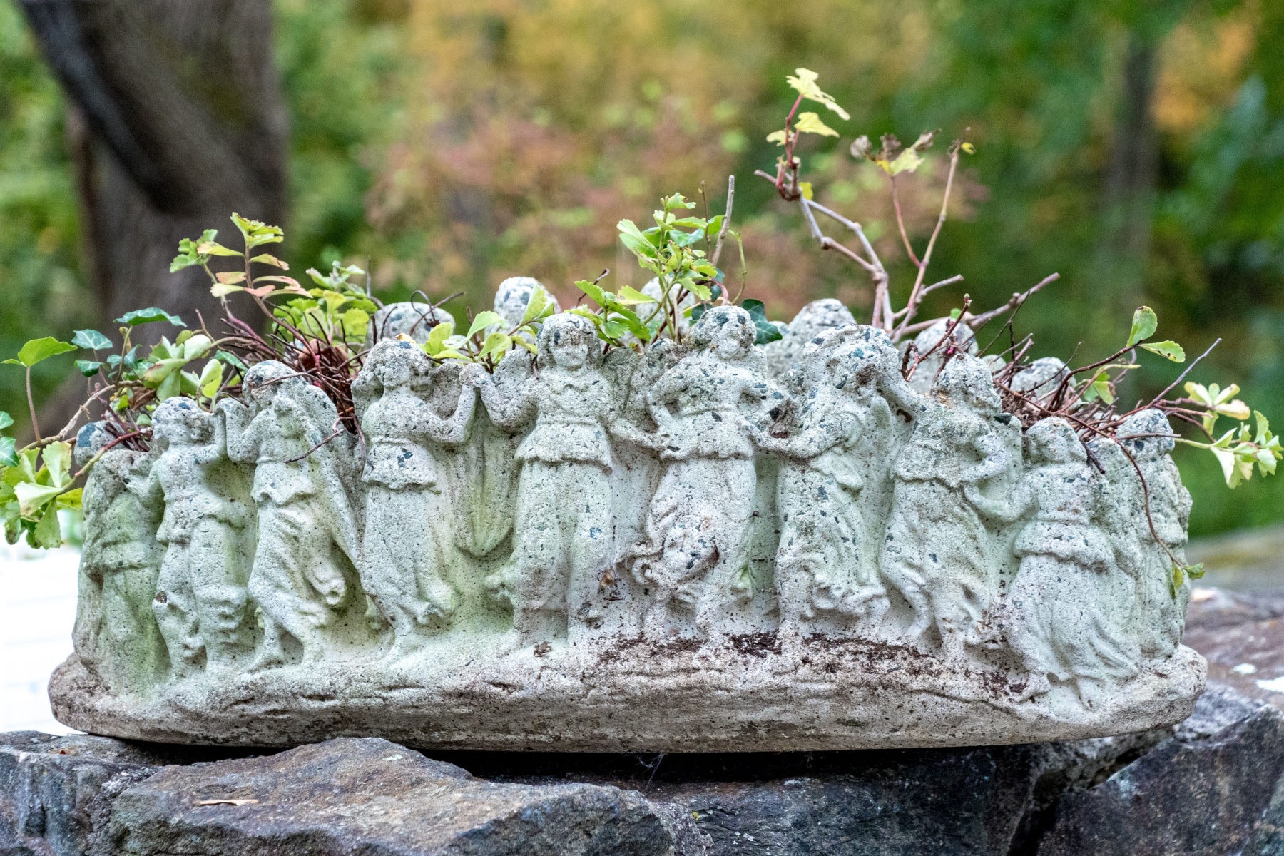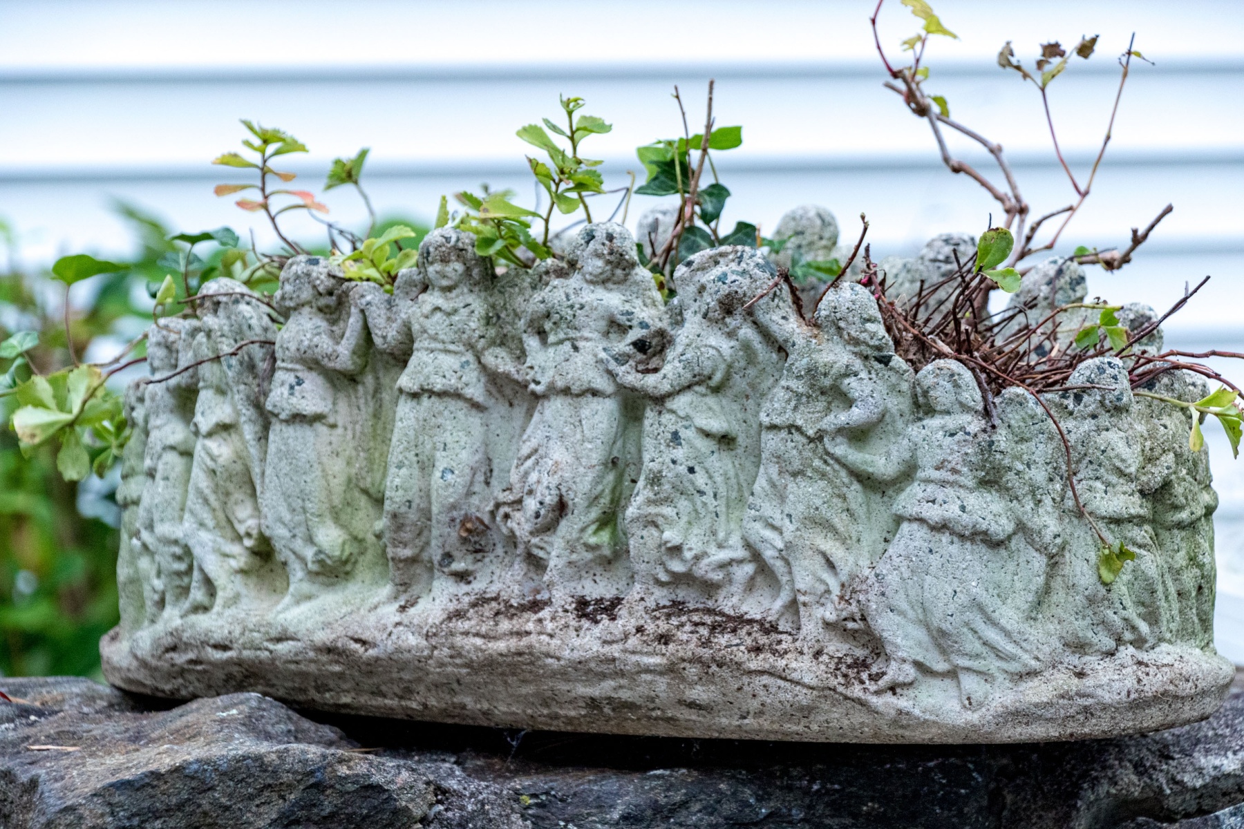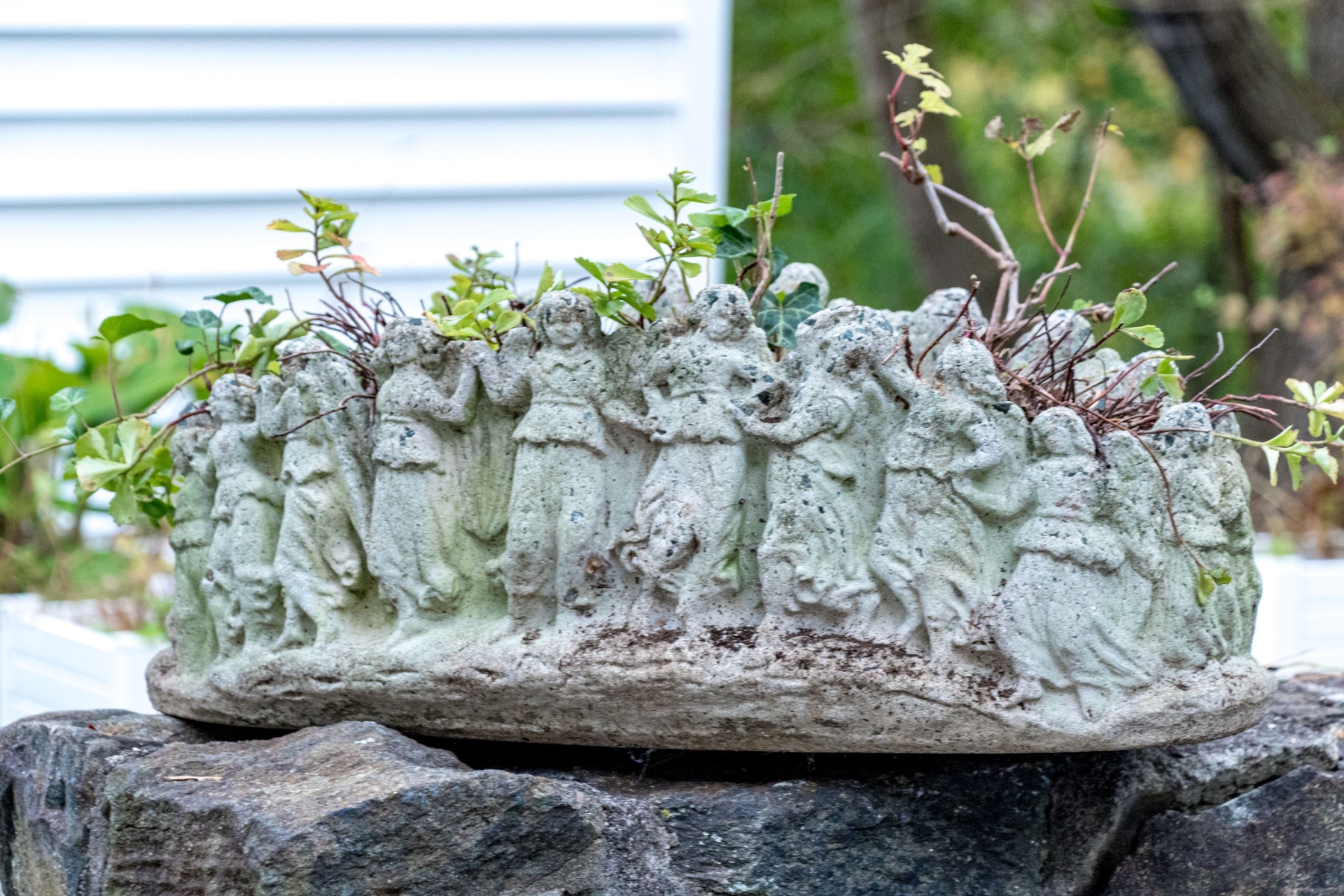 A charming Nina Studios cast stone garden planter depicting a group of women dancing around the round perimeter.