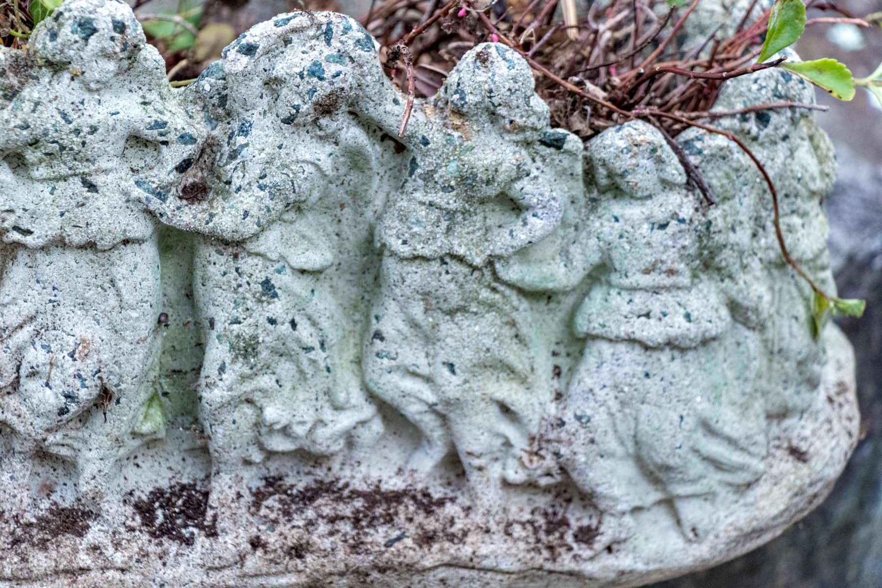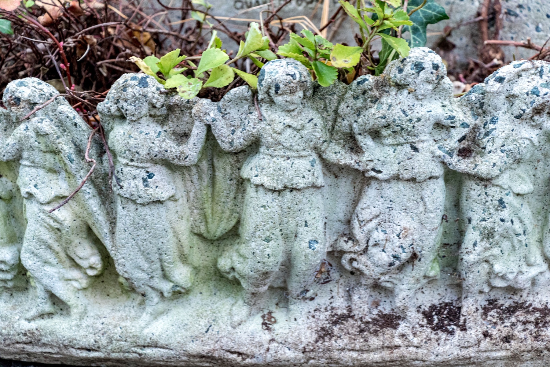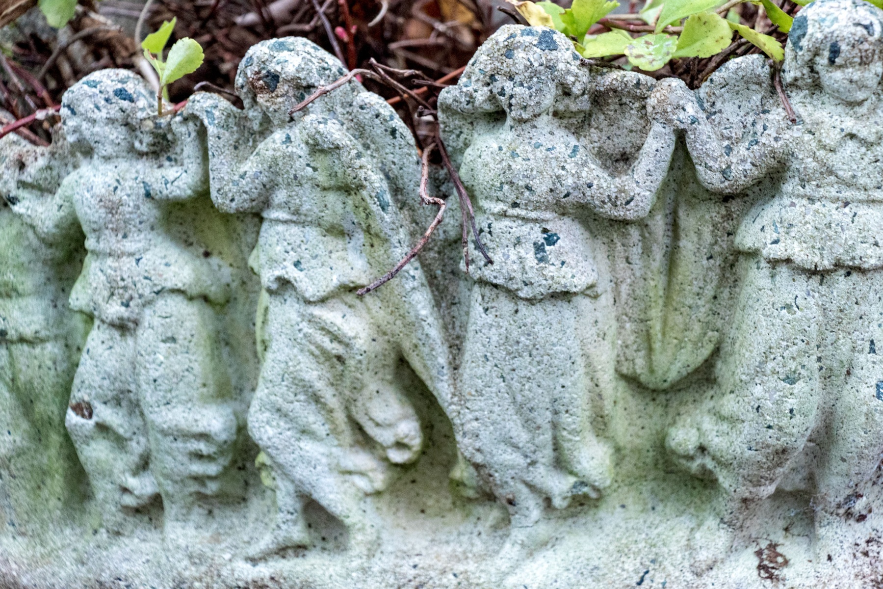 A charming Nina Studios cast stone garden planter depicting a group of women dancing around the round perimeter.