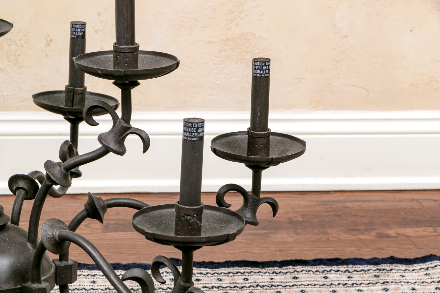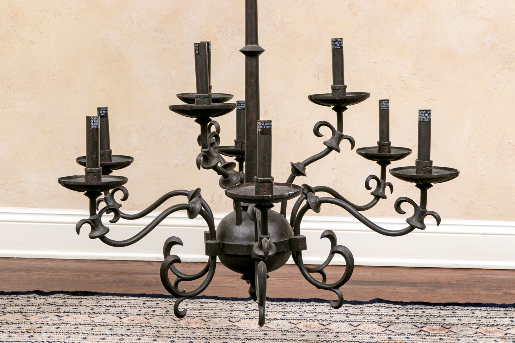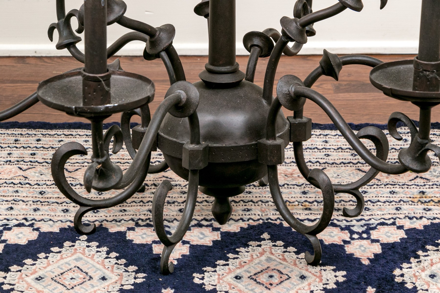 A black iron chandelier with two tiers of 9 lights with scrolled arms and dish shaped bobeches. The arms are mounted on a globe with a short shaped terminal. The top of the stands with scrolled details and a long chain with ceiling plate.