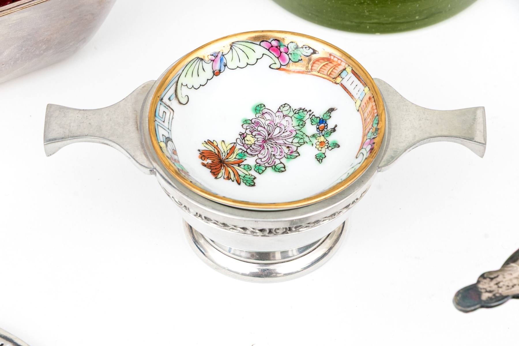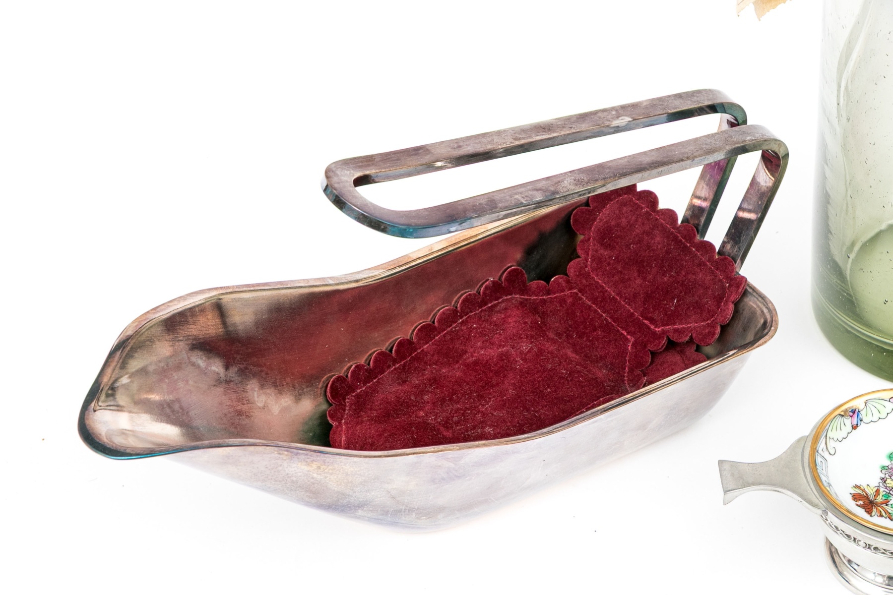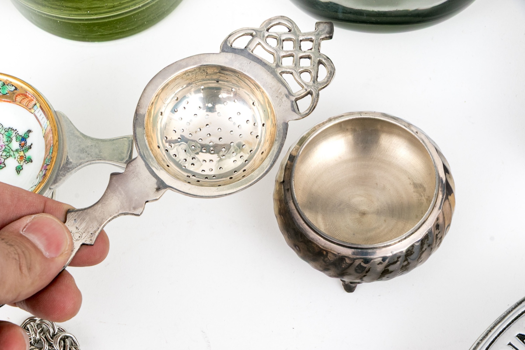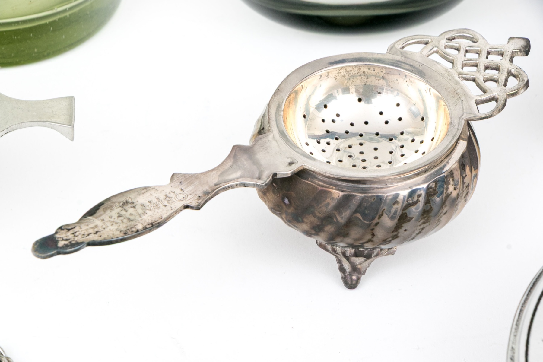 Comprised of wine bottle coaster, trivet with grape cluster motif, tasting cups, strainer, wine bottle caddy, vintage glass wine bottle with paper label and glass decanter with stopper.