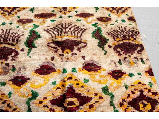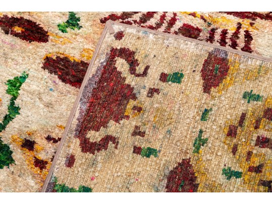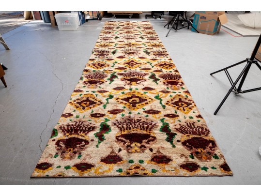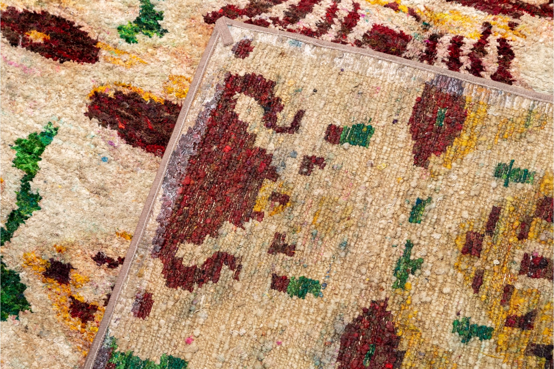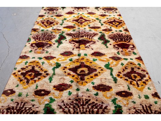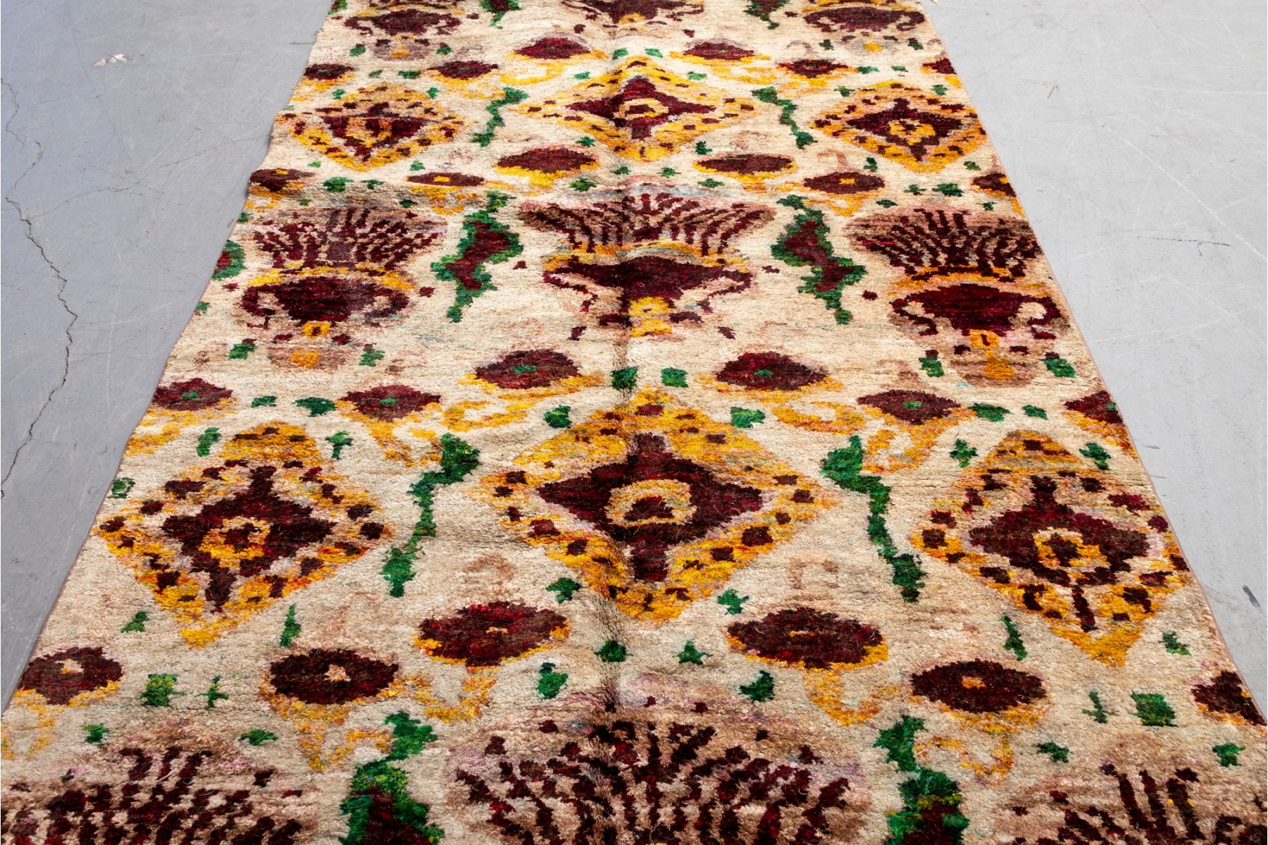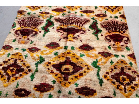 An extra-large silk runner rug from NOA Living featuring a traditional geometric and floral pattern. The cream background is accented with symmetrical motifs in shades of green, red, and yellow. The design is reminiscent of tribal or Berber styles, offering a bold yet earthy aesthetic.