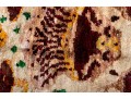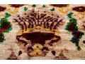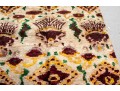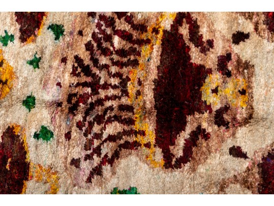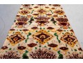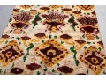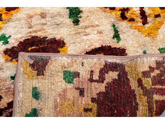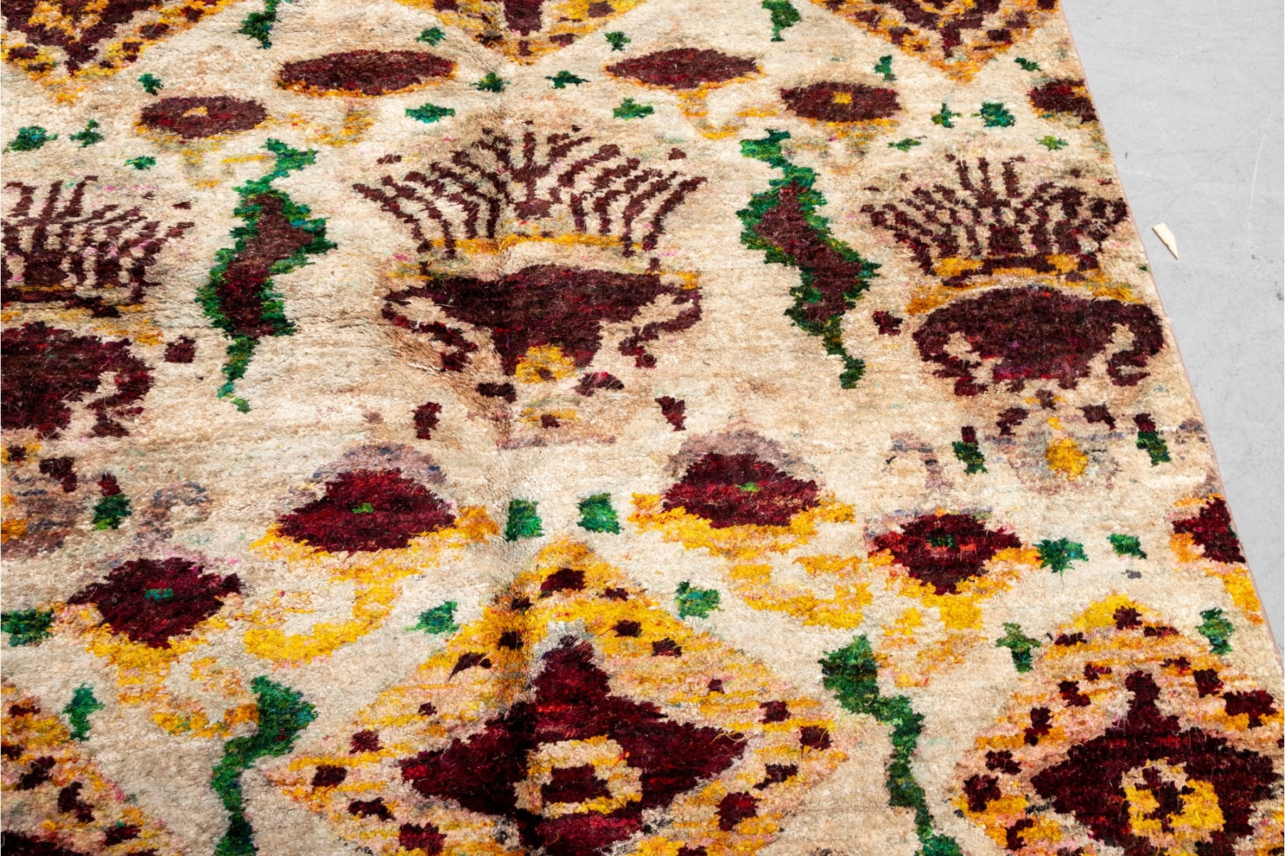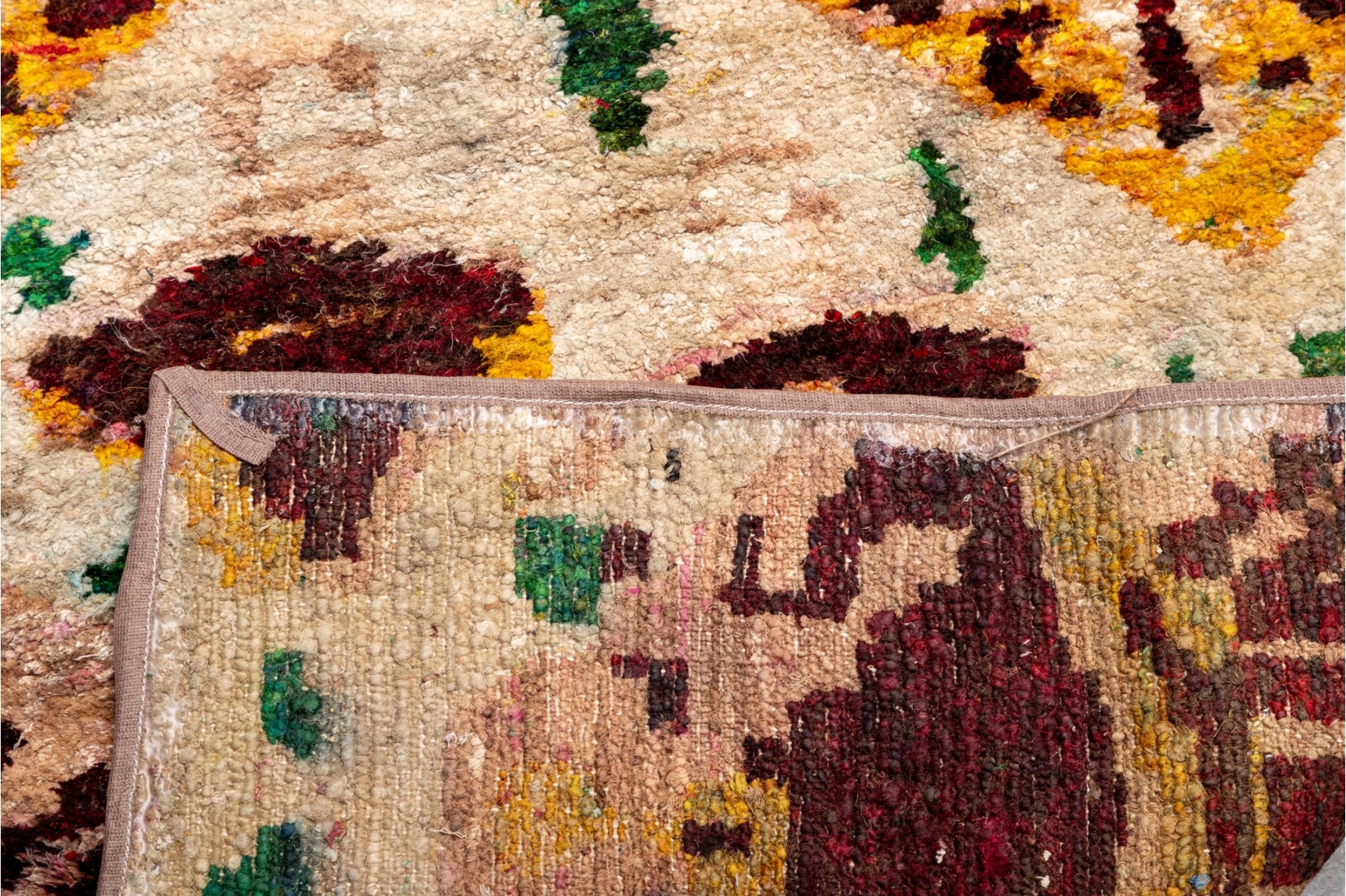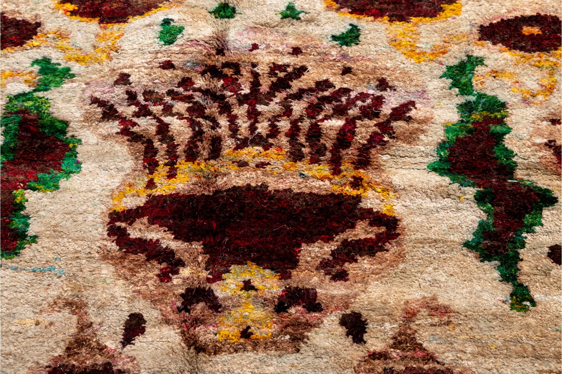 An extra-large silk runner rug from NOA Living featuring a traditional geometric and floral pattern. The cream background is accented with symmetrical motifs in shades of green, red, and yellow. The design is reminiscent of tribal or Berber styles, offering a bold yet earthy aesthetic.
