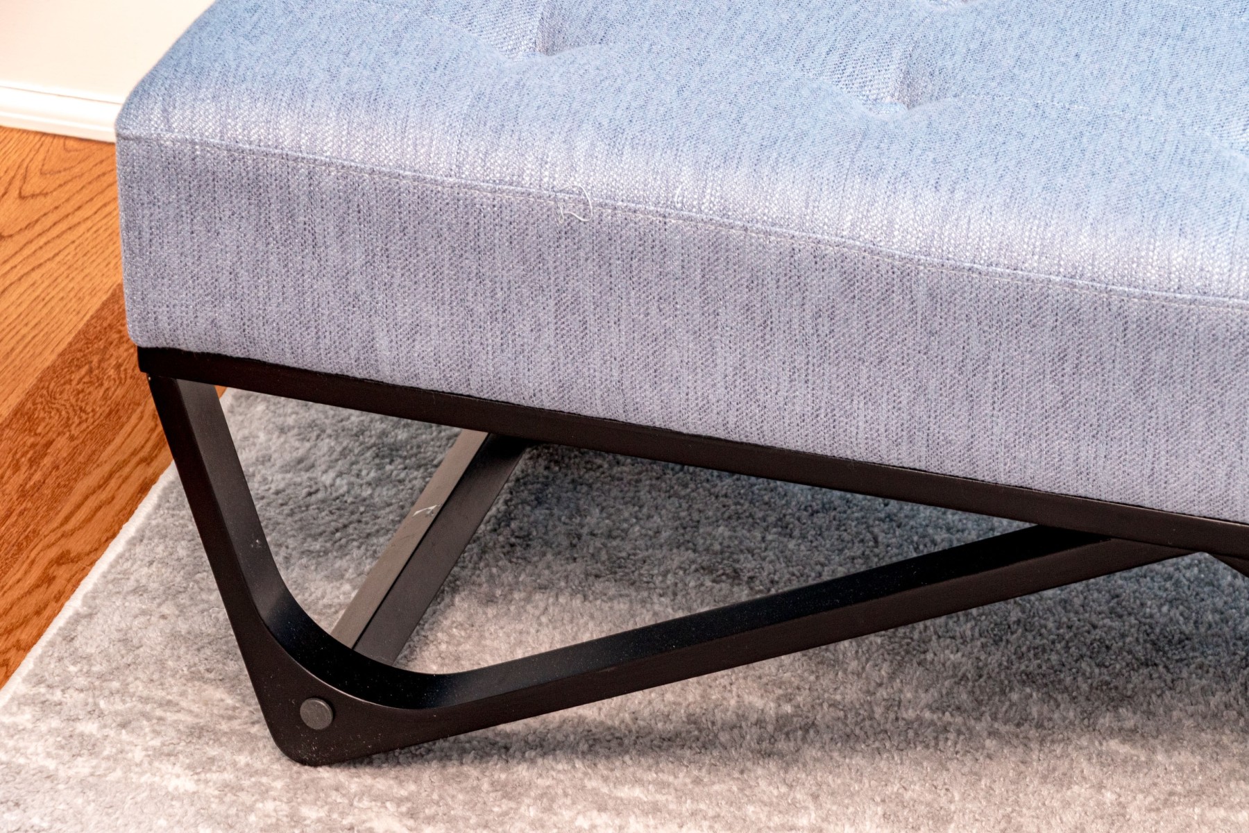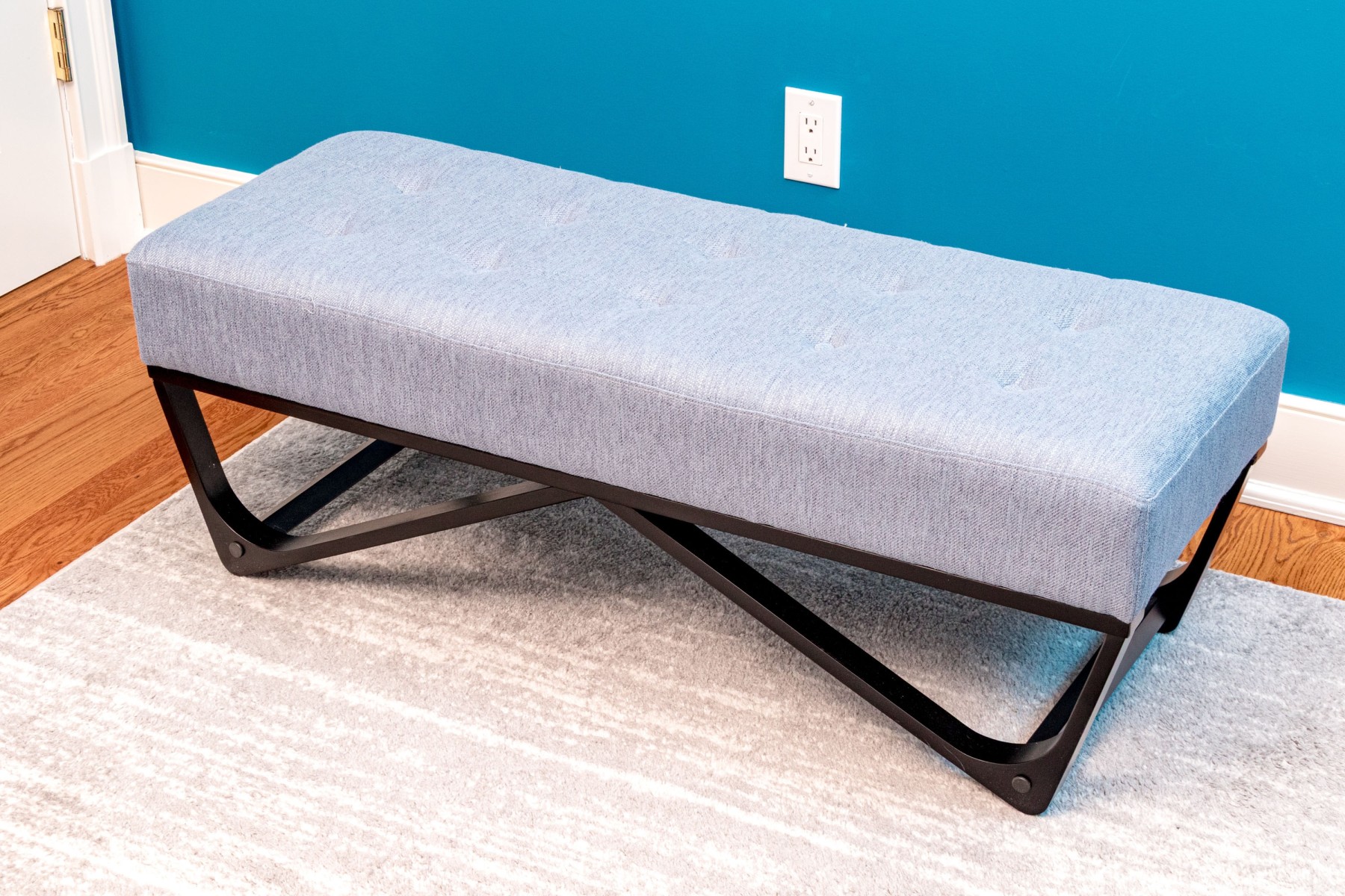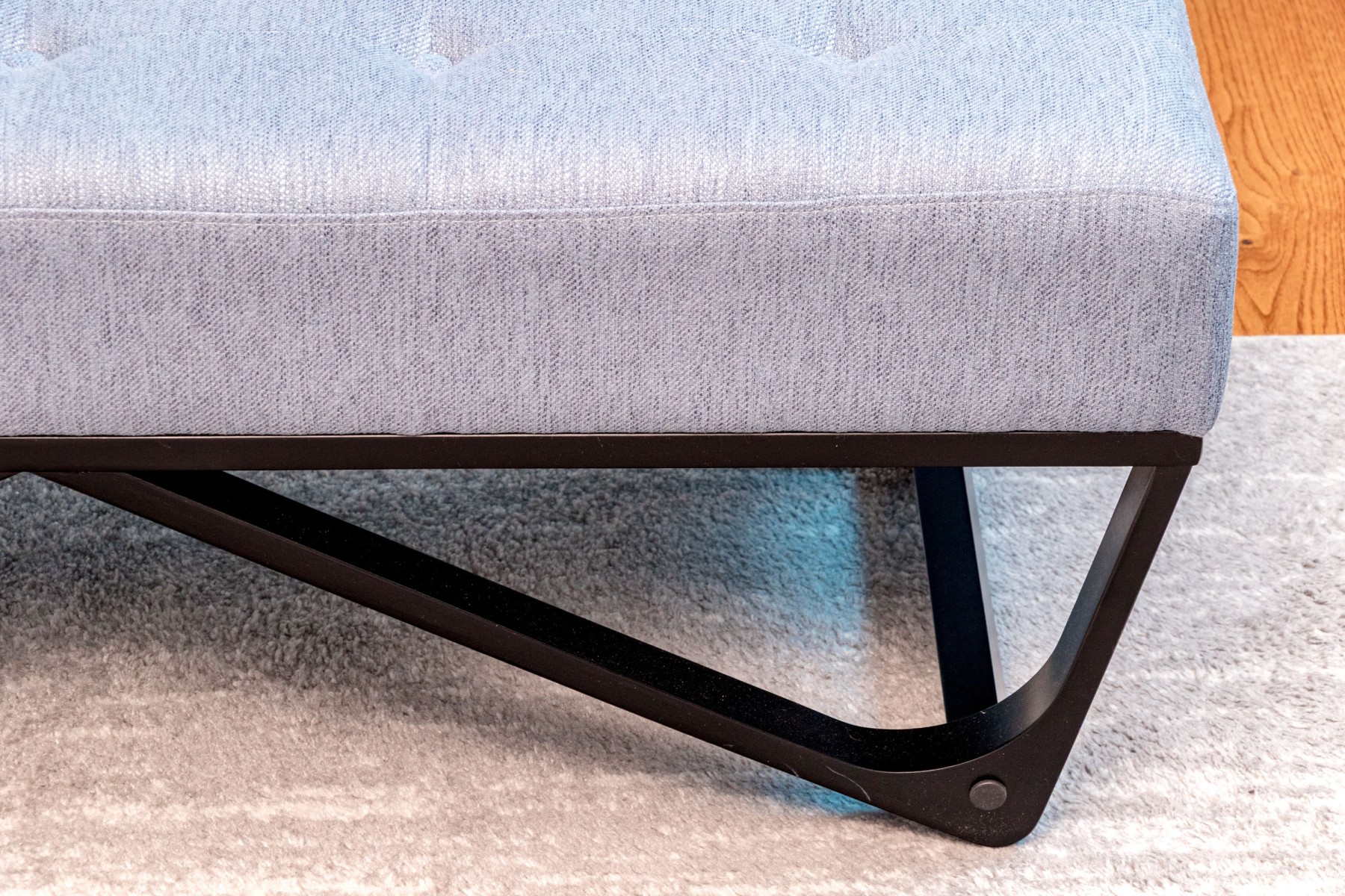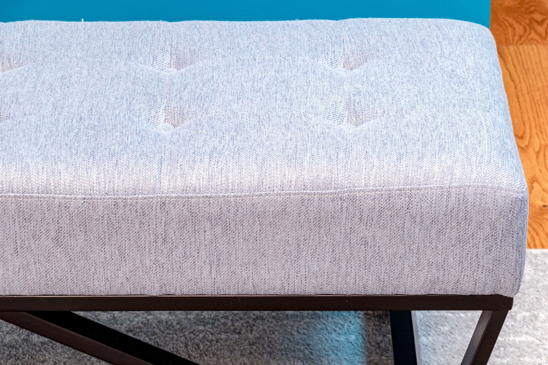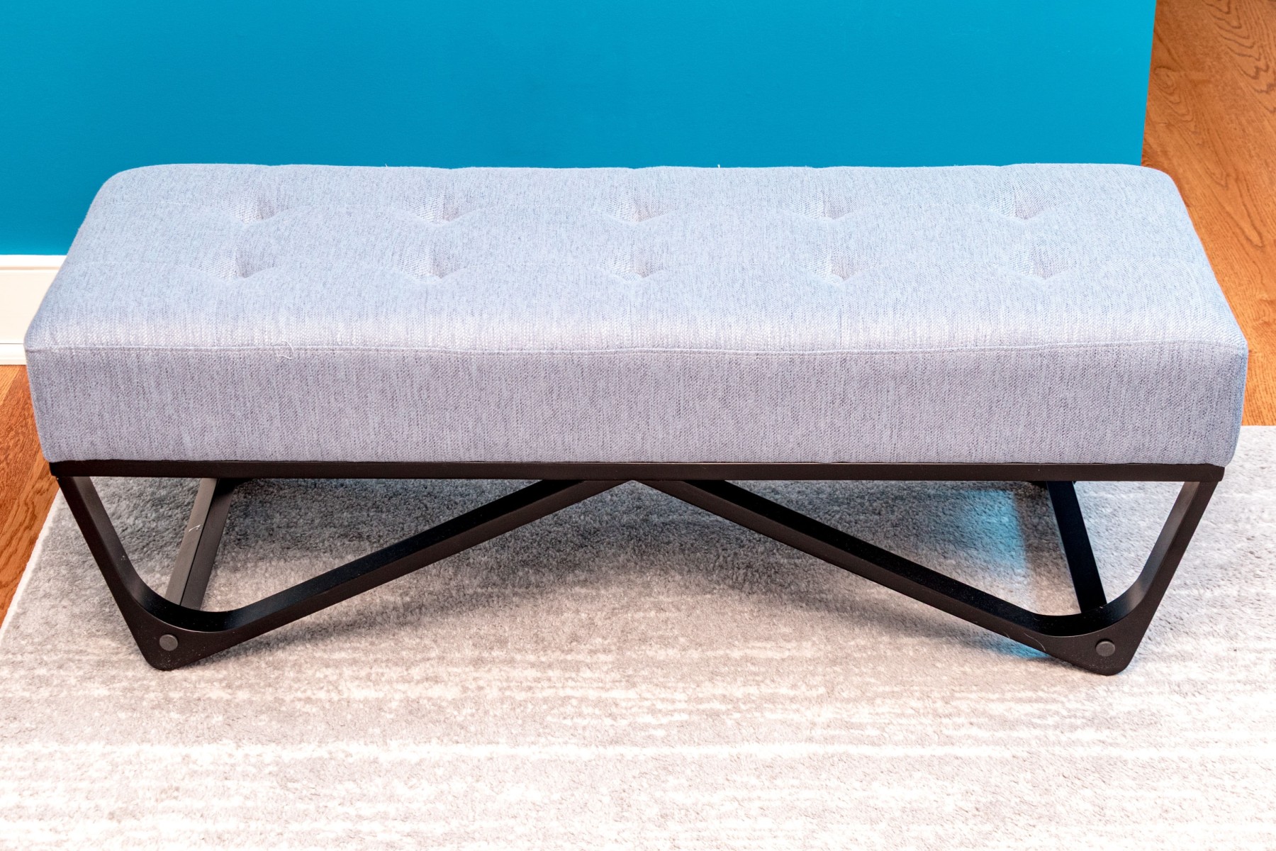 A wonderful Noble House Home Furnishings window bench raised on a black finished frame of geometric form with four feet and stretchers. The seat is upholstered in gray-blue fabric with button tufting.