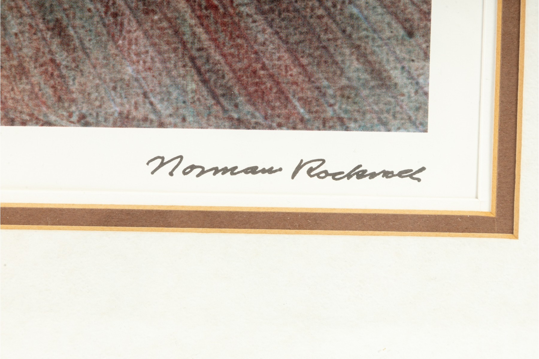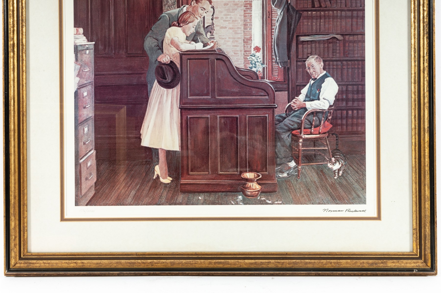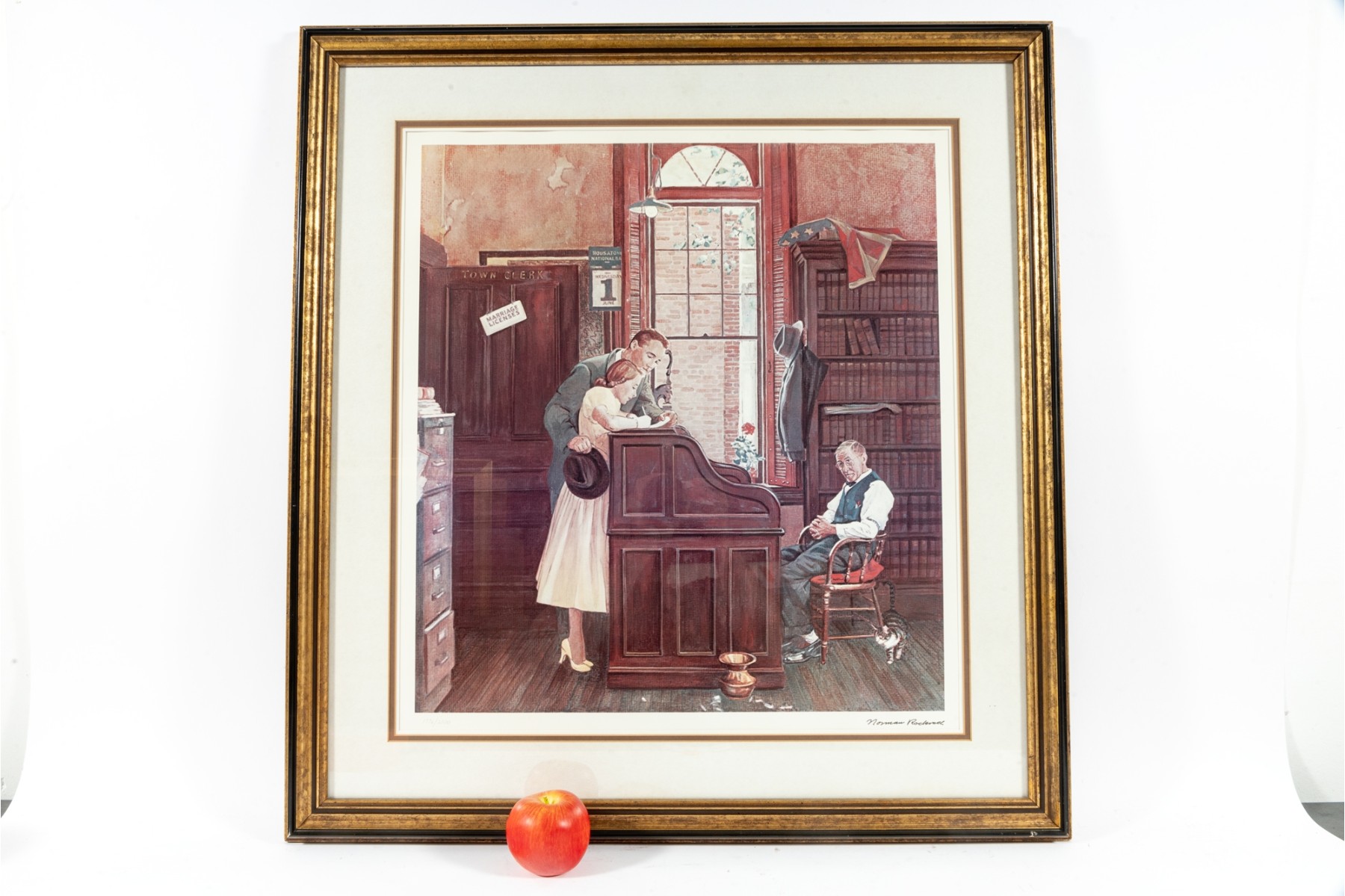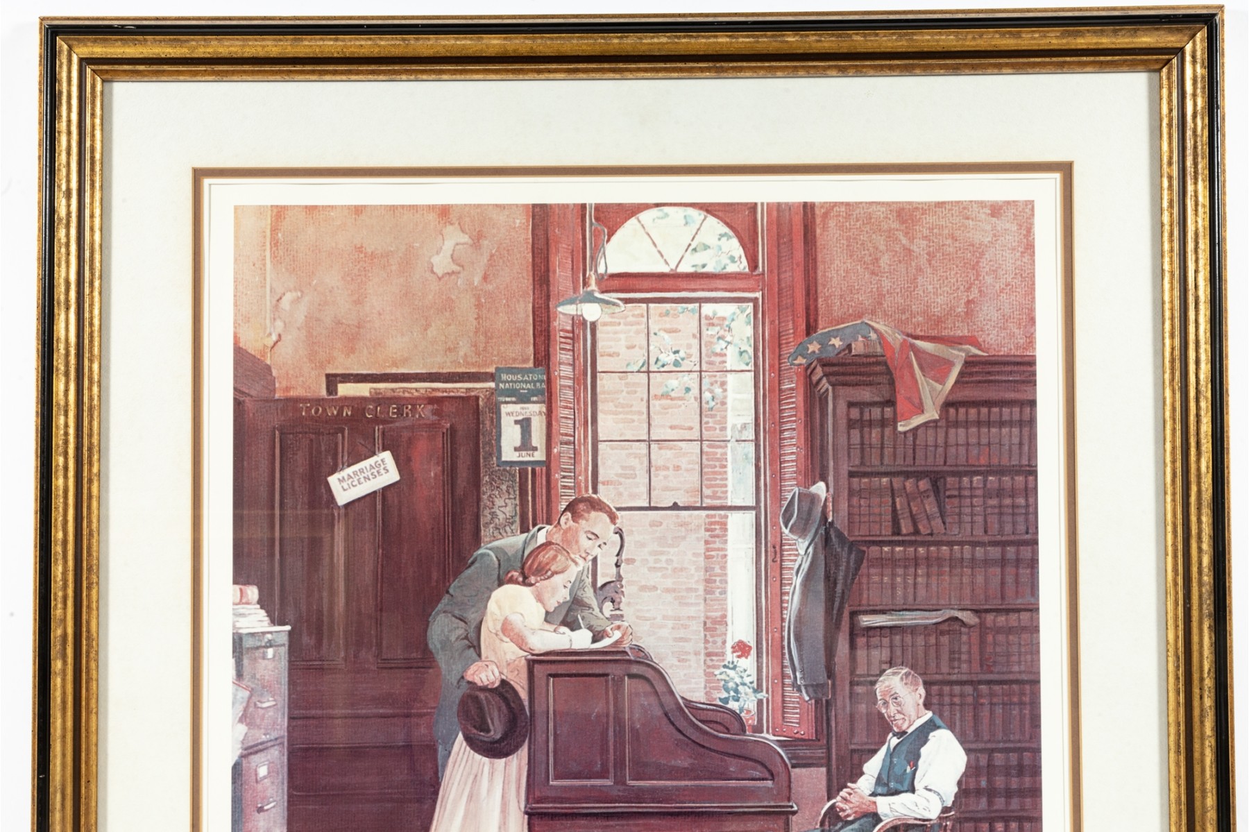 A signed and numbered color print of Marriage License by Norman Rockwell (American, 1894–1978). This print captures a heartwarming scene of a couple in a clerk’s office, preparing to sign their marriage license. The artwork is signed lower right, numbered 1776/2500 lower left -- displayed behind glass with tiered white/brown mats and a gold-tone wood frame.