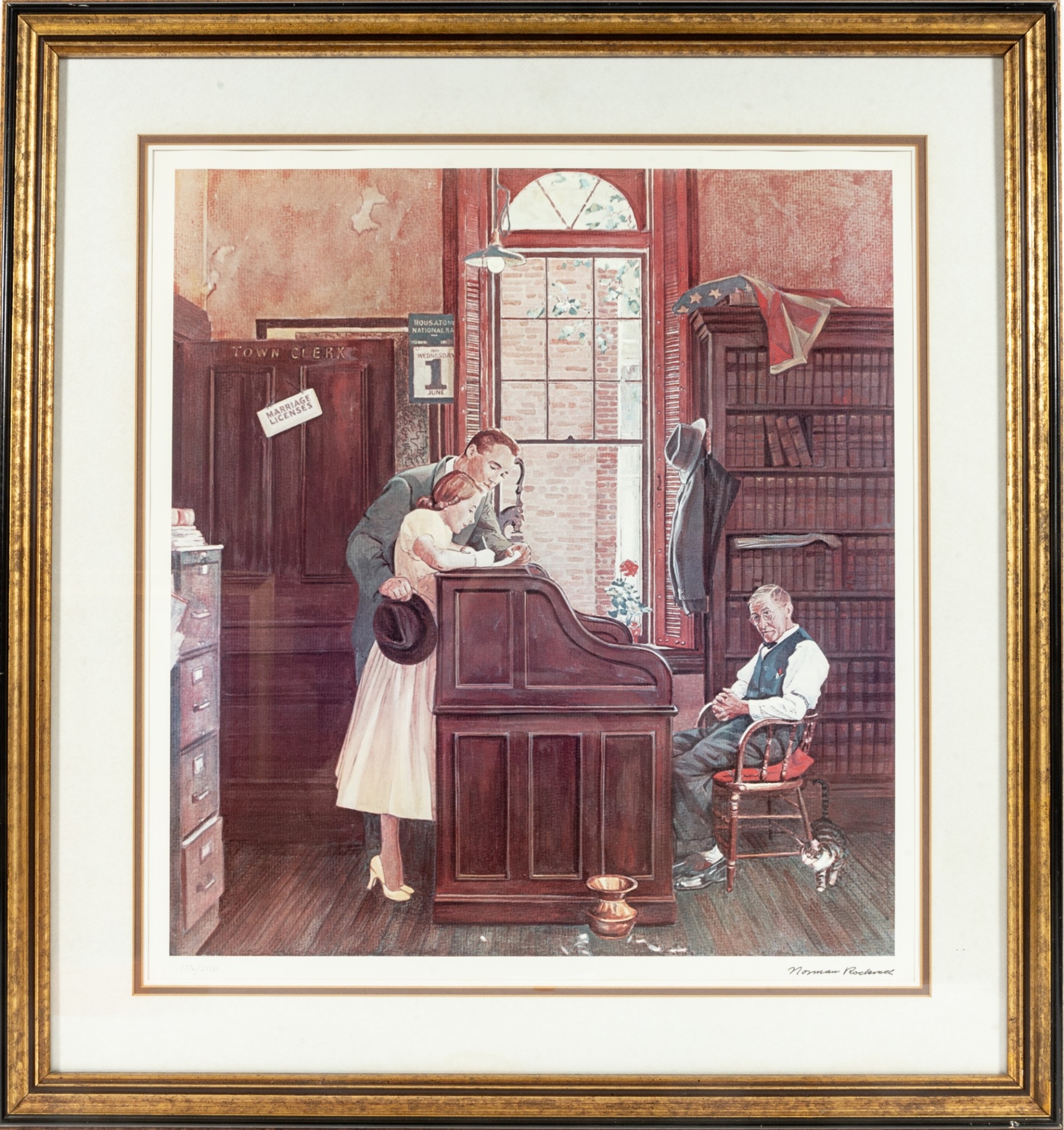 Norman Rockwell (American, 1894 - 1978) "Marriage License" Signed & Numbered Color Print #342128. Black Rock Galleries provides high end estate liquidation services through online estate auctions and a 50,000 sq ft designer showroom. estate liquidator, estate sale, online auction, antiques, fine art, liquidation, clean outs, auction, consignment, interior design, fine jewelry, collectibles, appraisals, estate appraisals, estate services, decor, furniture, furniture consignment, antique center, consignment shop. We offer appraisal services and specialize in fine art, jewelry, antiques and decorative arts. Sell with us. Black Rock Galleries is the tri-state's largest estate liquidator serving New England and the greater New York City area. We are the trusted source for expert appraisals, auction services, estate sales, and consignments. Black Rock Galleries is the east coast's largest and most trusted estate liquidator, with locations in Connecticut, greater Boston, MA and Raleigh, NC, Fairfield, Southport, Apex, TX. We are the best source for expert appraisals, auction services, estate sales and consignments. We have served thousands of families and estates with compassion, professionalism and expertise. BRG works with attorneys, executors, realtors and families to bring the greatest return on personal and estate property in the current market. Our unique combination of services make us the easy choice to get the job done in a timely and stress-free manner. We are with you from the initial consultation to the final clean out. Our house-built online auction software platform offers clients a dynamic approach to liquidating their personal property. This venue is most successful in bringing the best return with the least amount of disruption for our clients. See our services page for a complete description of this offering. Norman Rockwell (American, 1894 - 1978) "Marriage License" Signed & Numbered Color Print #342128