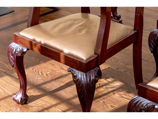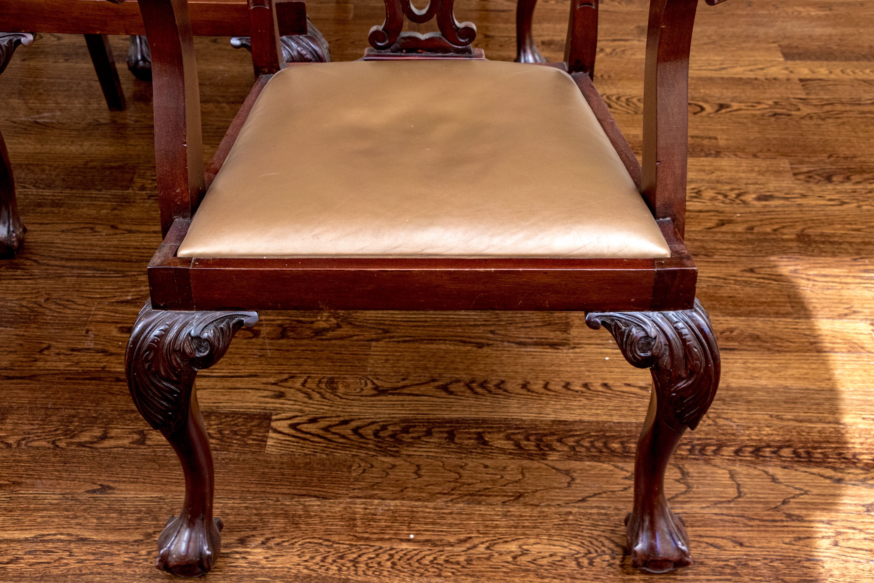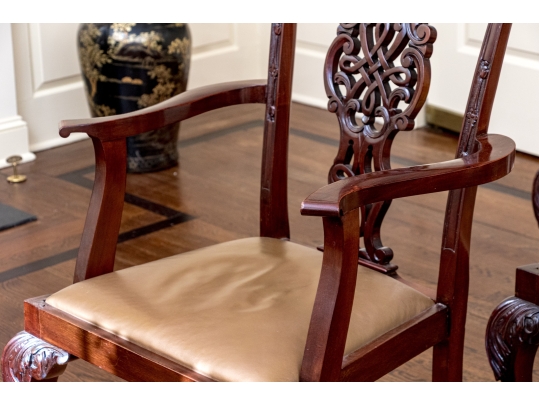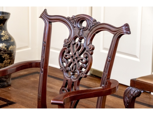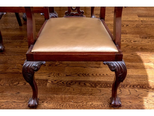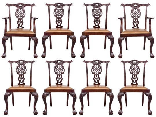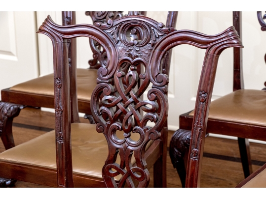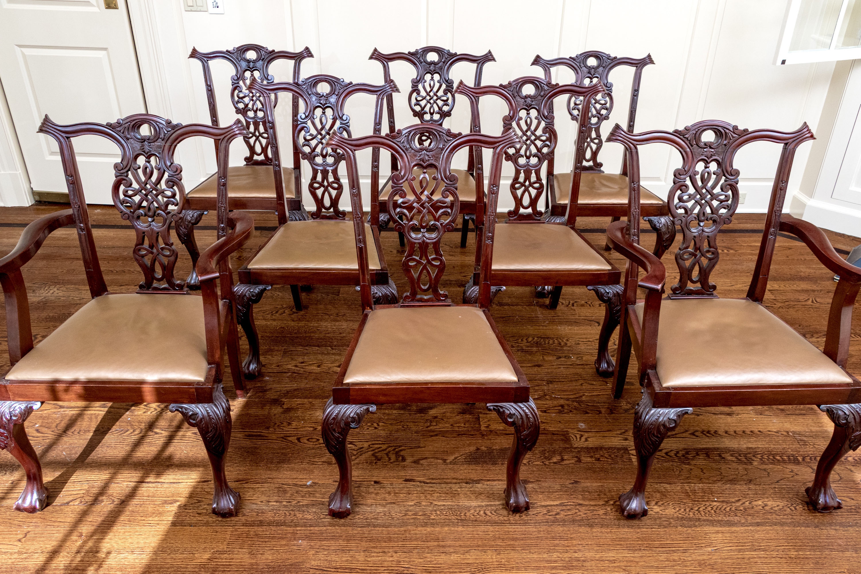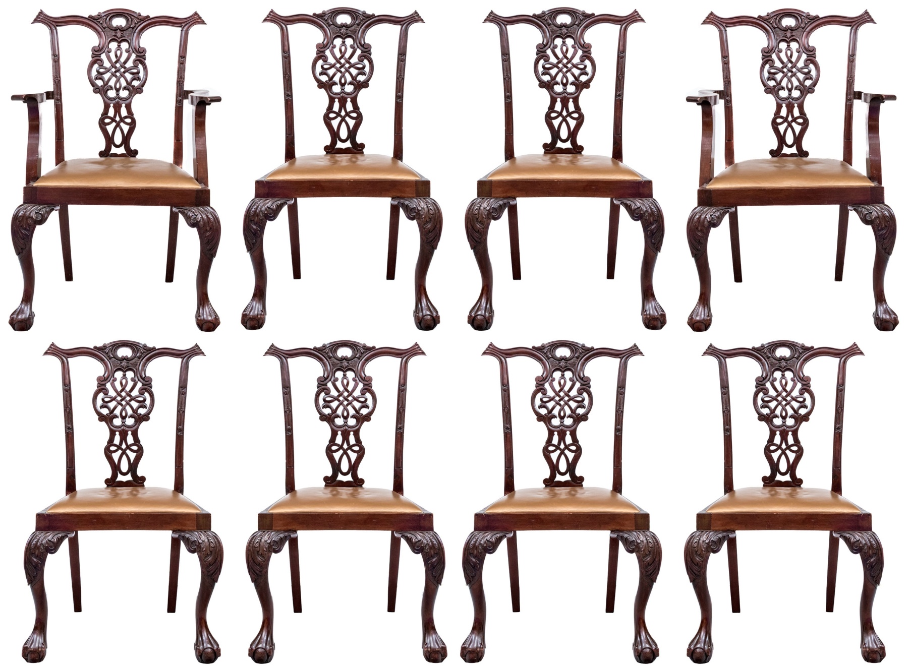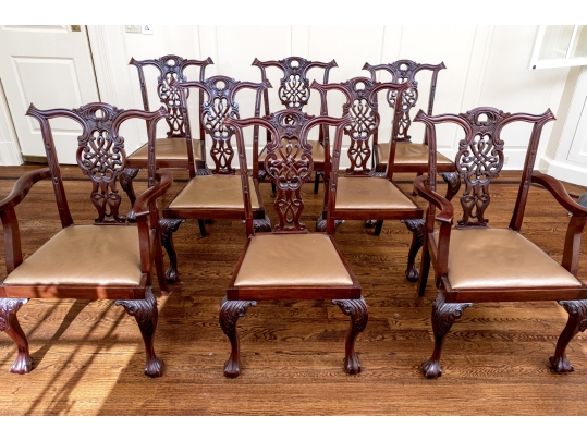 Set of eight Chippendale style mahogany chairs comprised of 2 arm chairs and 6 side chairs. The chairs with intricate intersecting back splat, inset faux leather seat, heavily carved knees, cabriole front legs with ball and claw feet, fluted ears with pierced cresting rail, saber back legs. The chairs are well made with strong joinery and quite comfortable.