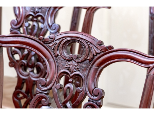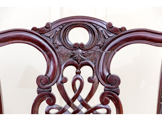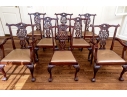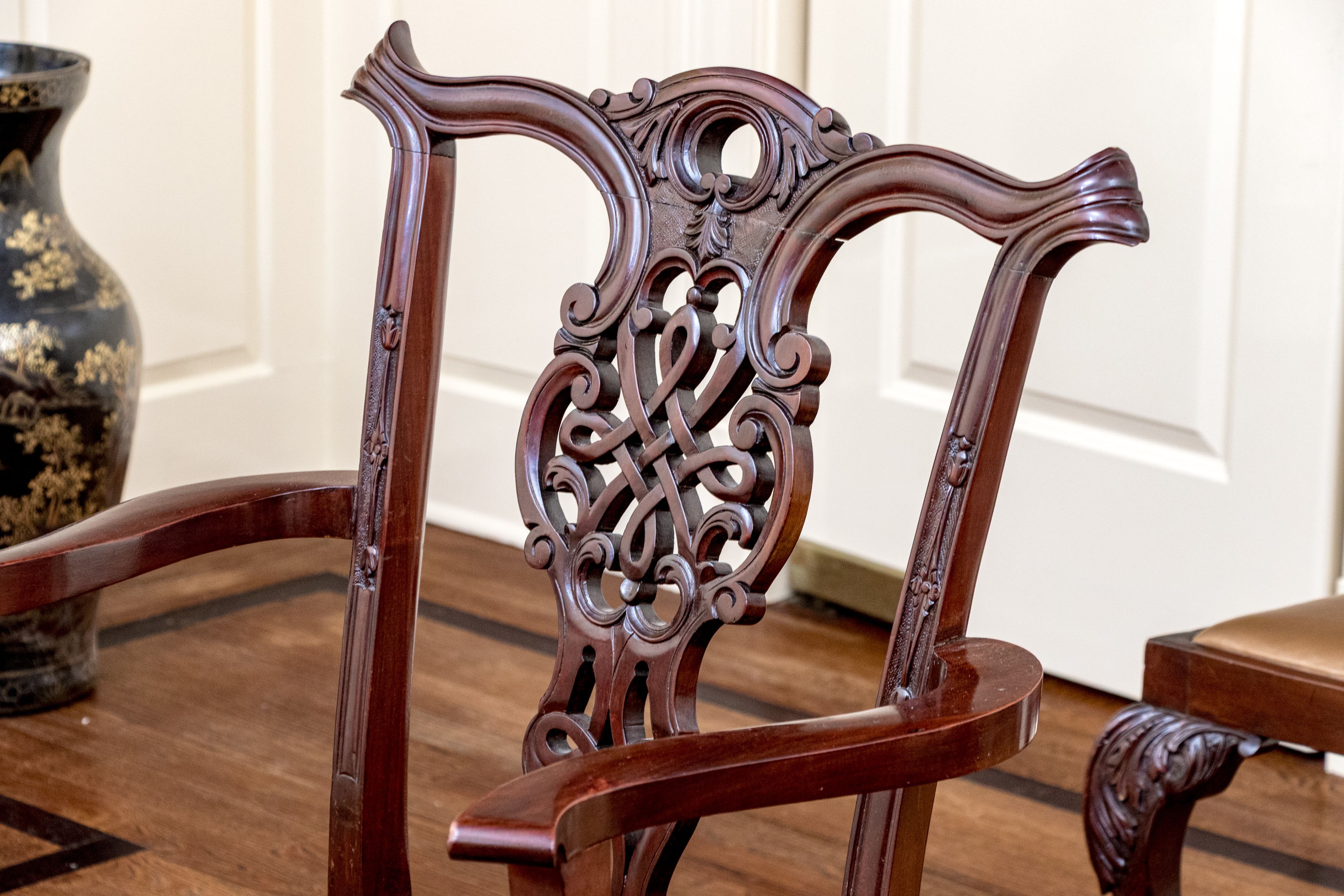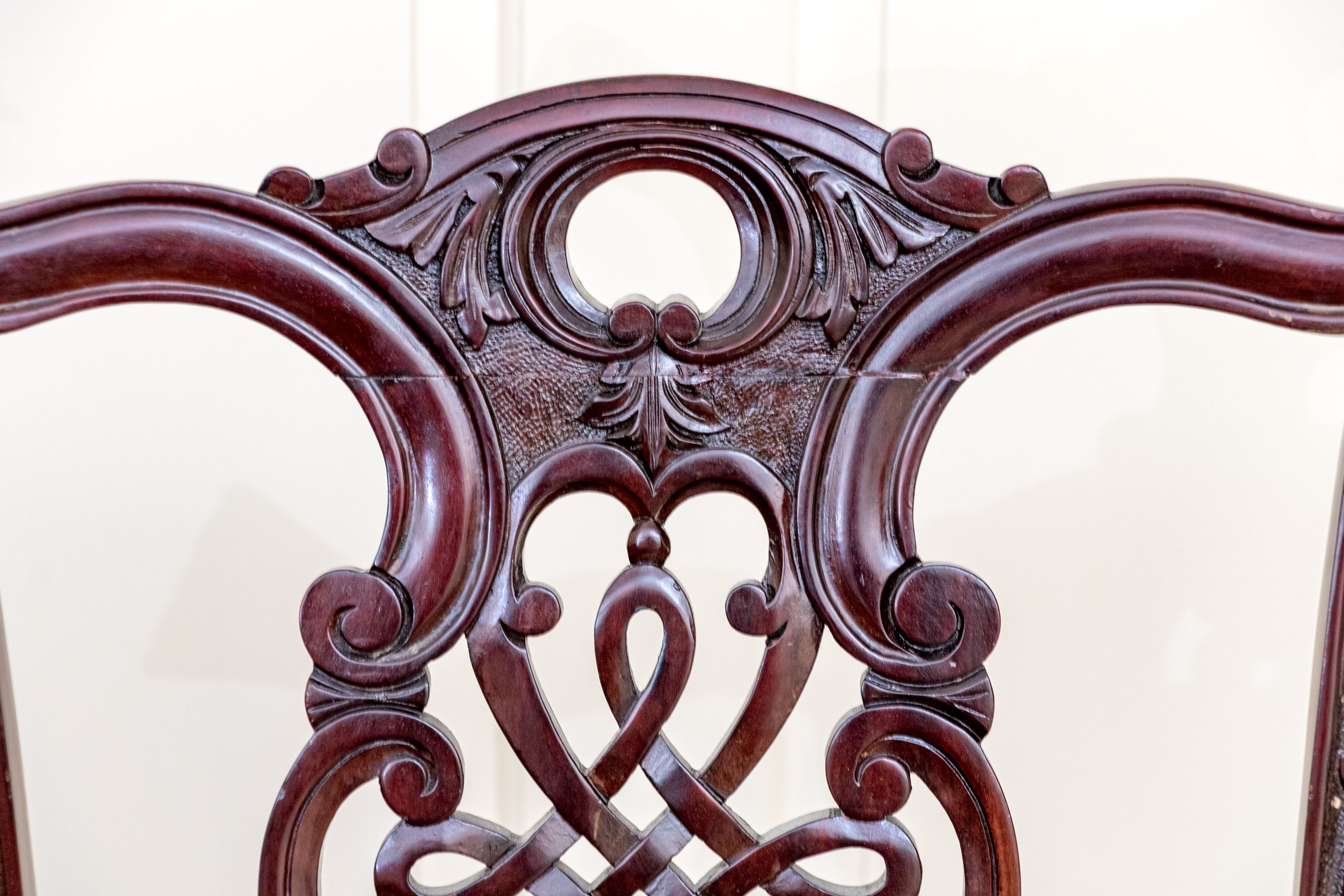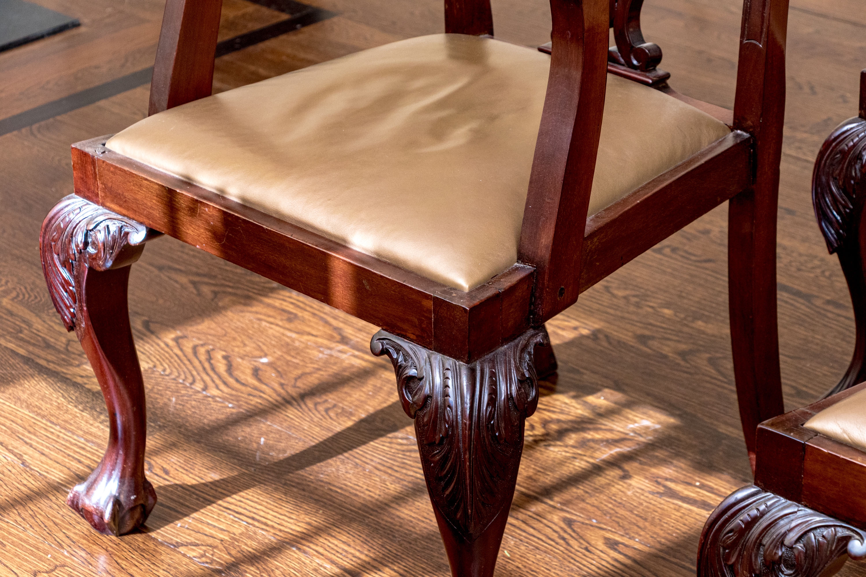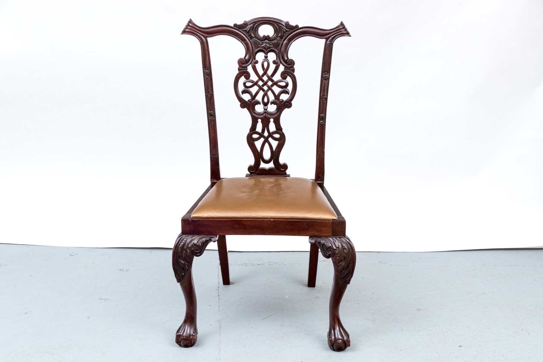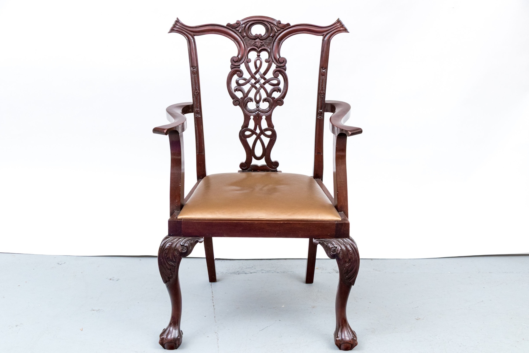 Set of eight Chippendale style mahogany chairs comprised of 2 arm chairs and 6 side chairs. The chairs with intricate intersecting back splat, inset faux leather seat, heavily carved knees, cabriole front legs with ball and claw feet, fluted ears with pierced cresting rail, saber back legs. The chairs are well made with strong joinery and quite comfortable.