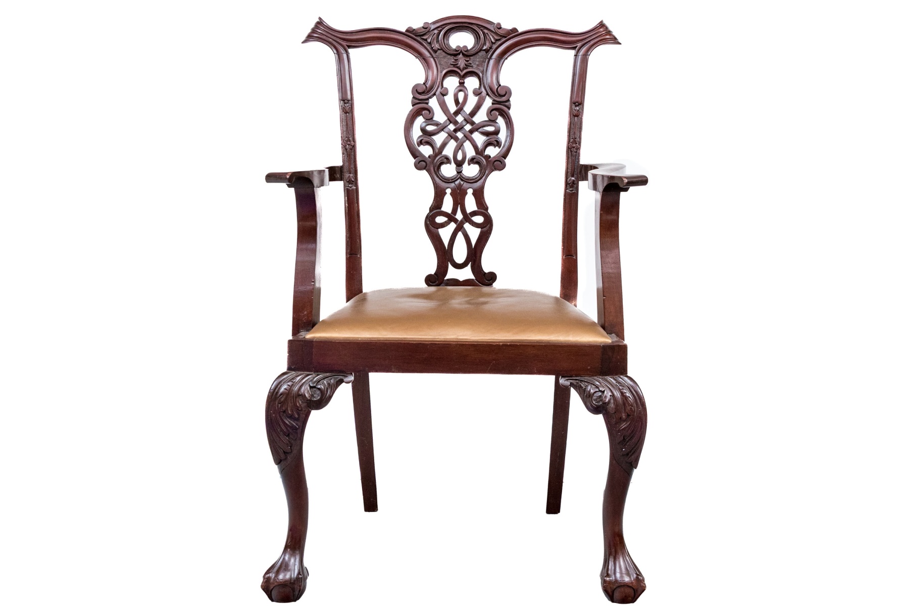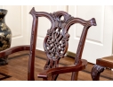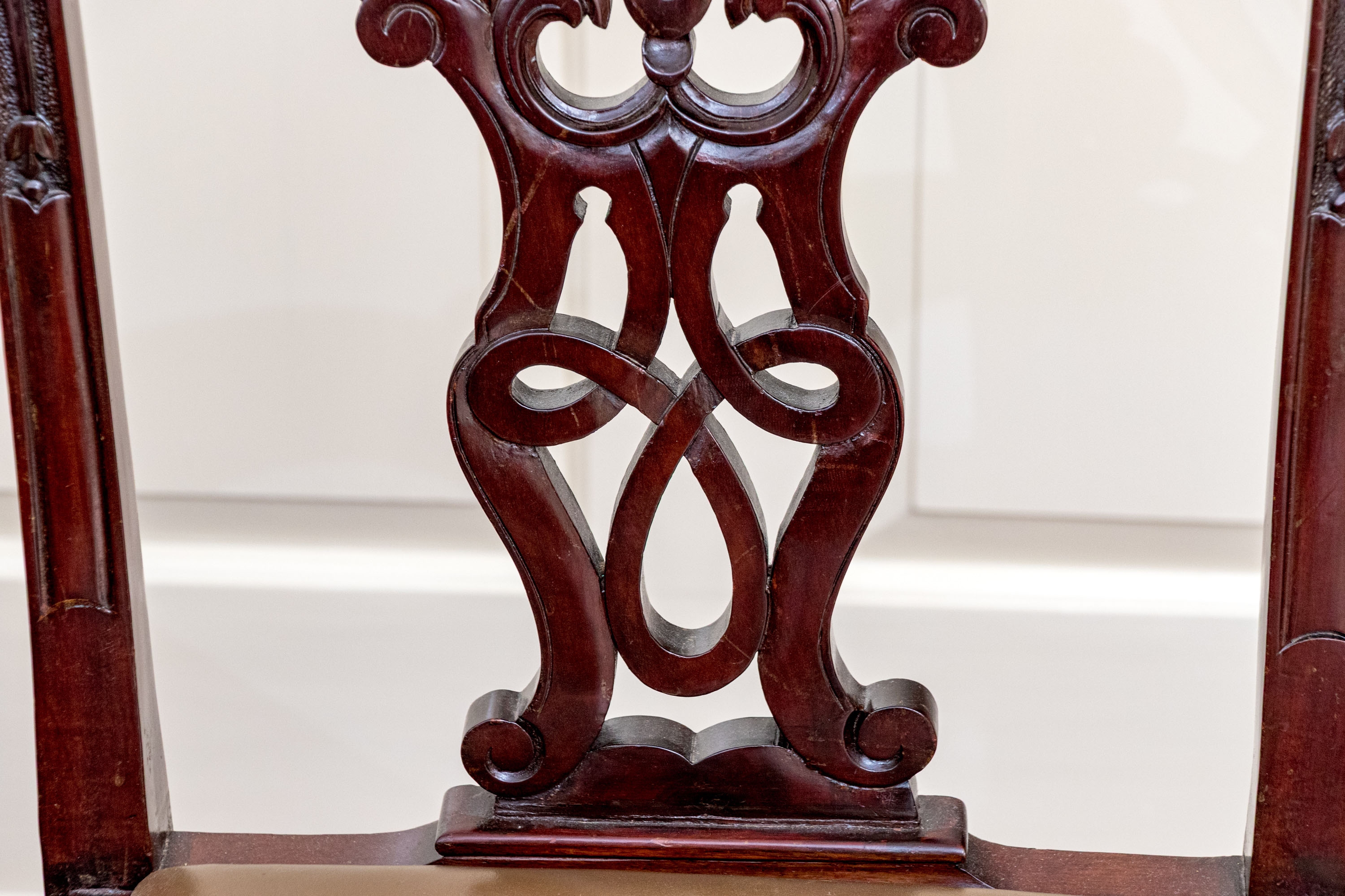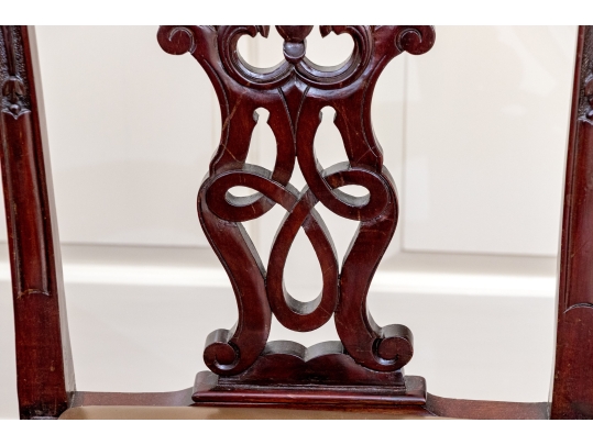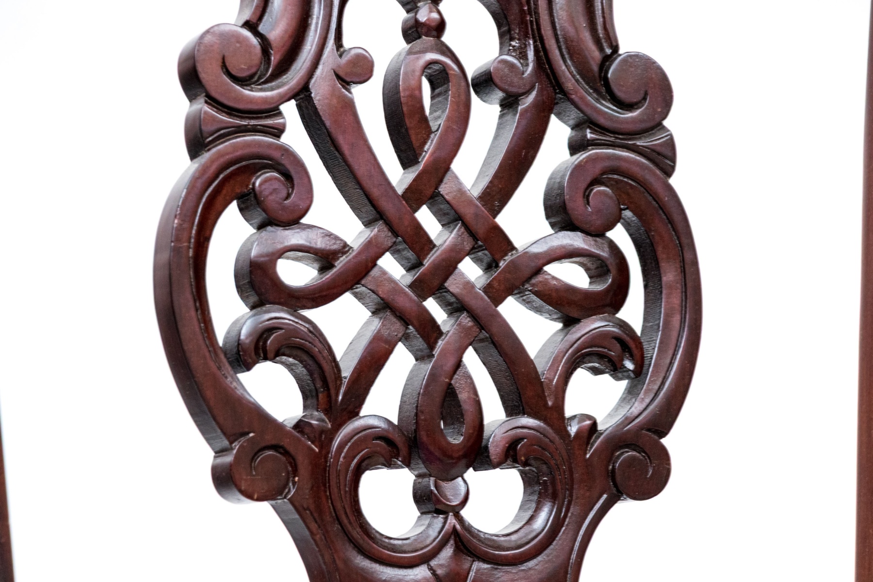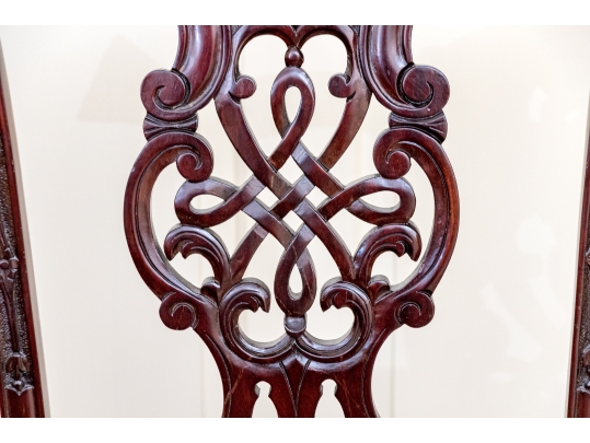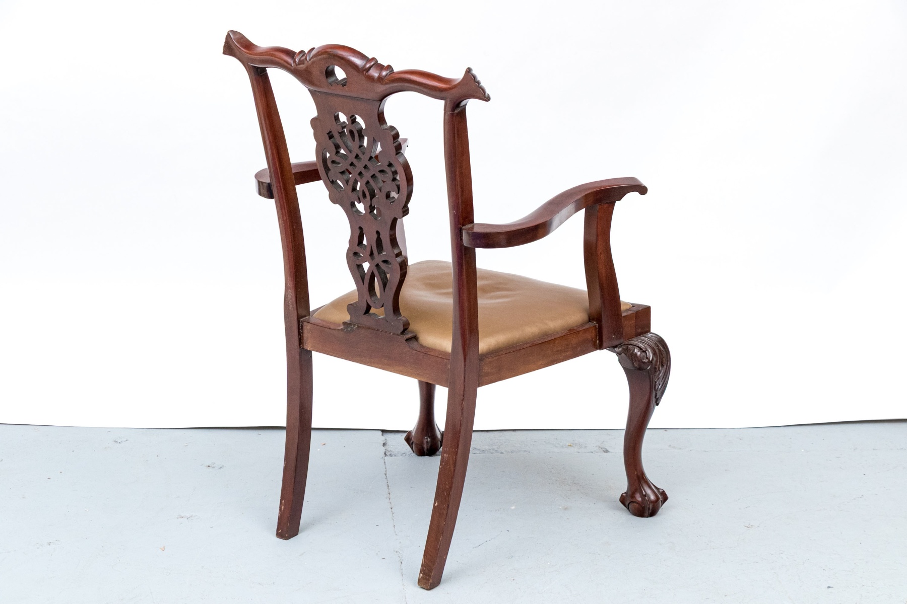 Set of eight Chippendale style mahogany chairs comprised of 2 arm chairs and 6 side chairs. The chairs with intricate intersecting back splat, inset faux leather seat, heavily carved knees, cabriole front legs with ball and claw feet, fluted ears with pierced cresting rail, saber back legs. The chairs are well made with strong joinery and quite comfortable.