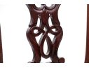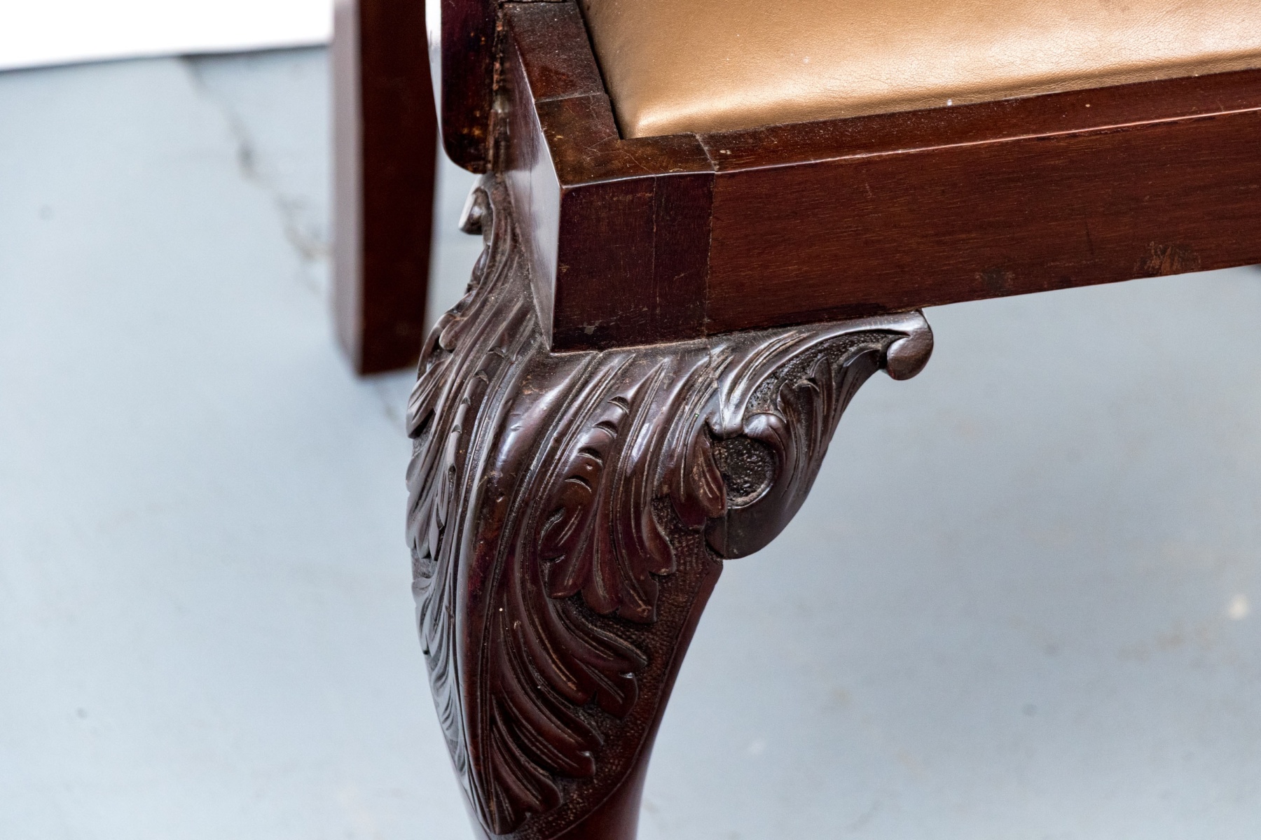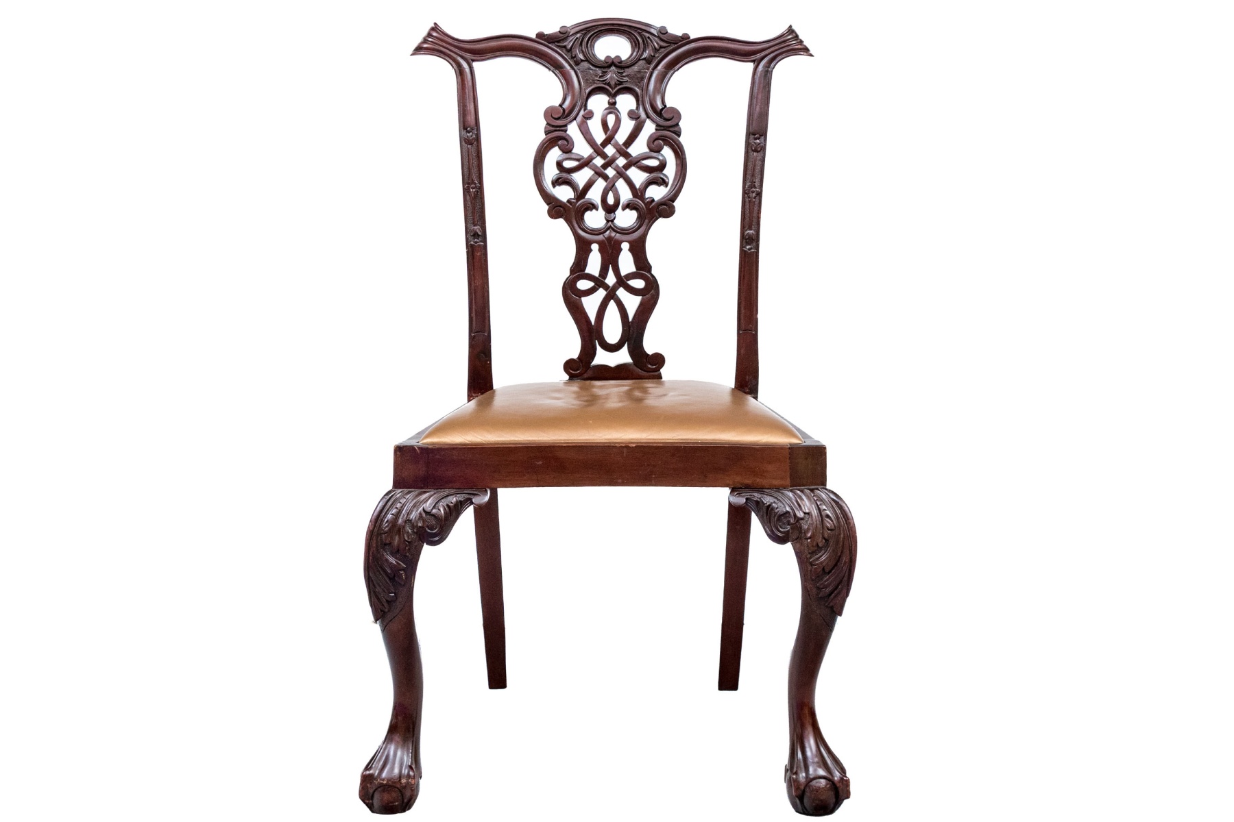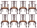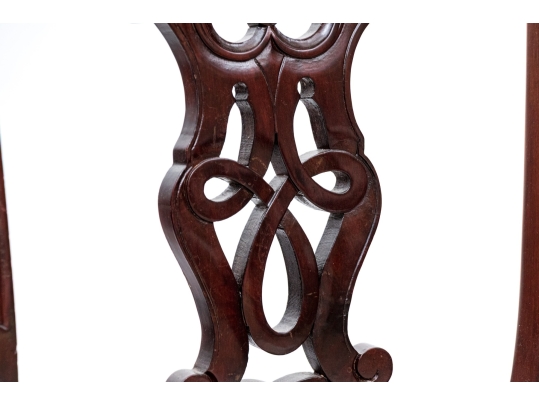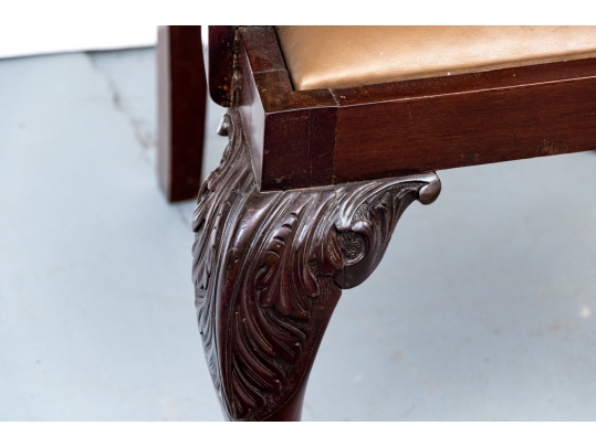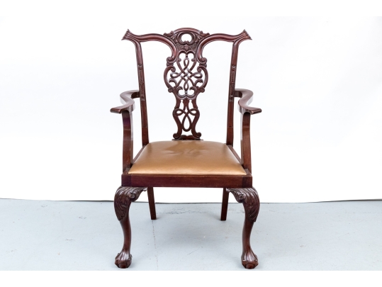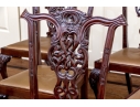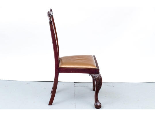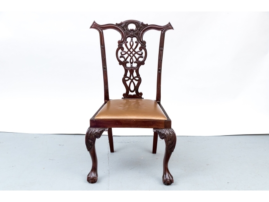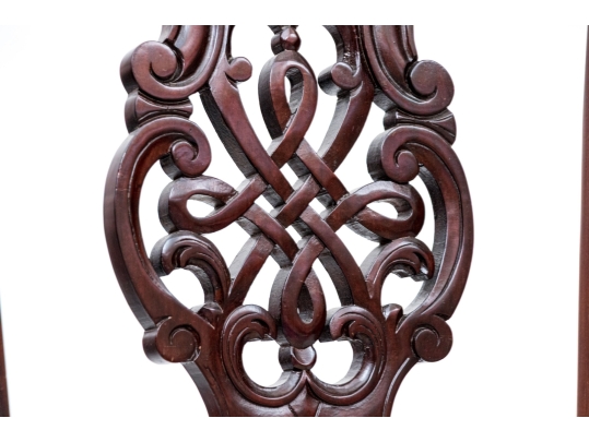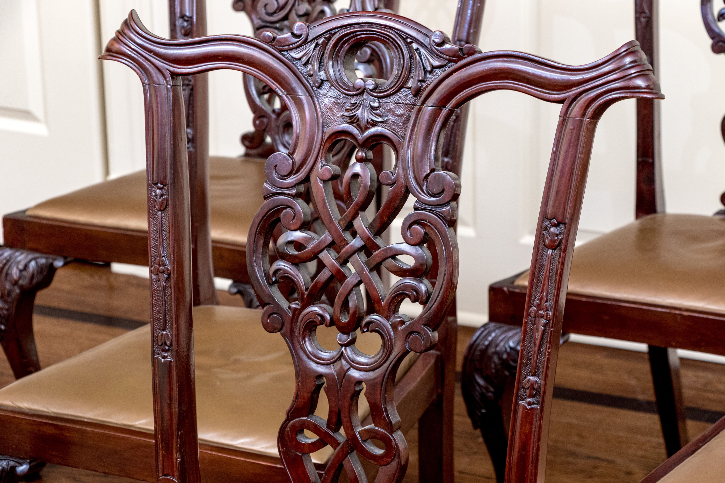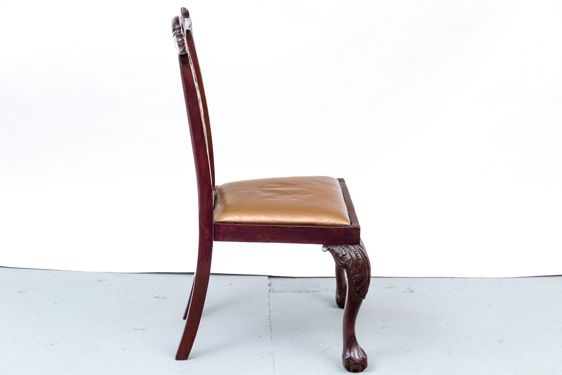 Set of eight Chippendale style mahogany chairs comprised of 2 arm chairs and 6 side chairs. The chairs with intricate intersecting back splat, inset faux leather seat, heavily carved knees, cabriole front legs with ball and claw feet, fluted ears with pierced cresting rail, saber back legs. The chairs are well made with strong joinery and quite comfortable.