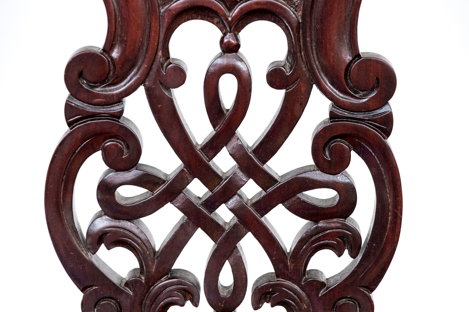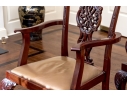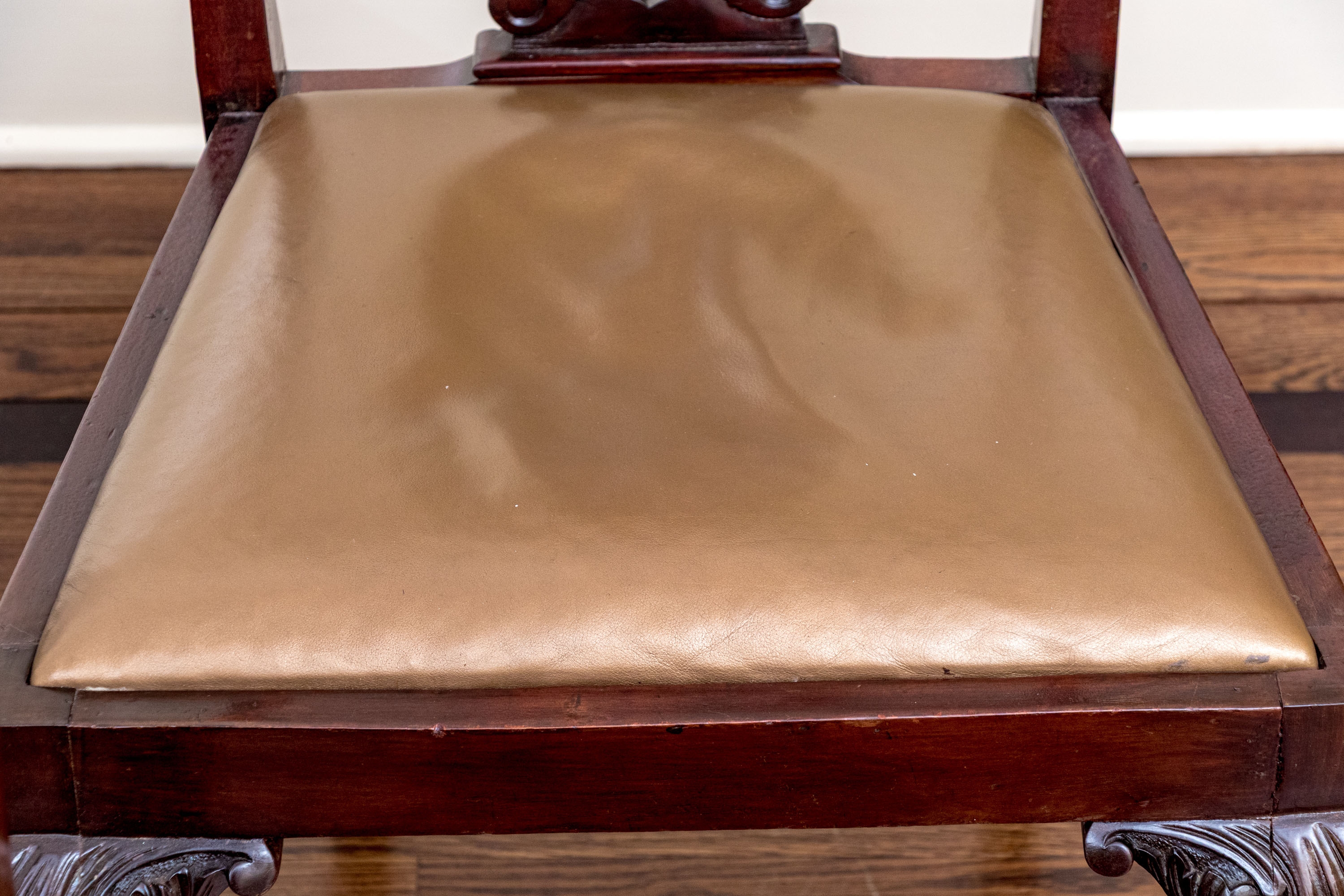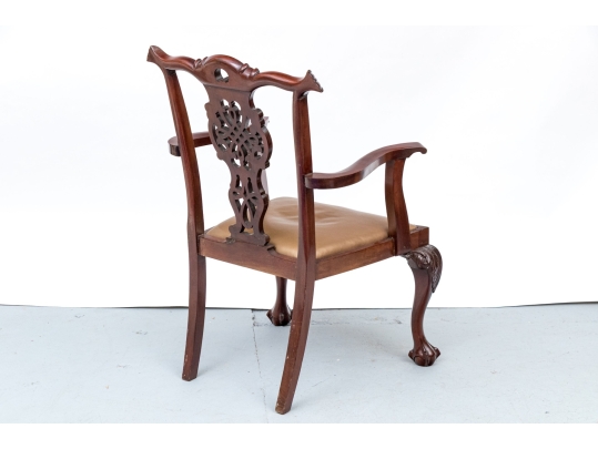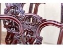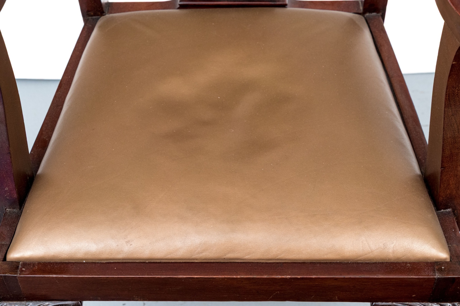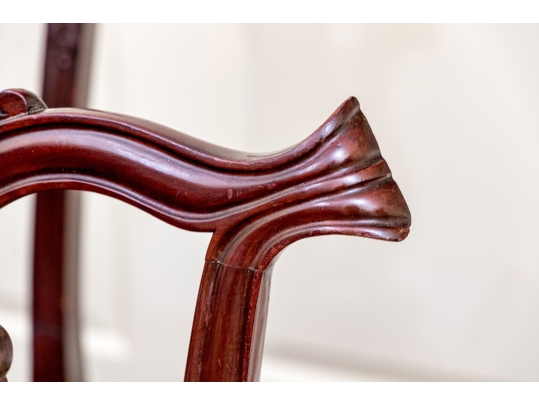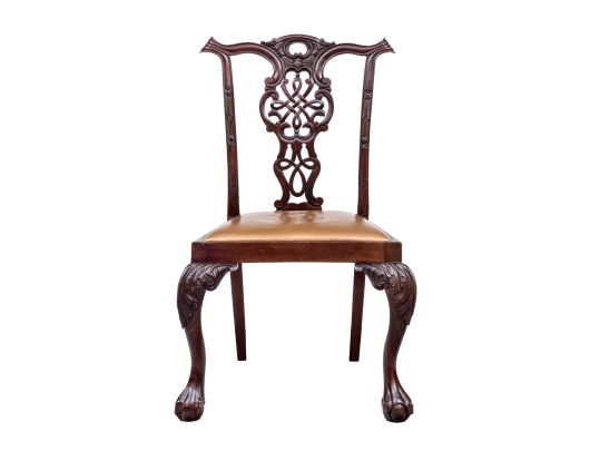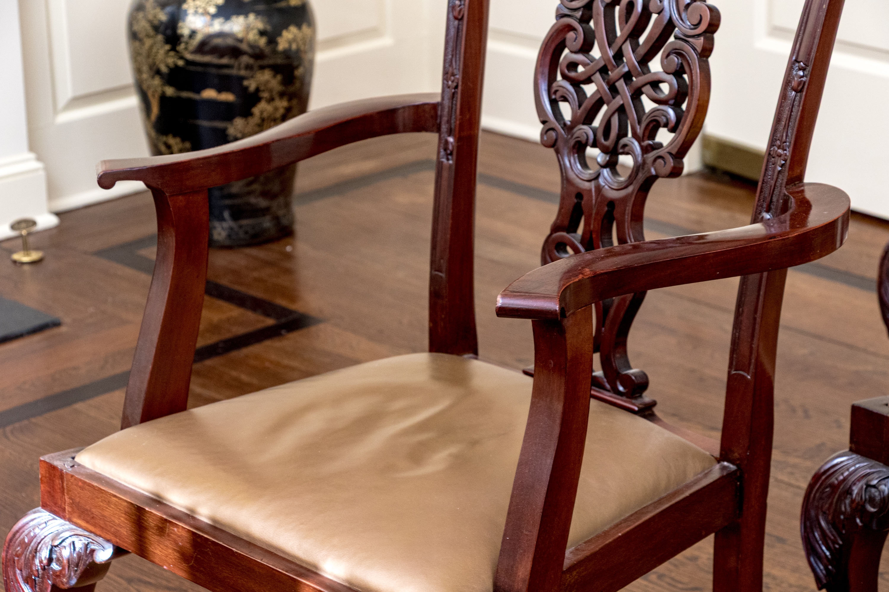 Set of eight Chippendale style mahogany chairs comprised of 2 arm chairs and 6 side chairs. The chairs with intricate intersecting back splat, inset faux leather seat, heavily carved knees, cabriole front legs with ball and claw feet, fluted ears with pierced cresting rail, saber back legs. The chairs are well made with strong joinery and quite comfortable.