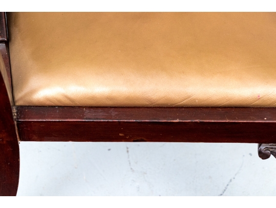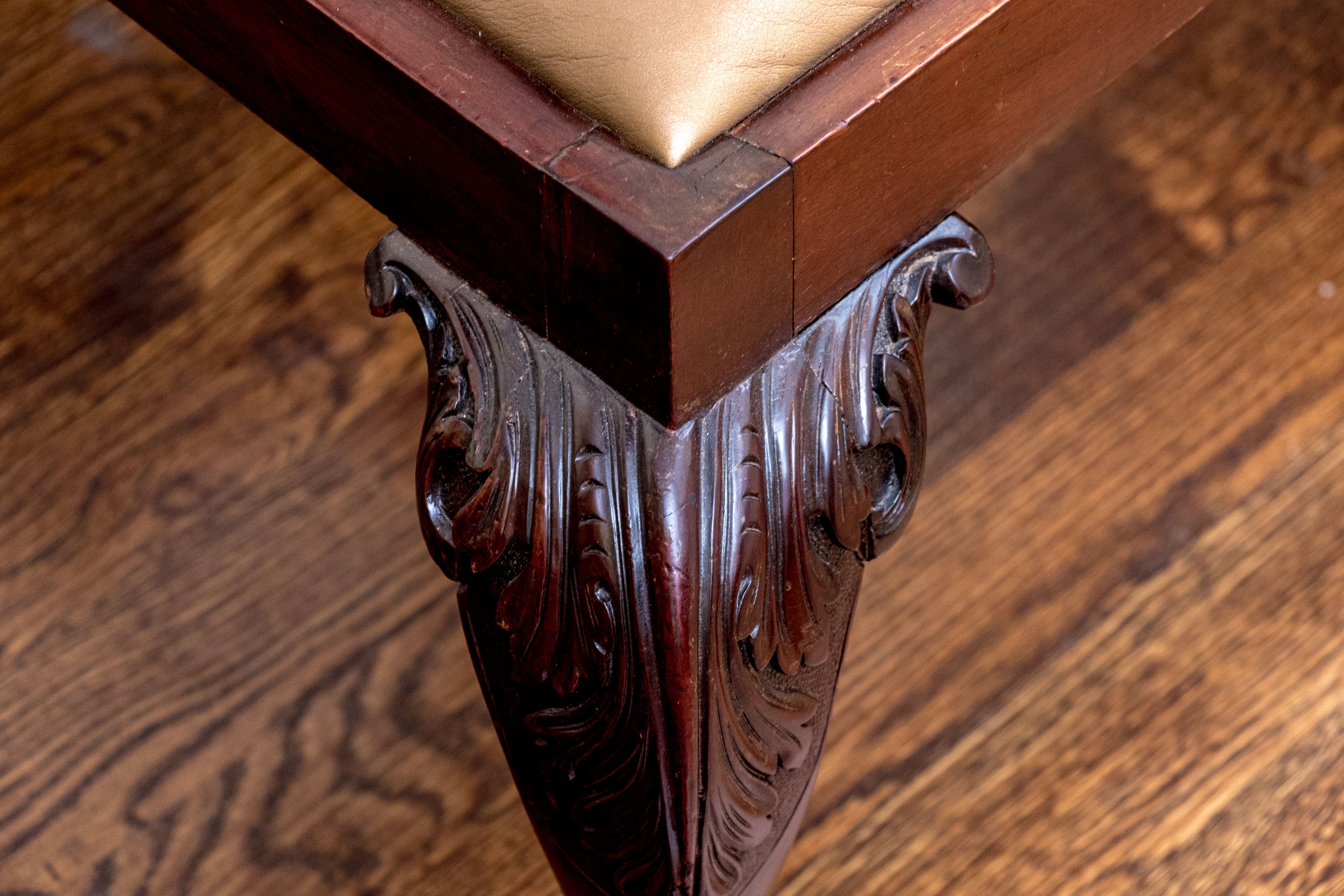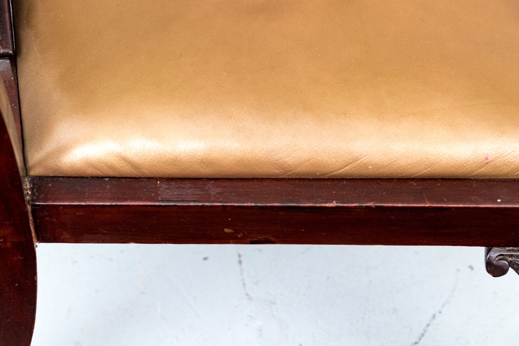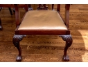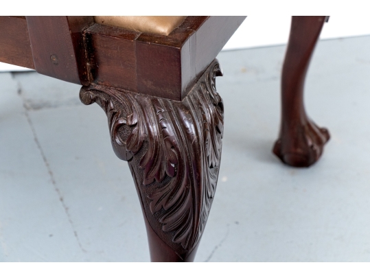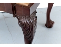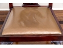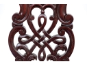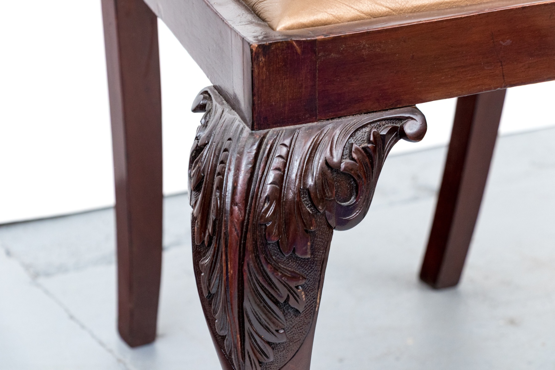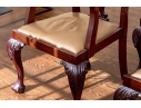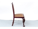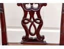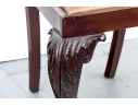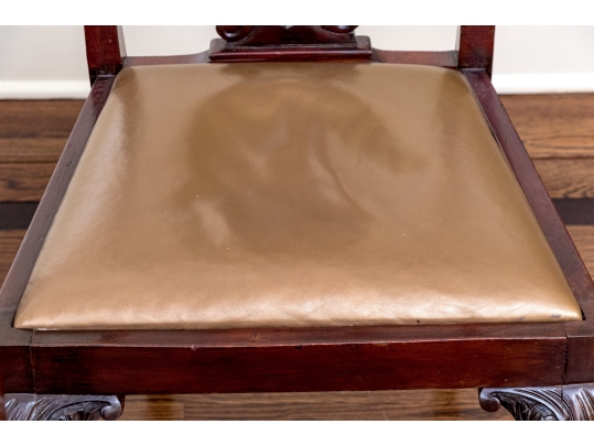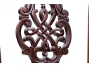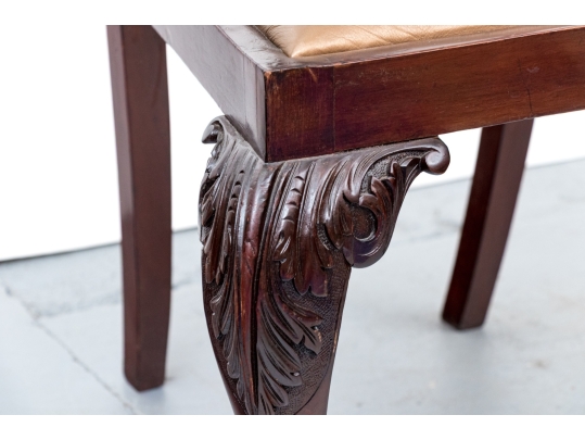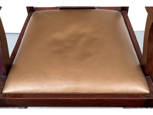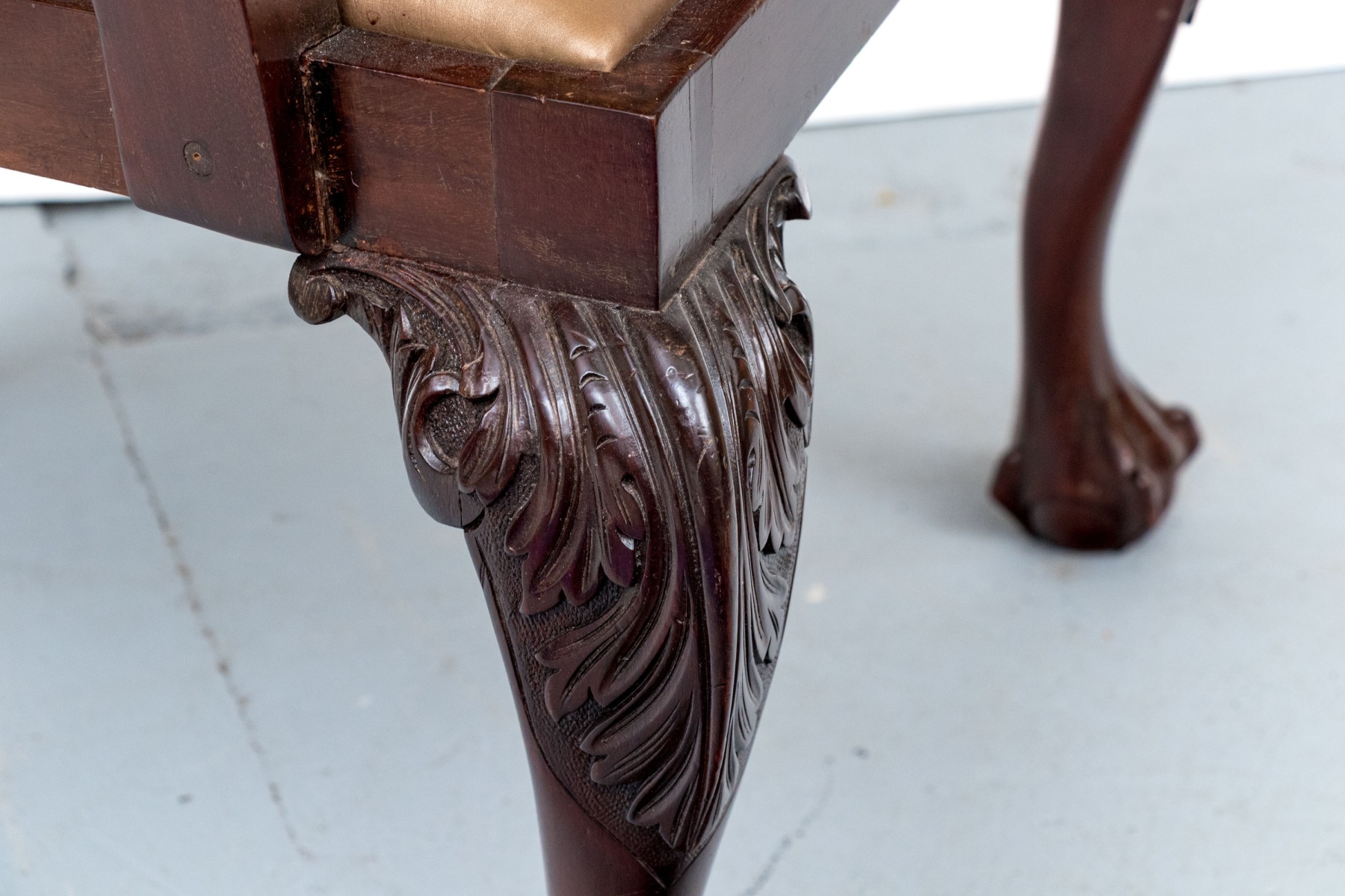 Set of eight Chippendale style mahogany chairs comprised of 2 arm chairs and 6 side chairs. The chairs with intricate intersecting back splat, inset faux leather seat, heavily carved knees, cabriole front legs with ball and claw feet, fluted ears with pierced cresting rail, saber back legs. The chairs are well made with strong joinery and quite comfortable.
