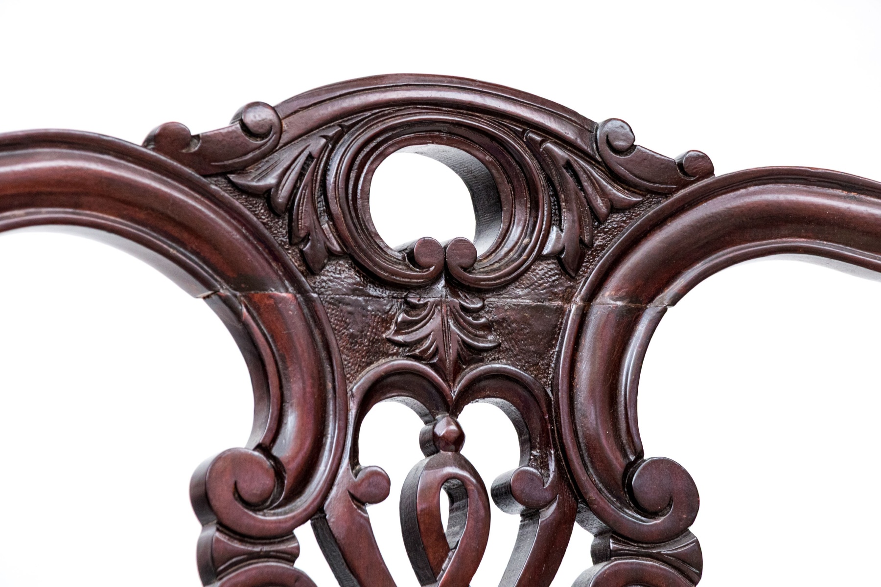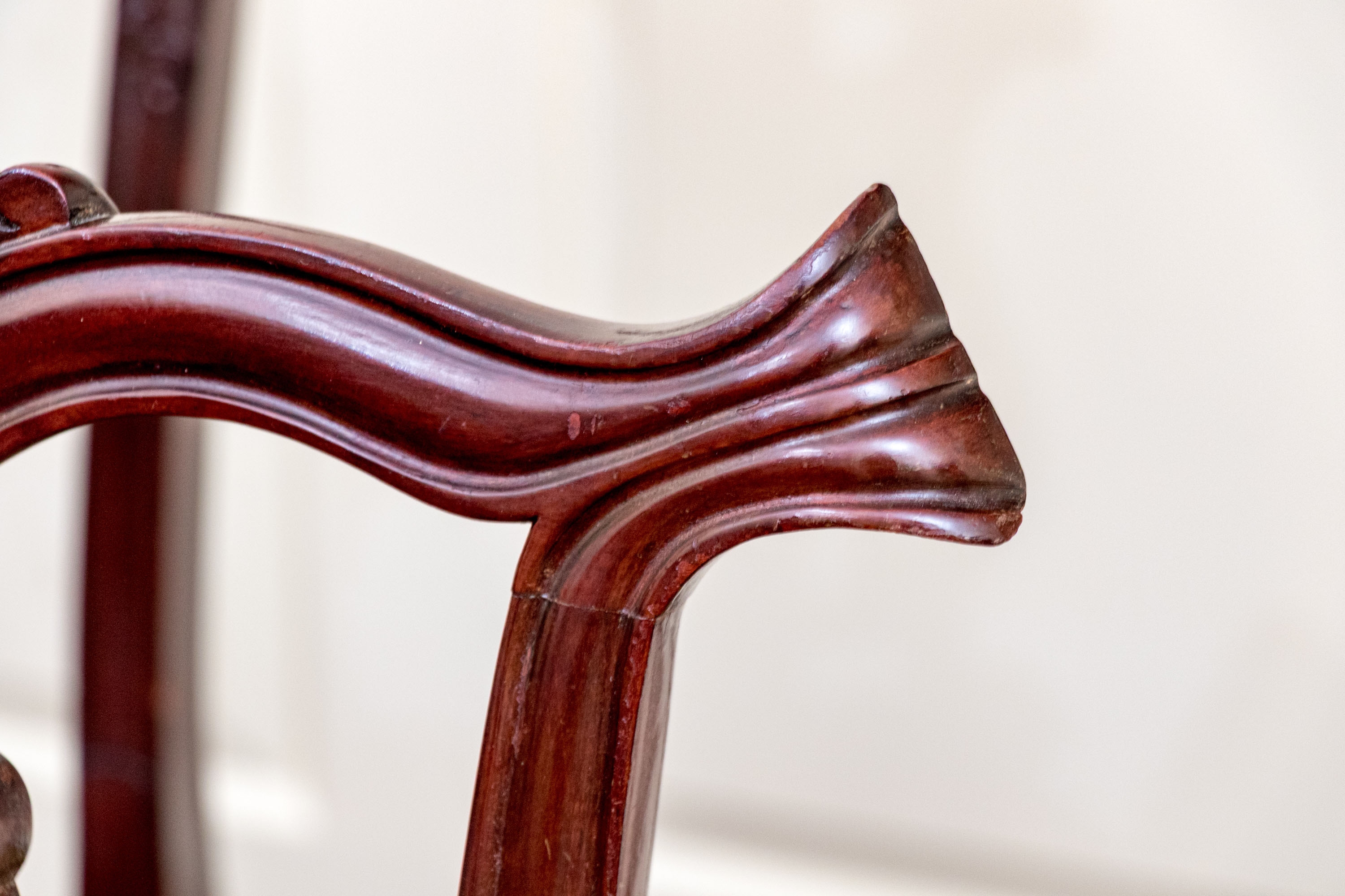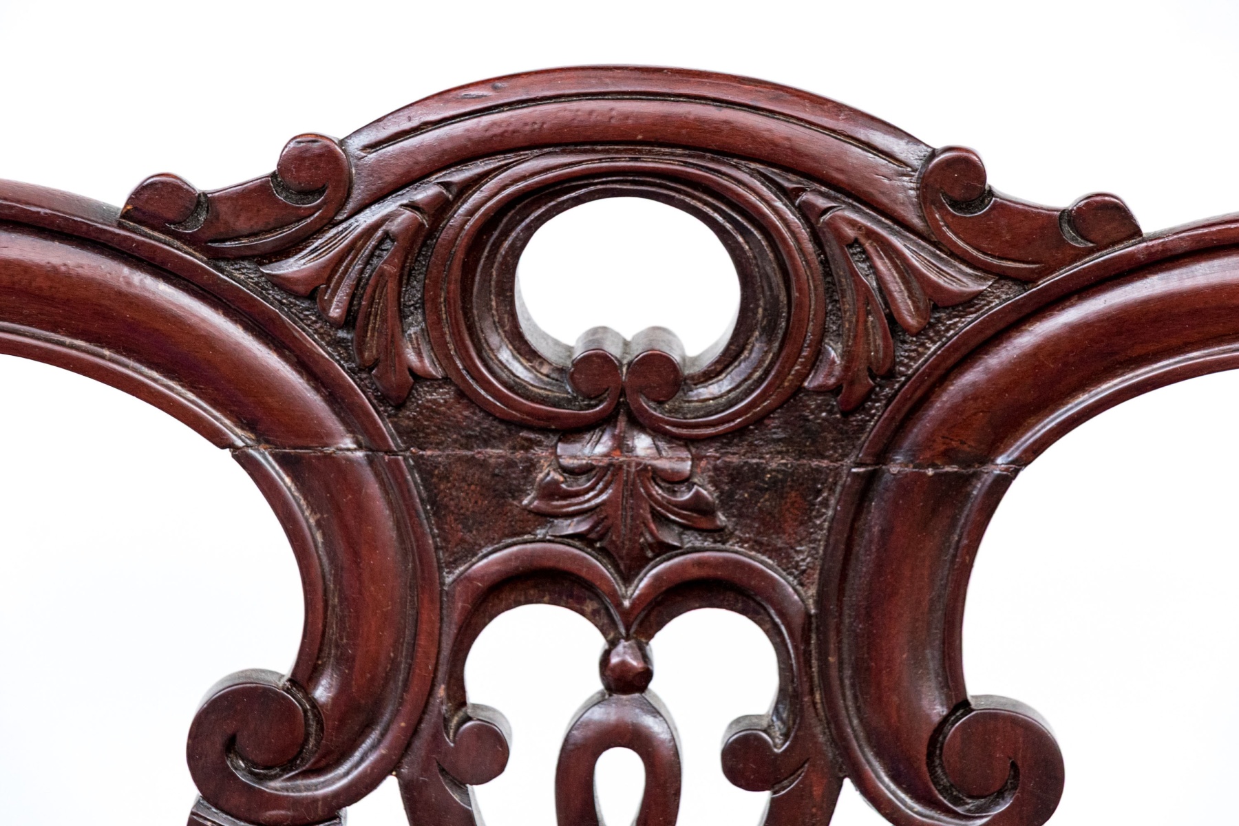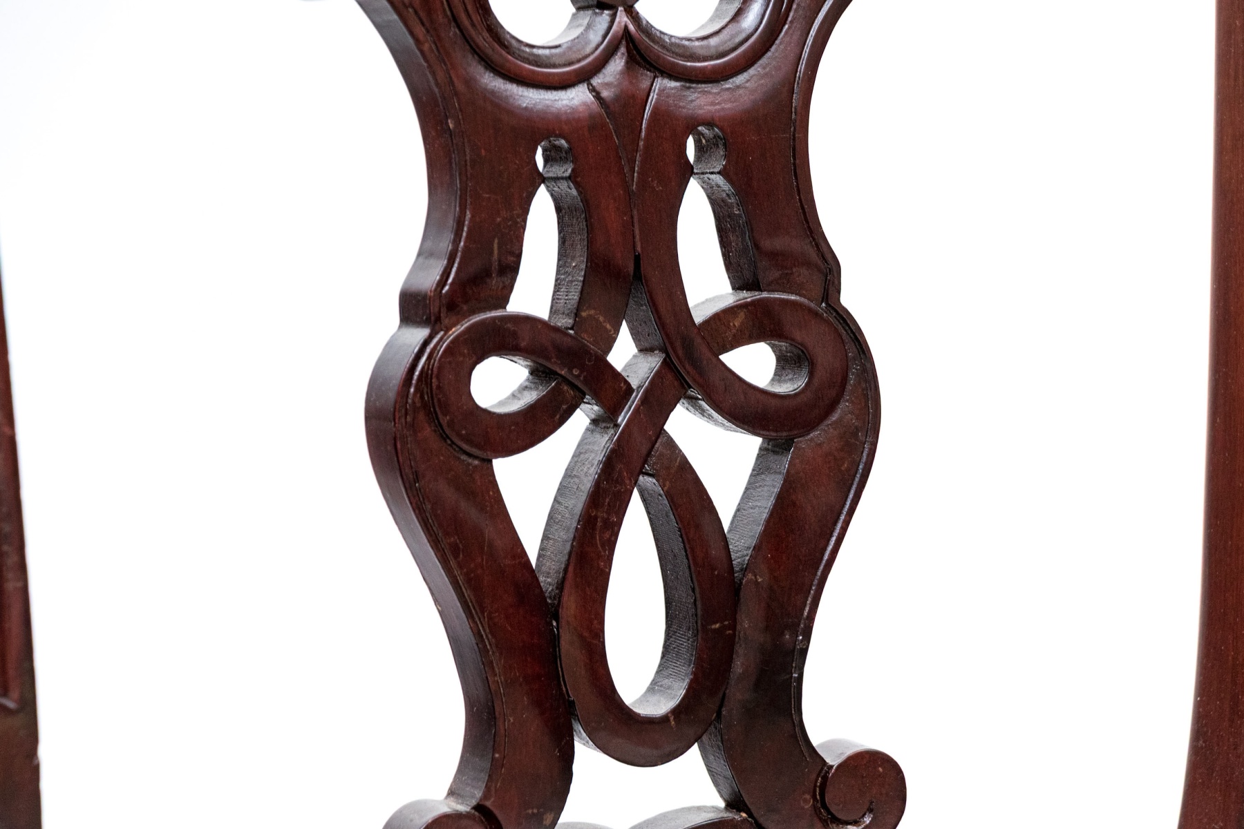 Condition: Please see detail photos. Various signs of acceptable age and use include an old repair to one seat back, one seat with a faint ring mark, marks to the seats, scratches and wear to front edge, legs, knees and arms. The aforementioned is for accuracy as the set retains a strong Chippendale presentation. The joinery is strong and solid.