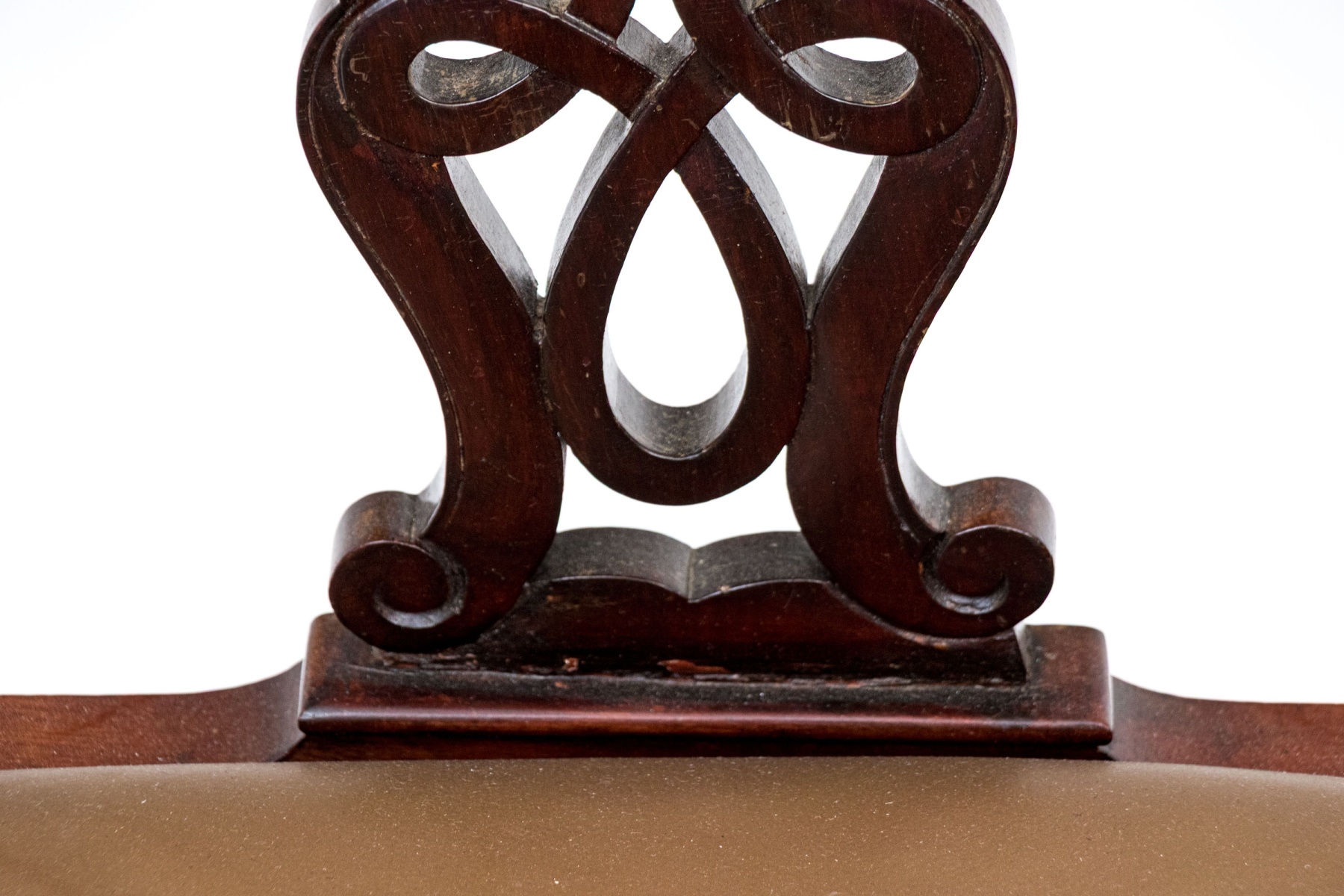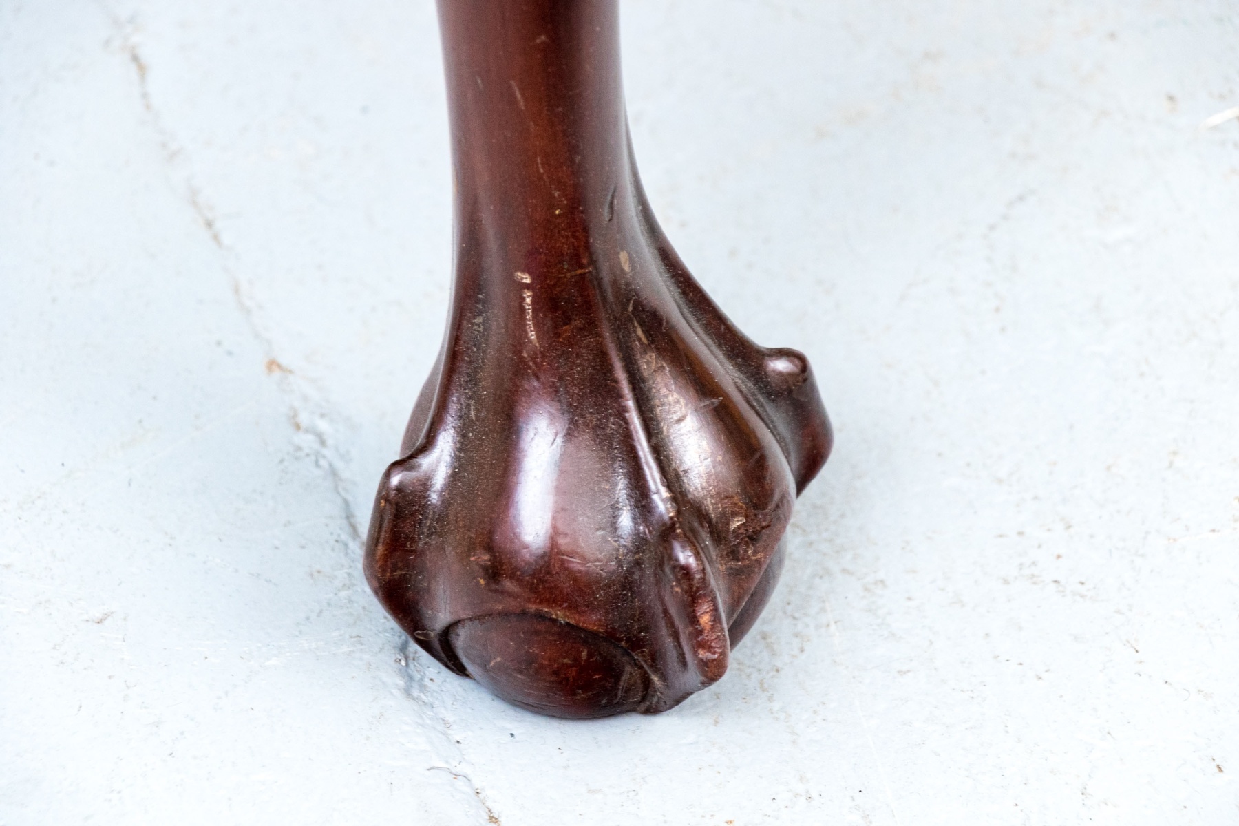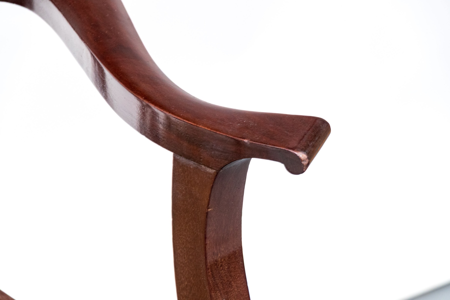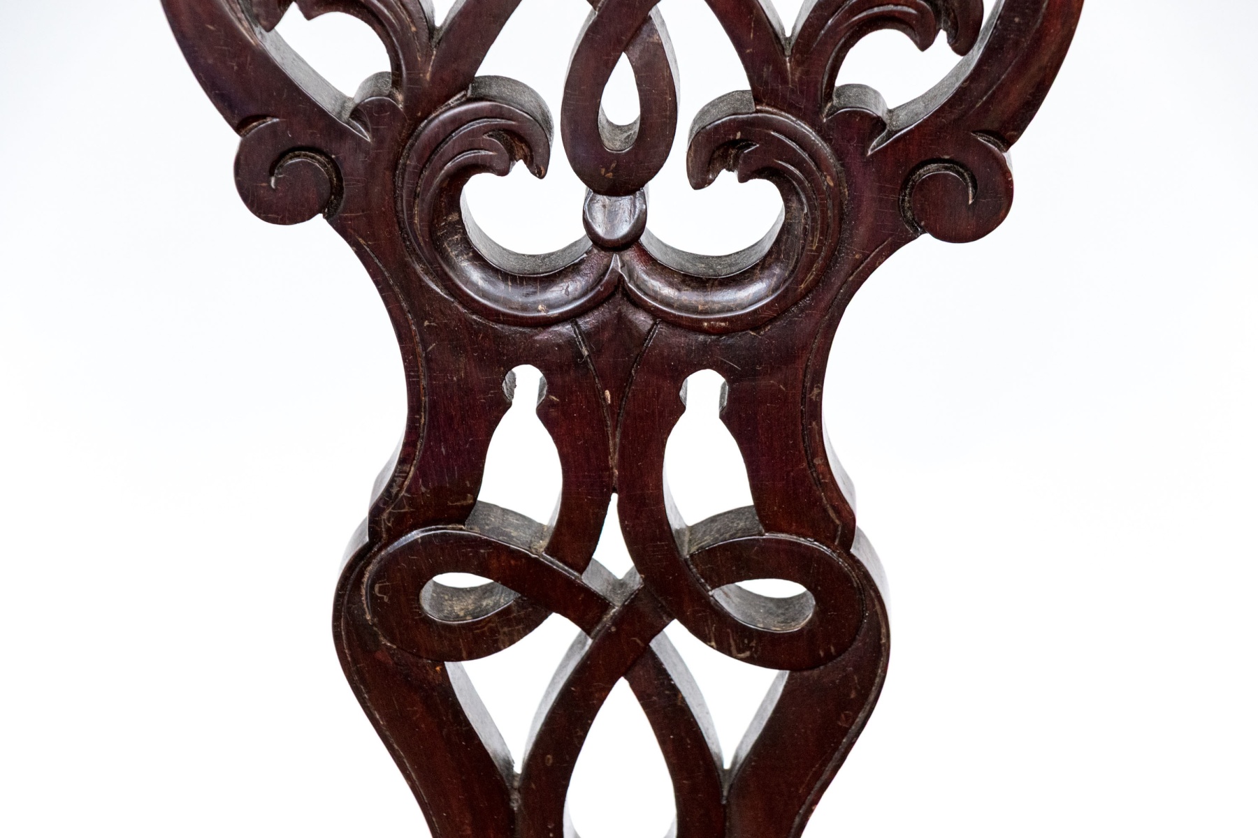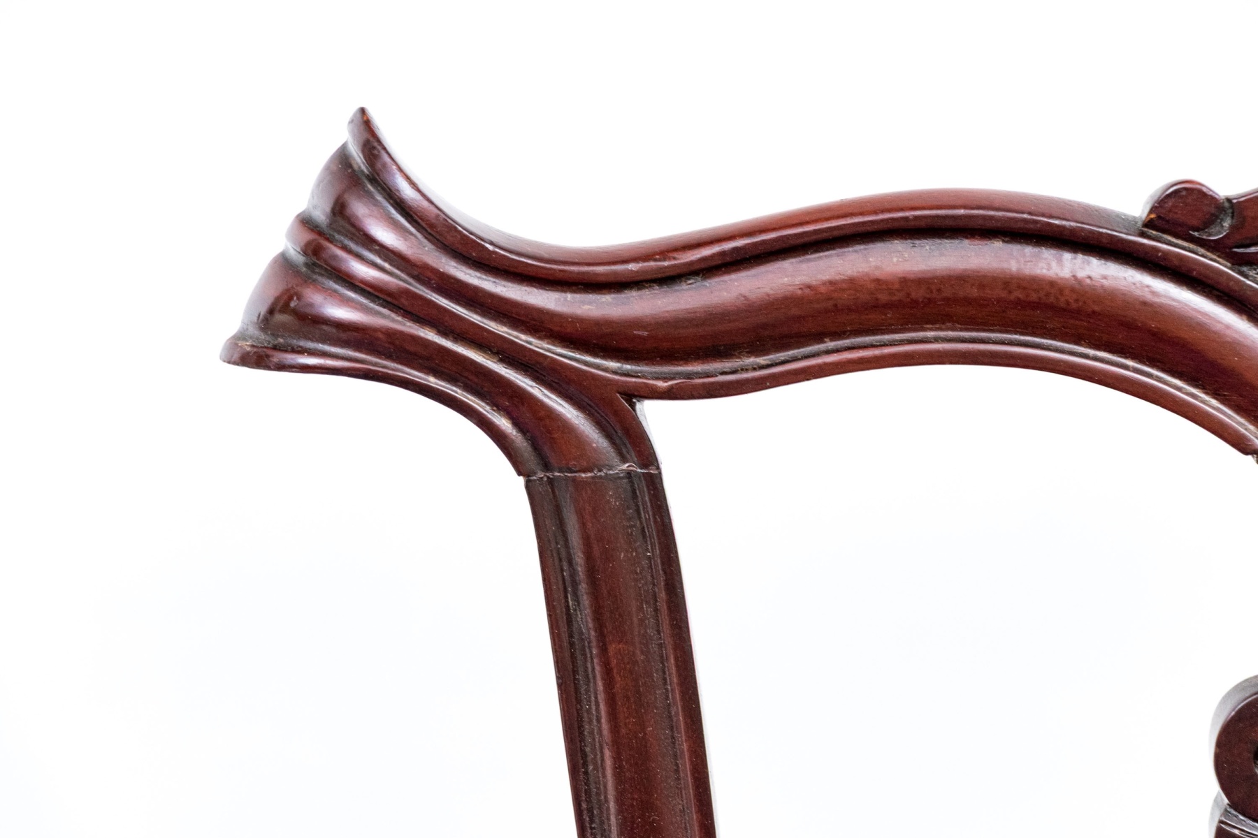 Condition: Please see detail photos. Various signs of acceptable age and use include an old repair to one seat back, one seat with a faint ring mark, marks to the seats, scratches and wear to front edge, legs, knees and arms. The aforementioned is for accuracy as the set retains a strong Chippendale presentation. The joinery is strong and solid.