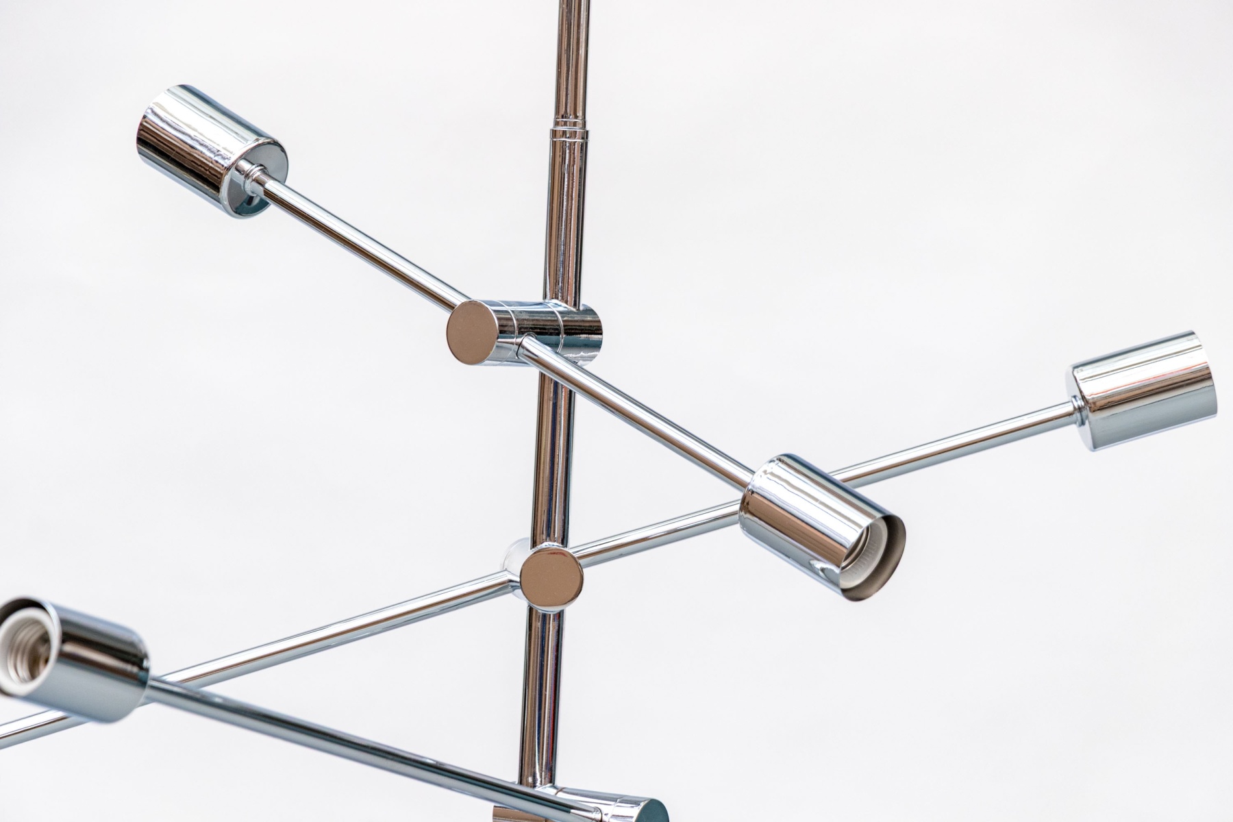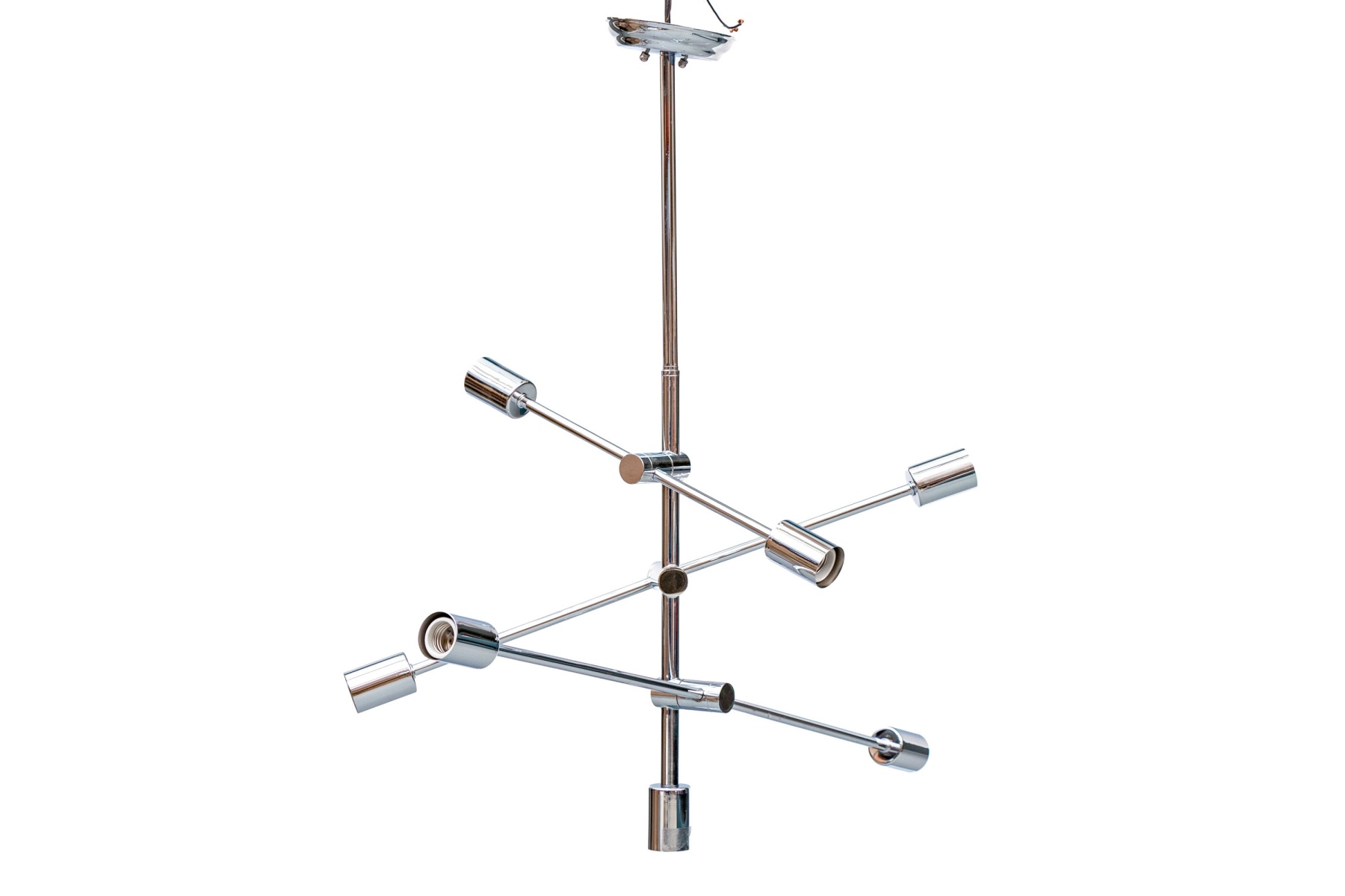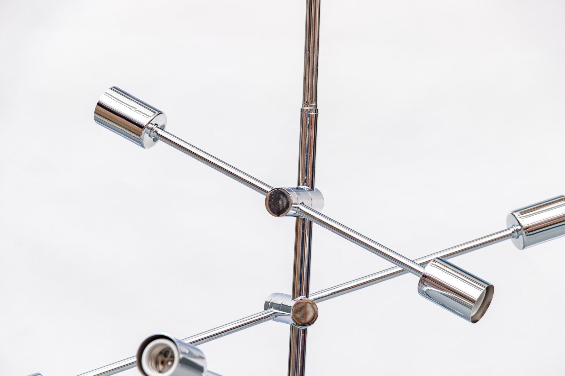 Of modern form with chrome finishes. Ceiling mounted with central post having three horizontal branches with a light on each end. Each of the horizontal arms can be tilted in varied positions to your liking.