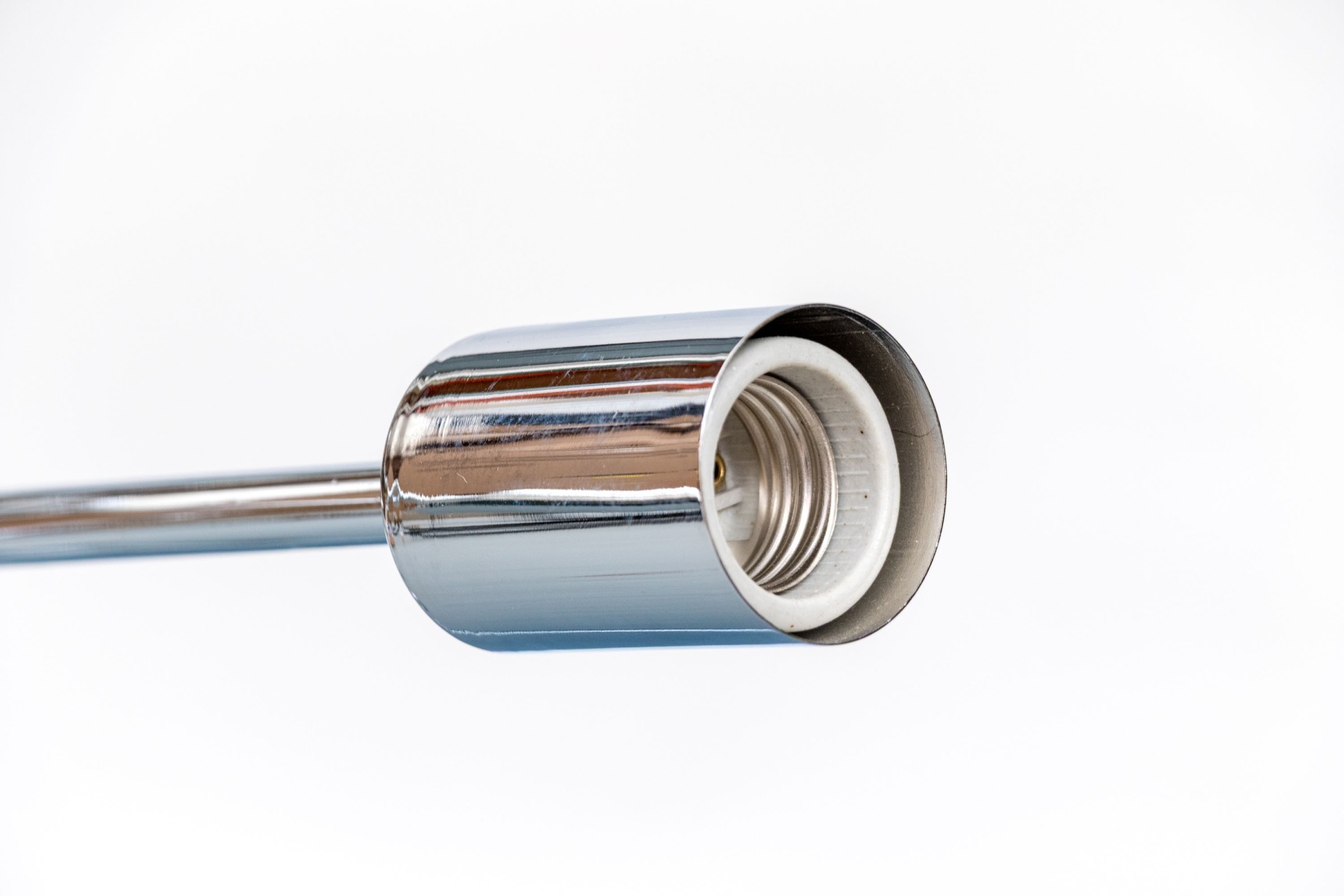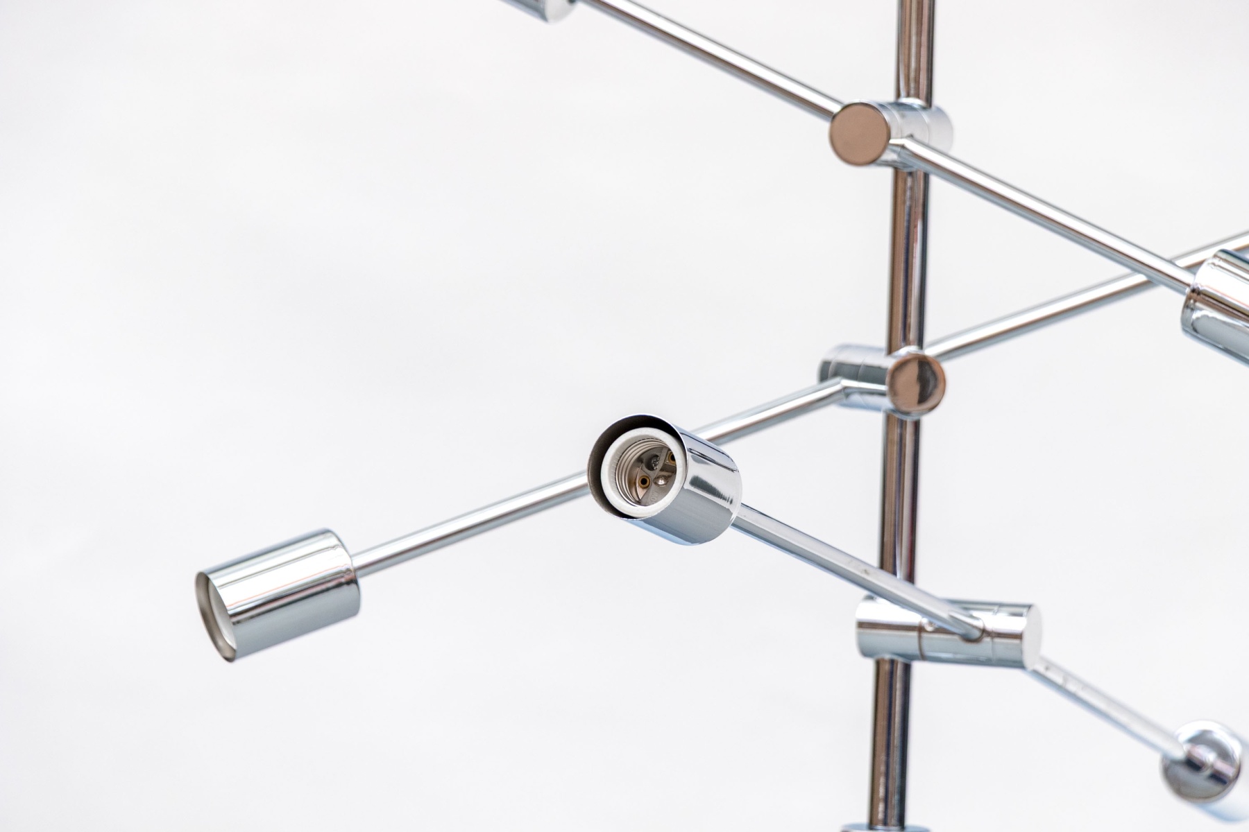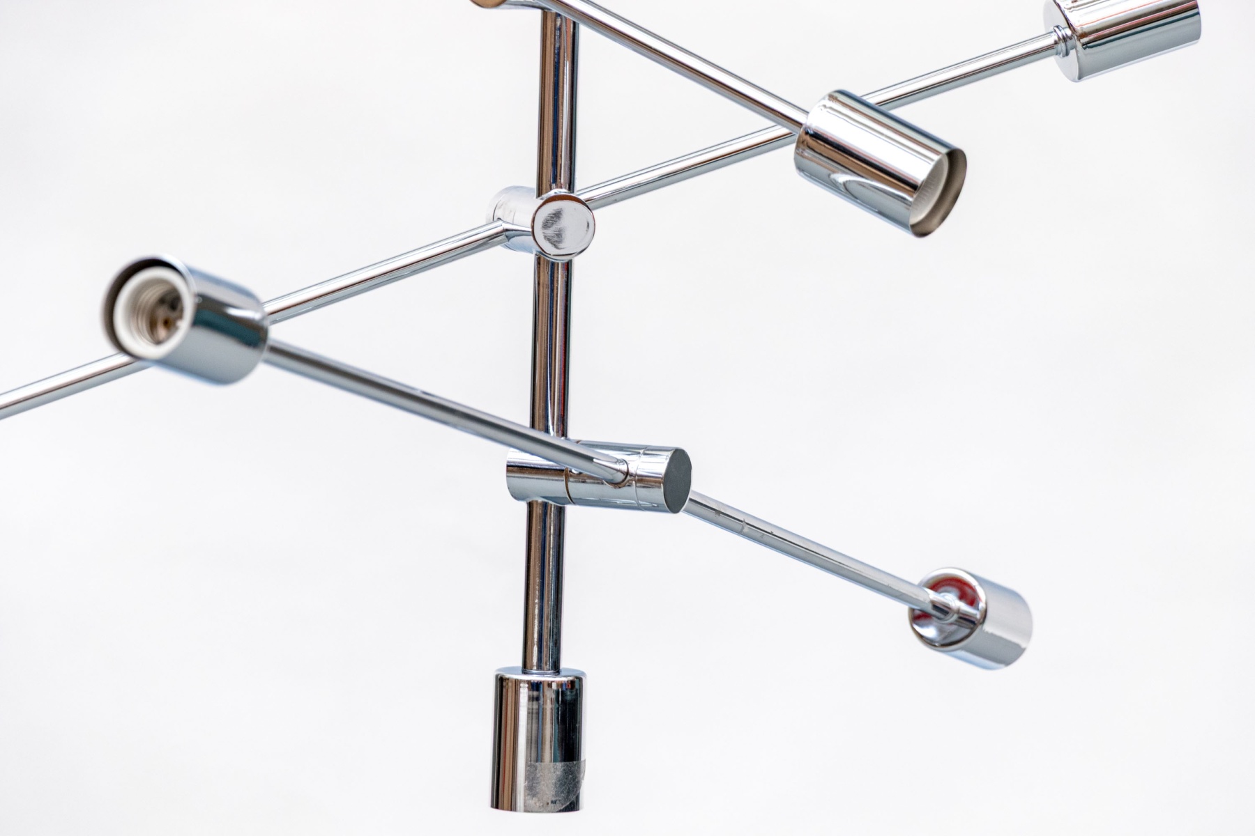 Of modern form with chrome finishes. Ceiling mounted with central post having three horizontal branches with a light on each end. Each of the horizontal arms can be tilted in varied positions to your liking.