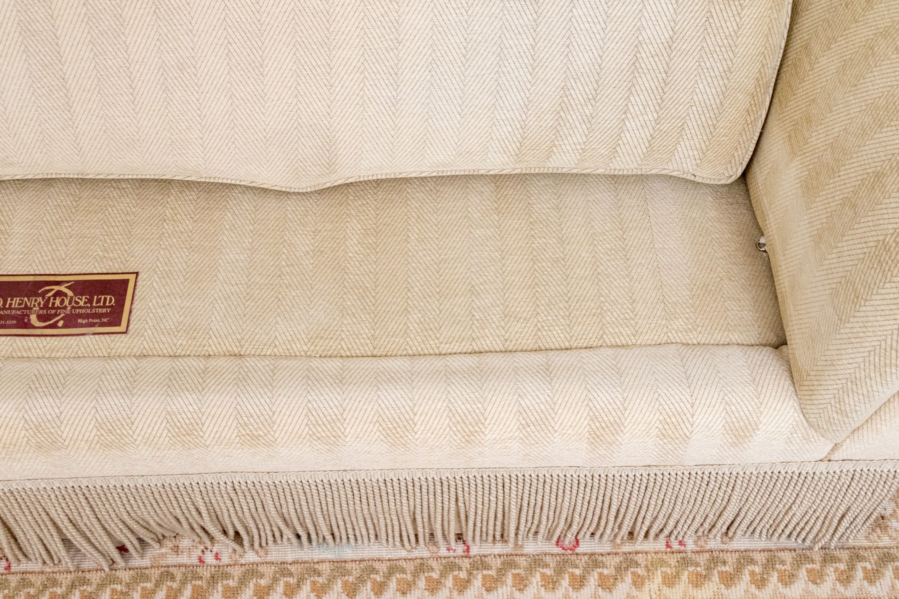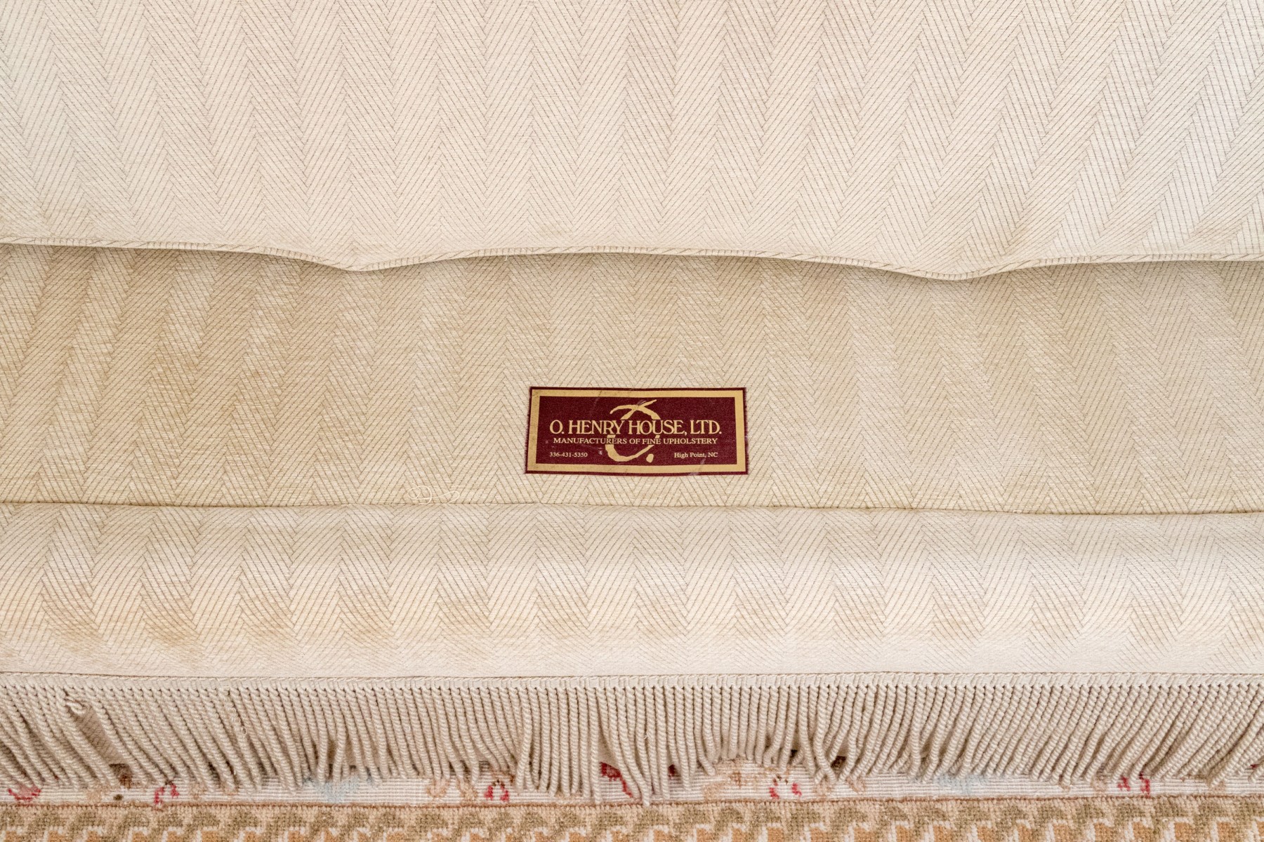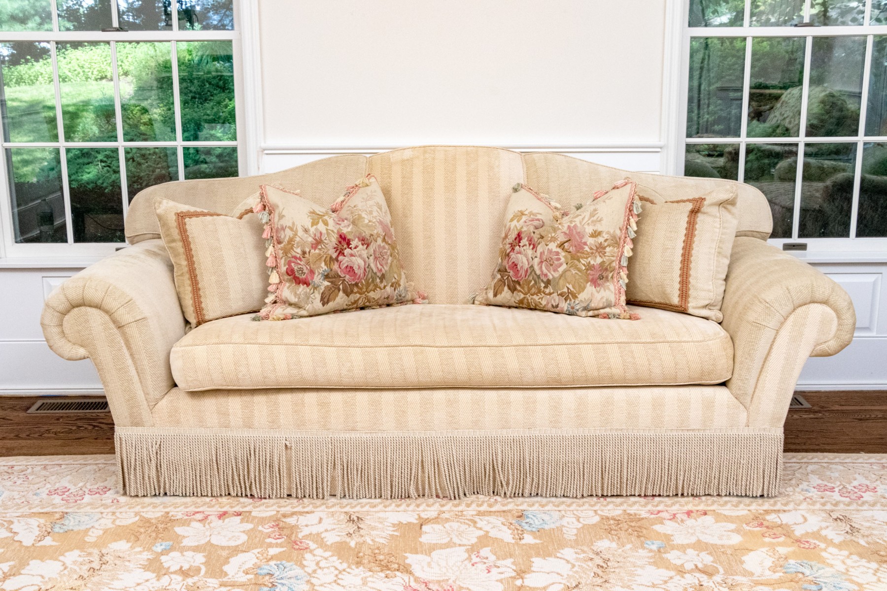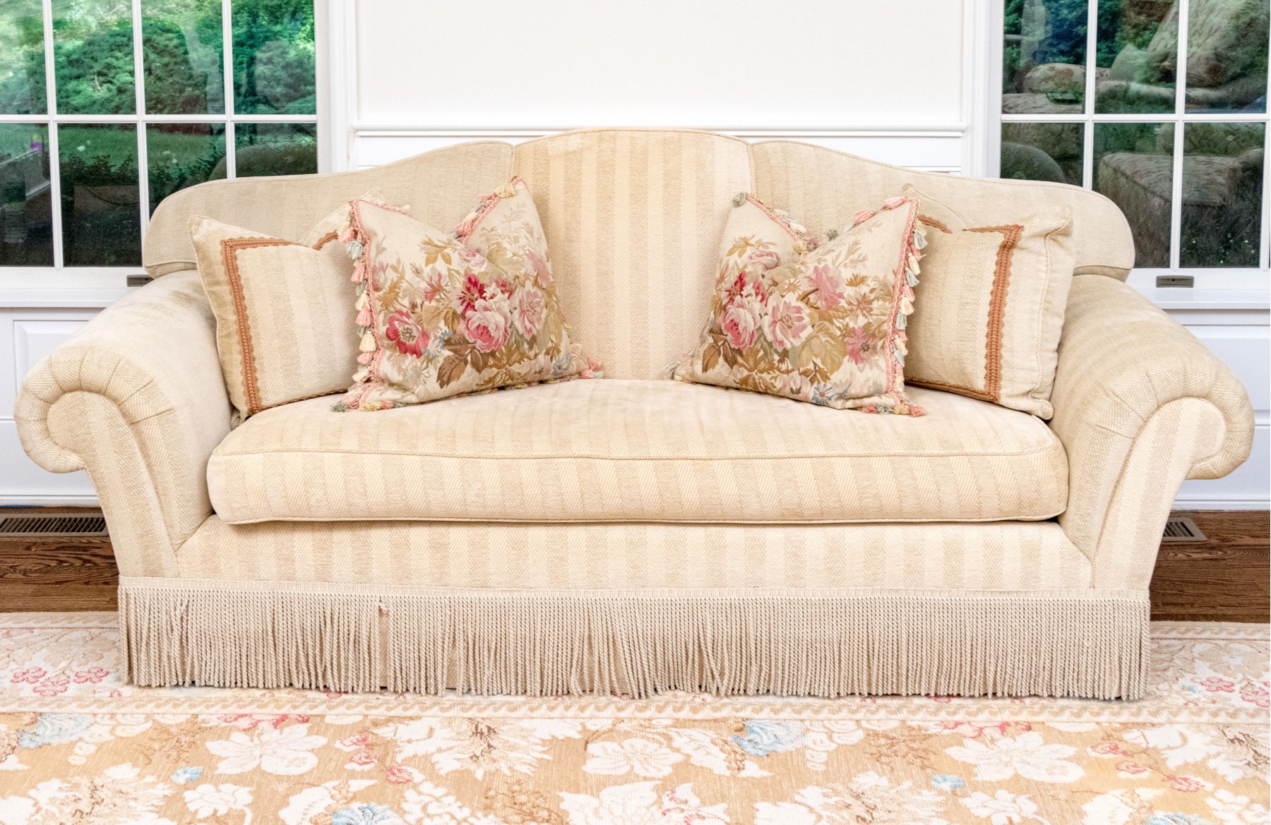 O. Henry House Ltd. elegant sofa with a plush camelback form, rolled arms, and a fringe skirt. Upholstered in cream with herringbone striped patterns. Accompanied by two pairs of complementing accent pillows.
