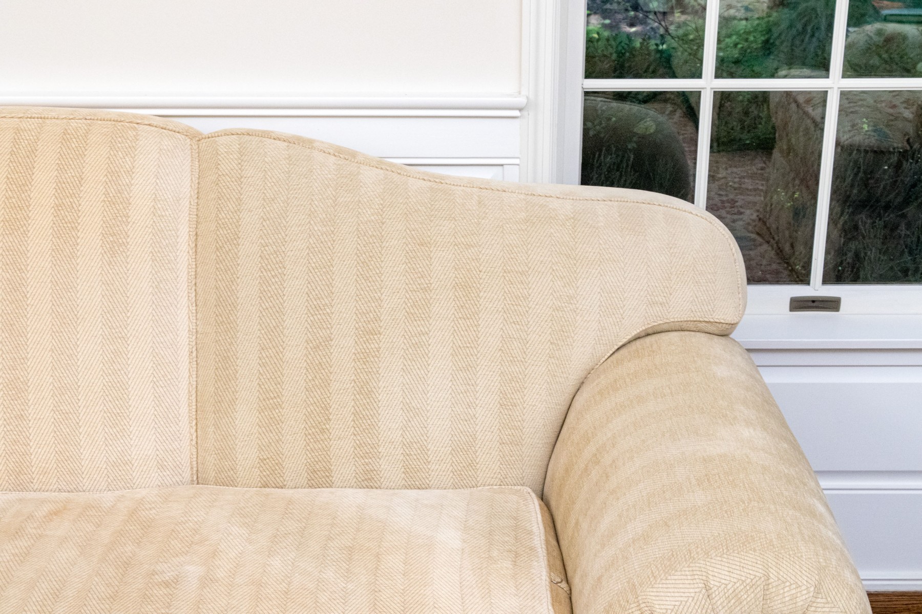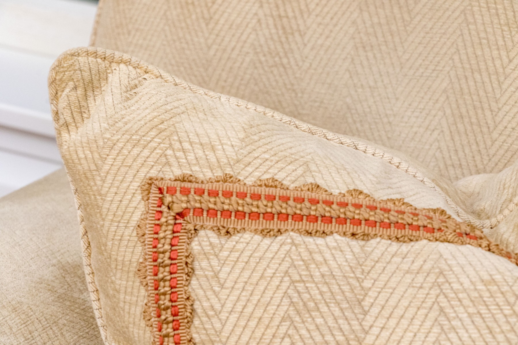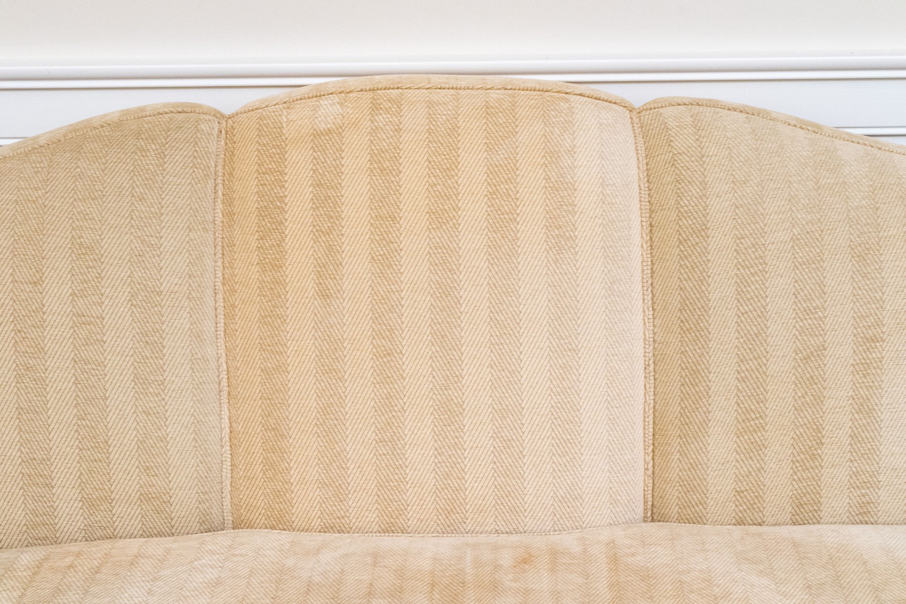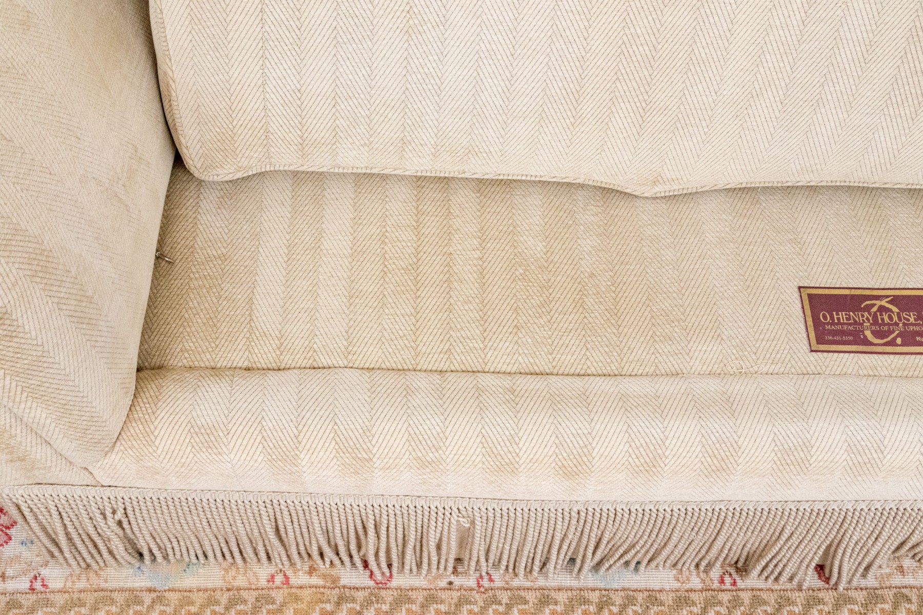 O. Henry House Ltd. elegant sofa with a plush camelback form, rolled arms, and a fringe skirt. Upholstered in cream with herringbone striped patterns. Accompanied by two pairs of complementing accent pillows.
