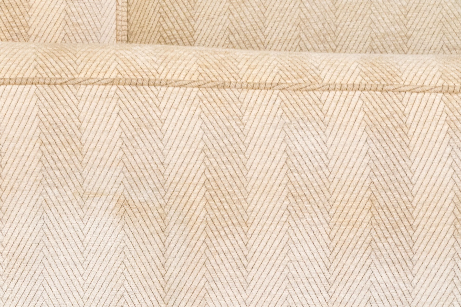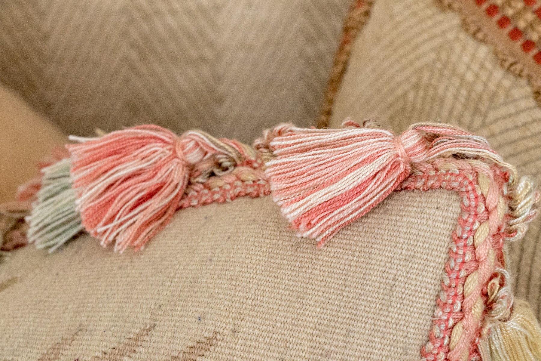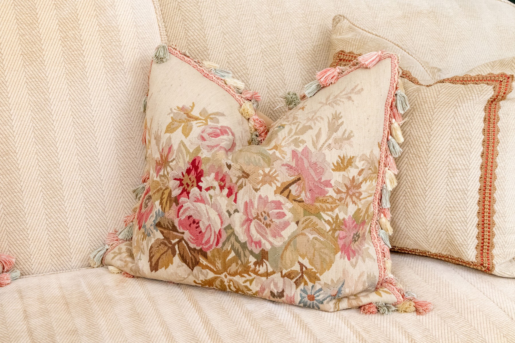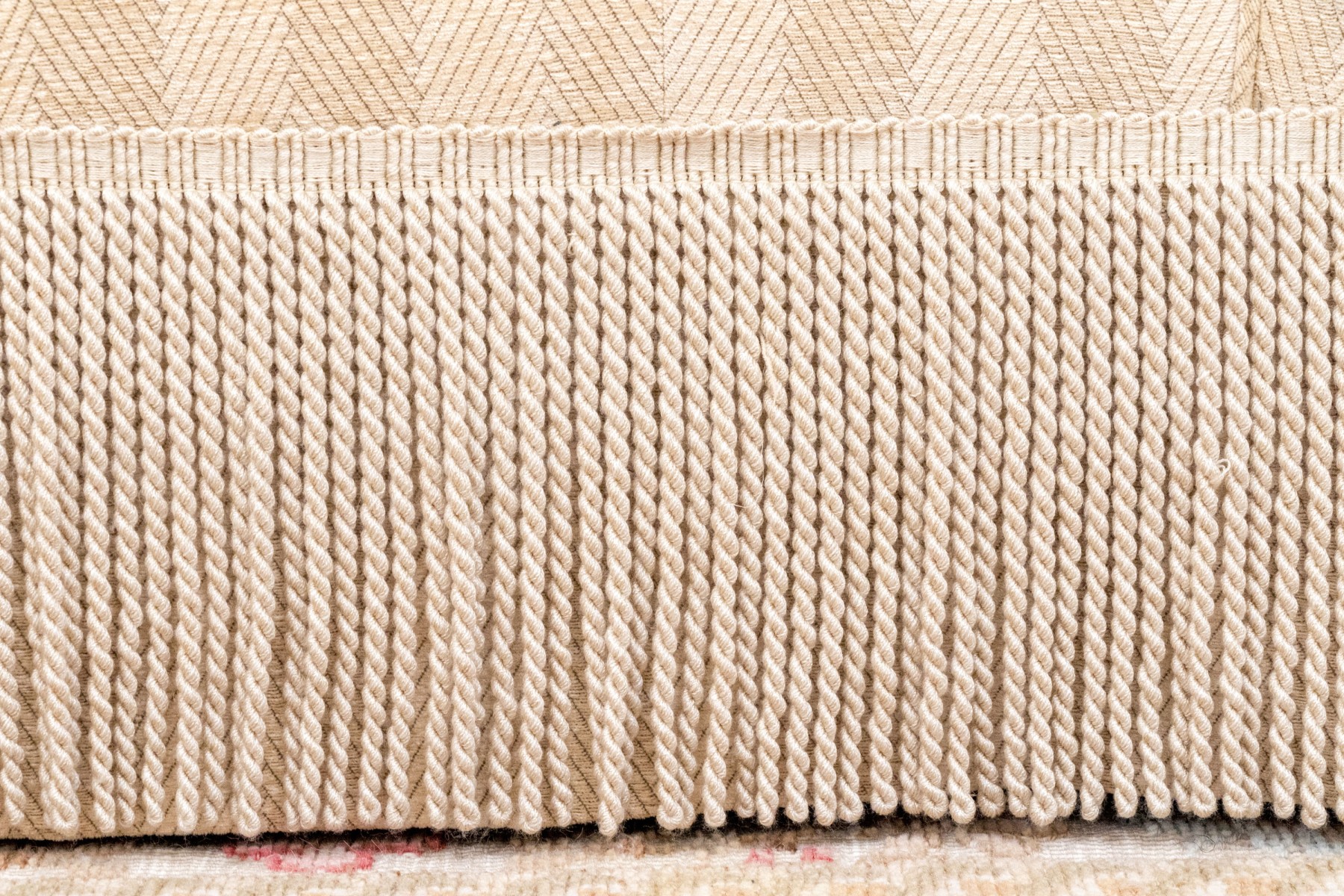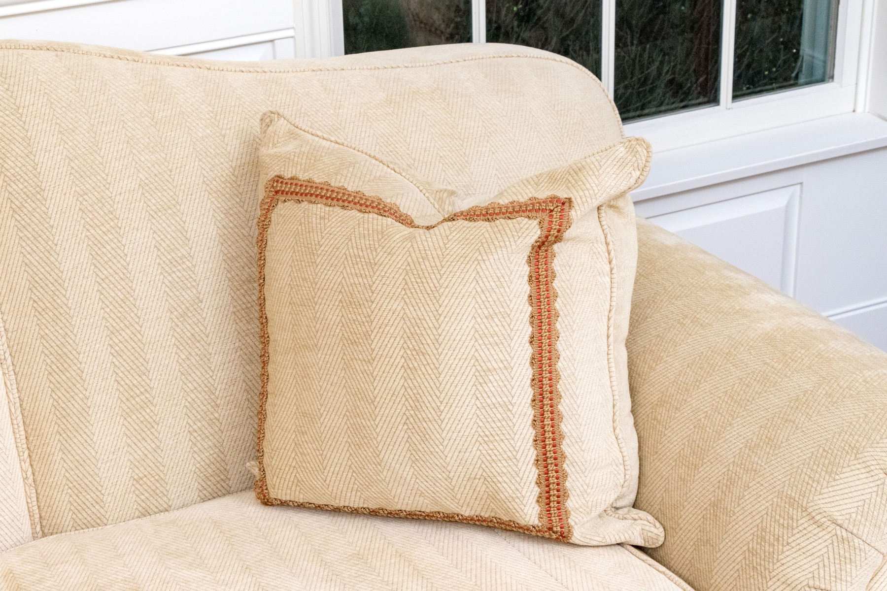 On four legs with rope turned tasseled skirt to conceal the underneath. The sofa has a camel back with rolled arms. Upholstered in a wonderful herringbone motif. The sofa has a single upholstered seat cushion and two pairs of decorative accent pillows.