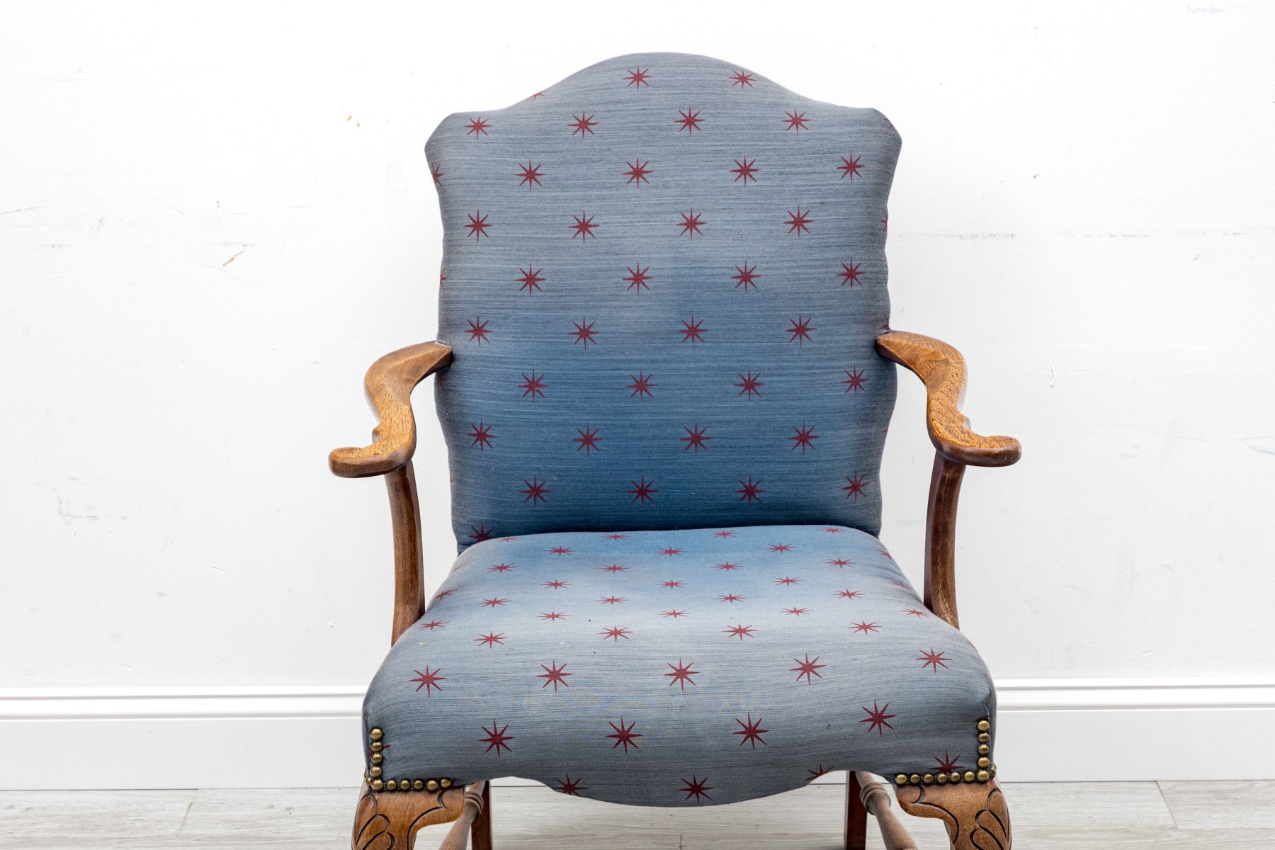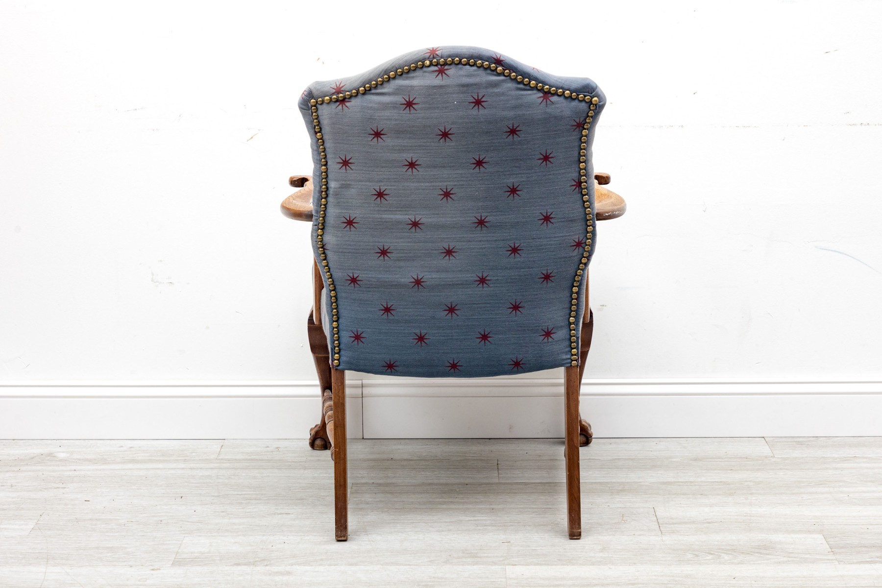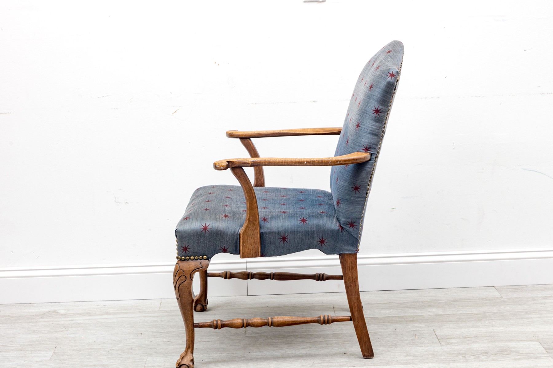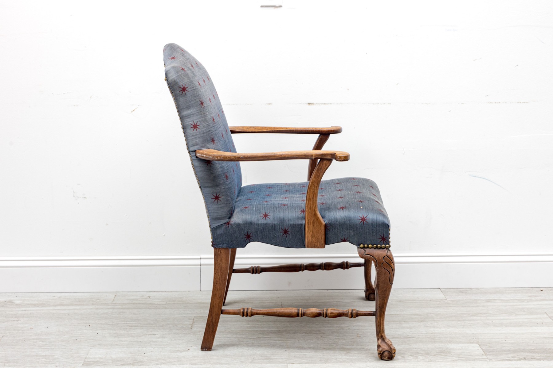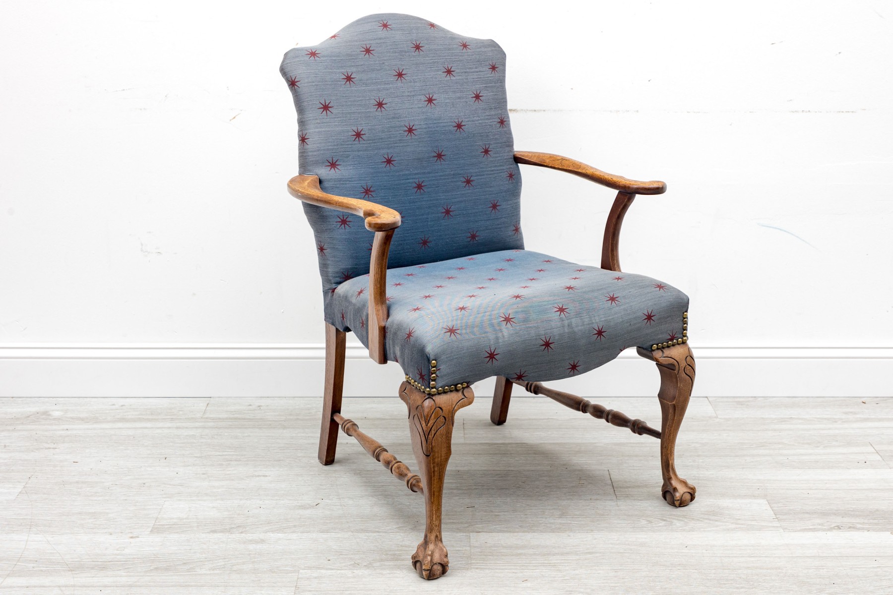 A lovely vintage library armchair upholstered in navy blue upholstery accented by red star vectors and brass nail-head trim. Its oak wood frame is distinguished by ball & claw cabriole front legs supported by lathe-turned cross stretchers.