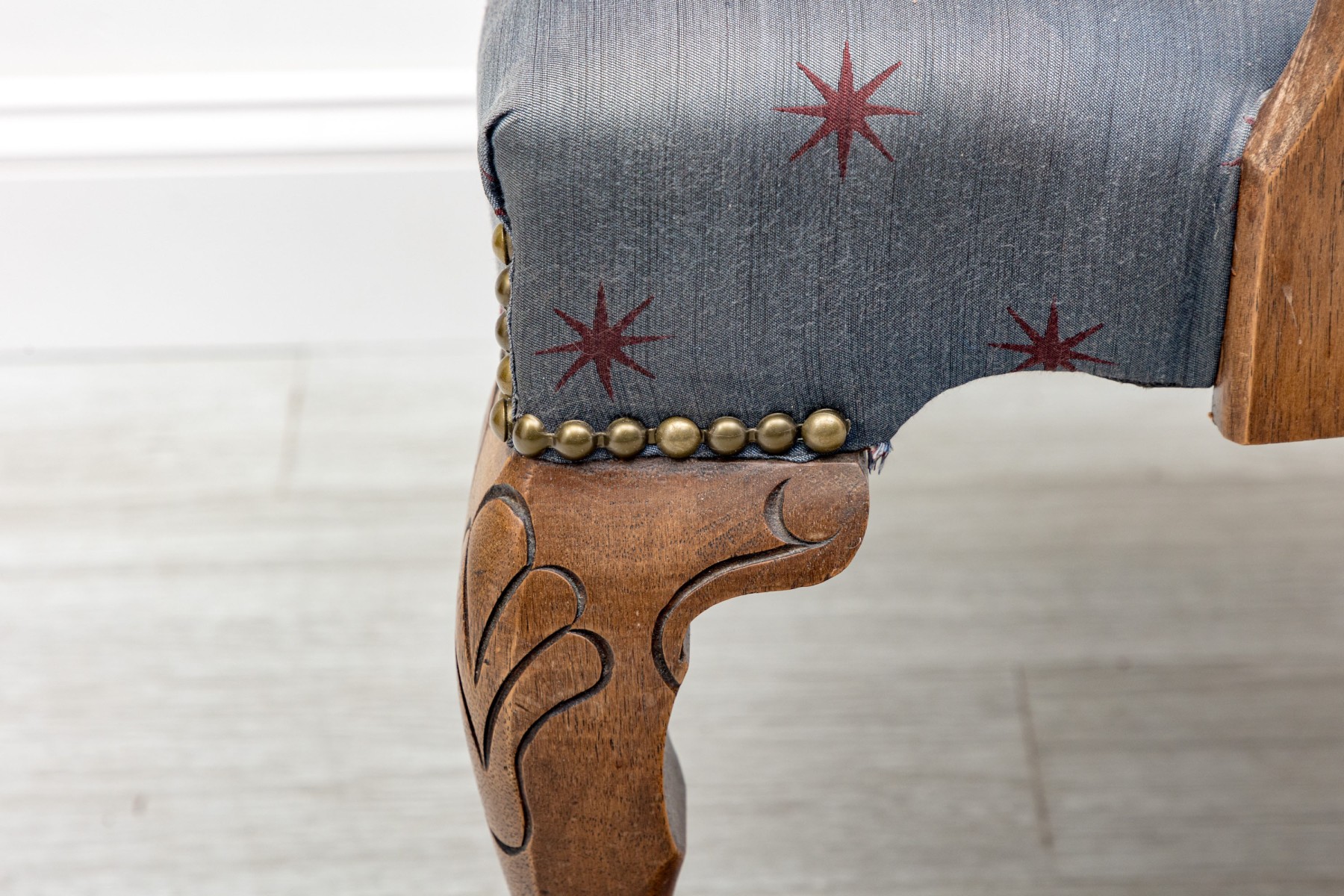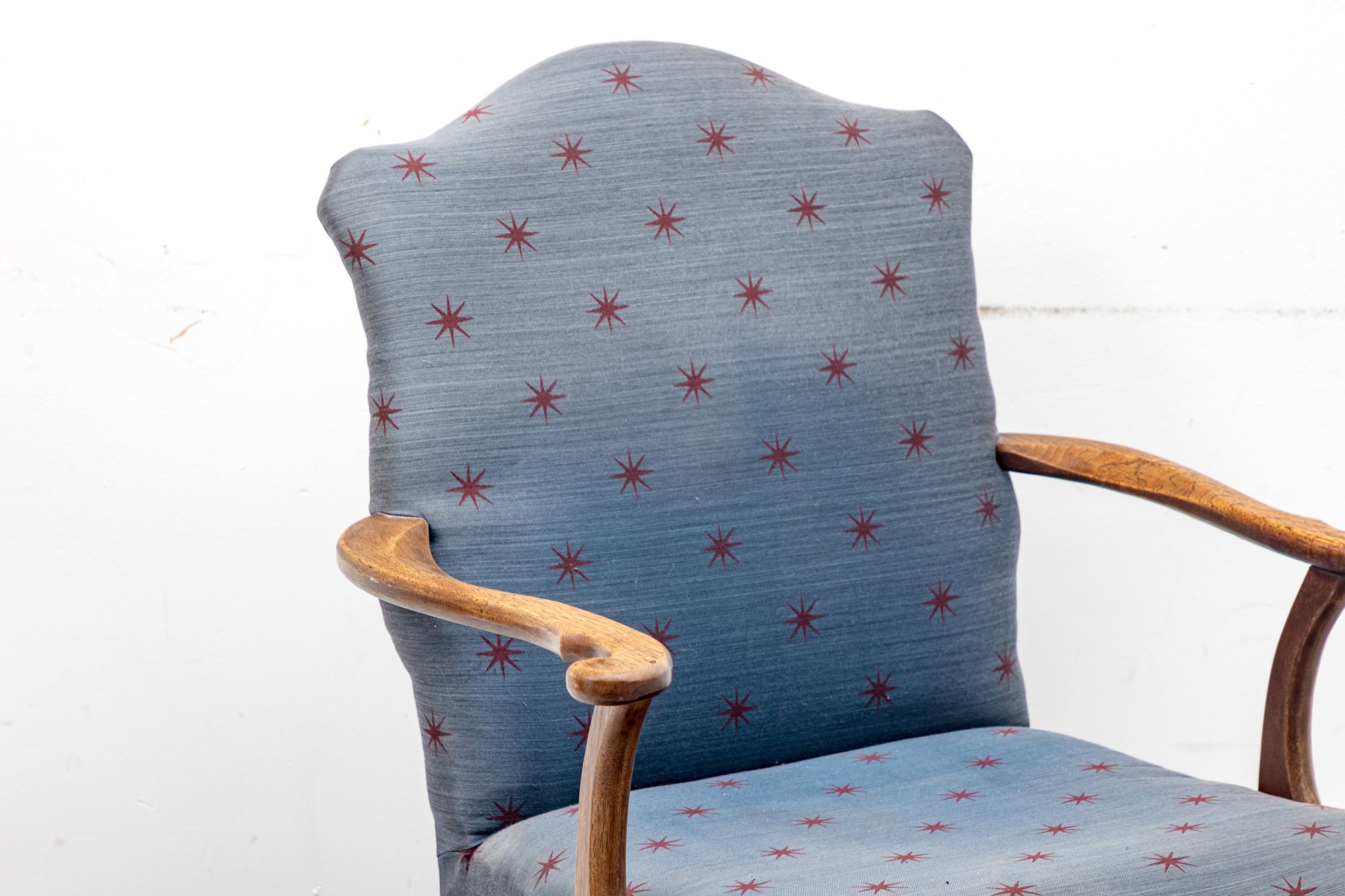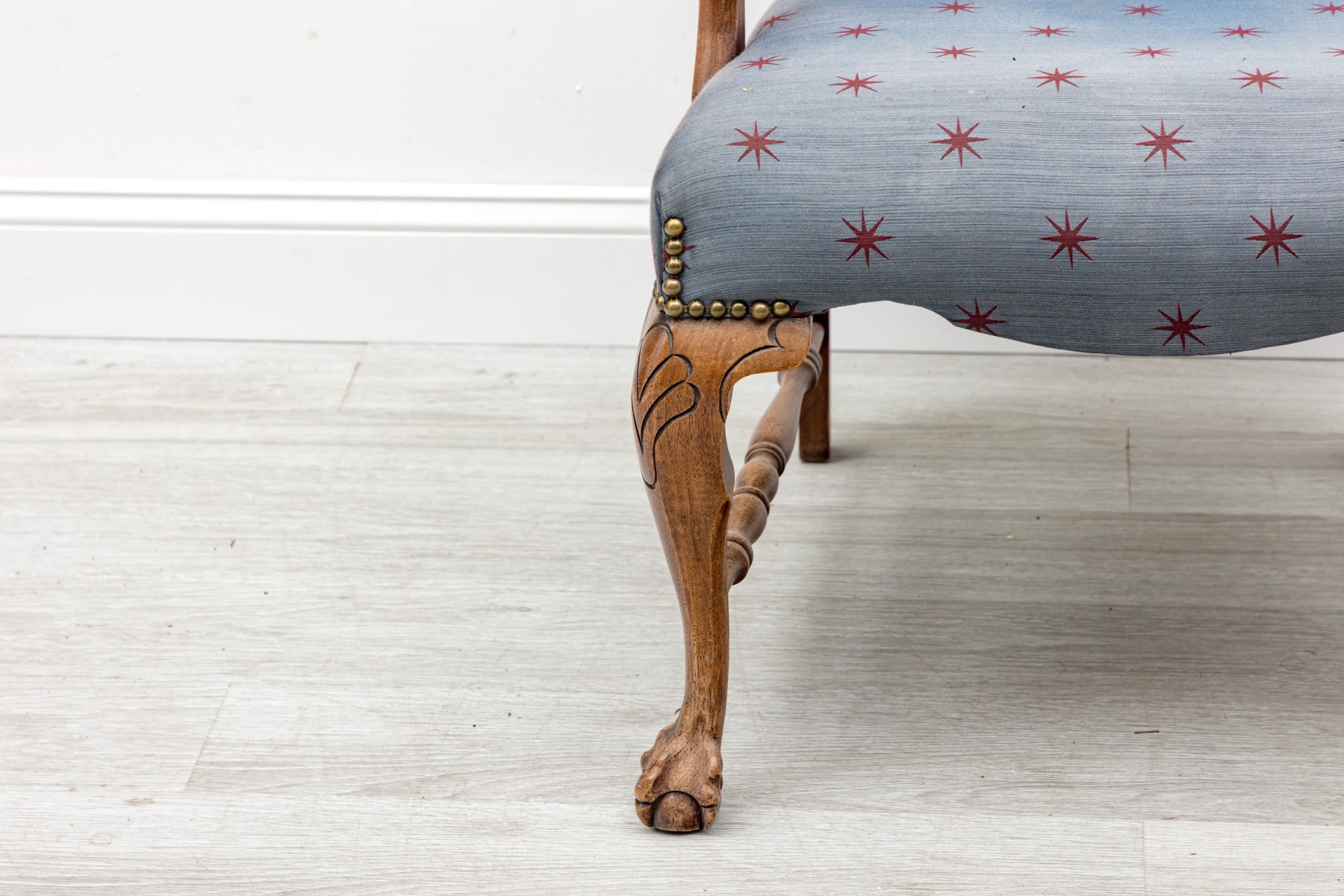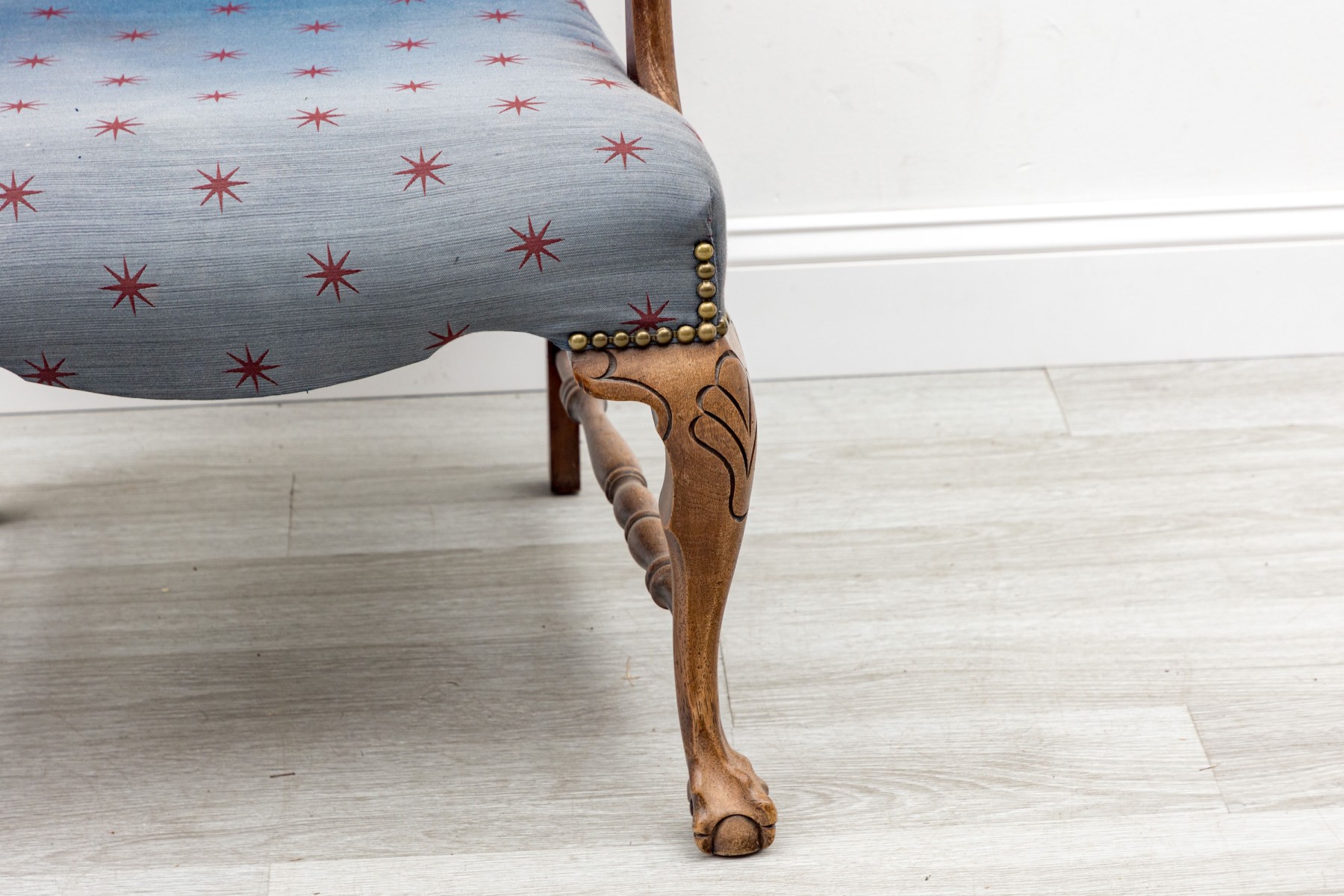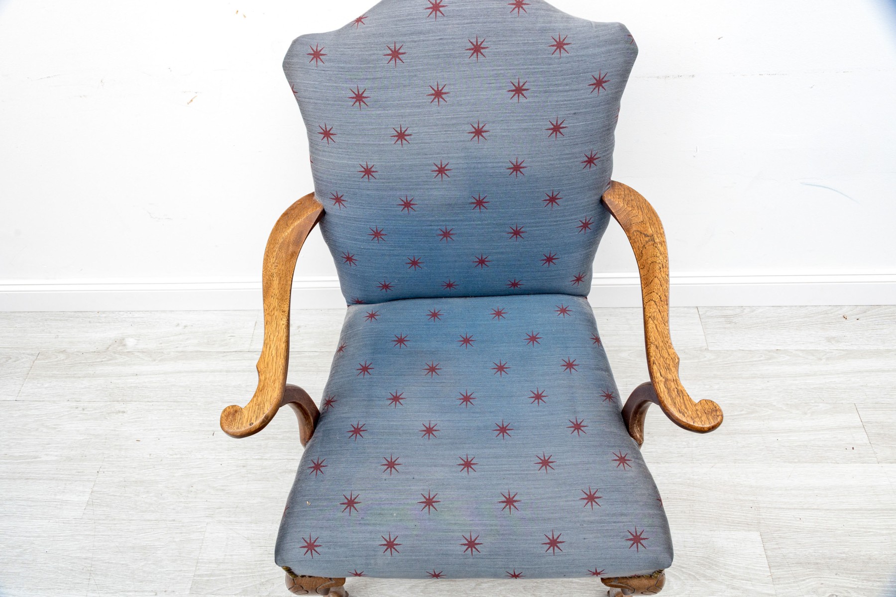 A lovely vintage library armchair upholstered in navy blue upholstery accented by red star vectors and brass nail-head trim. Its oak wood frame is distinguished by ball & claw cabriole front legs supported by lathe-turned cross stretchers.