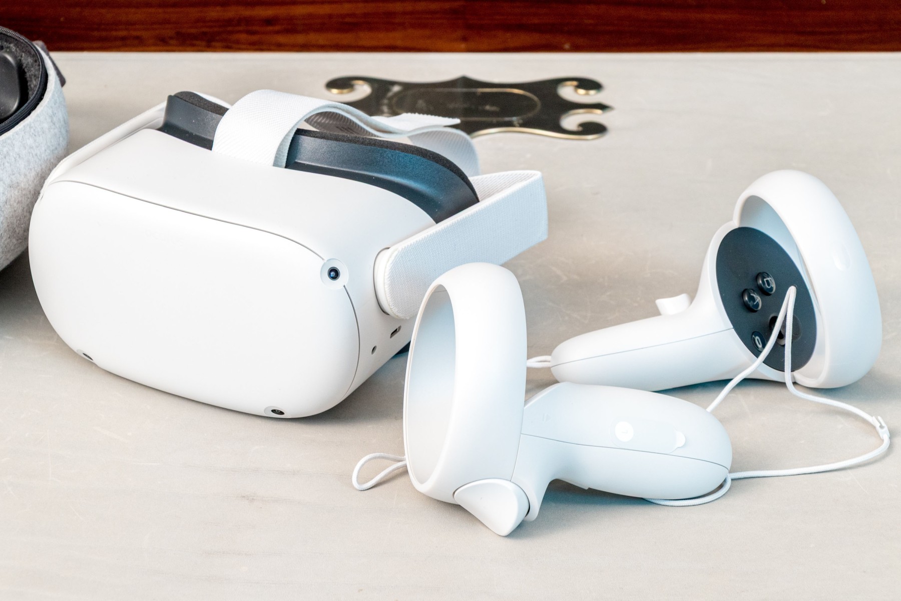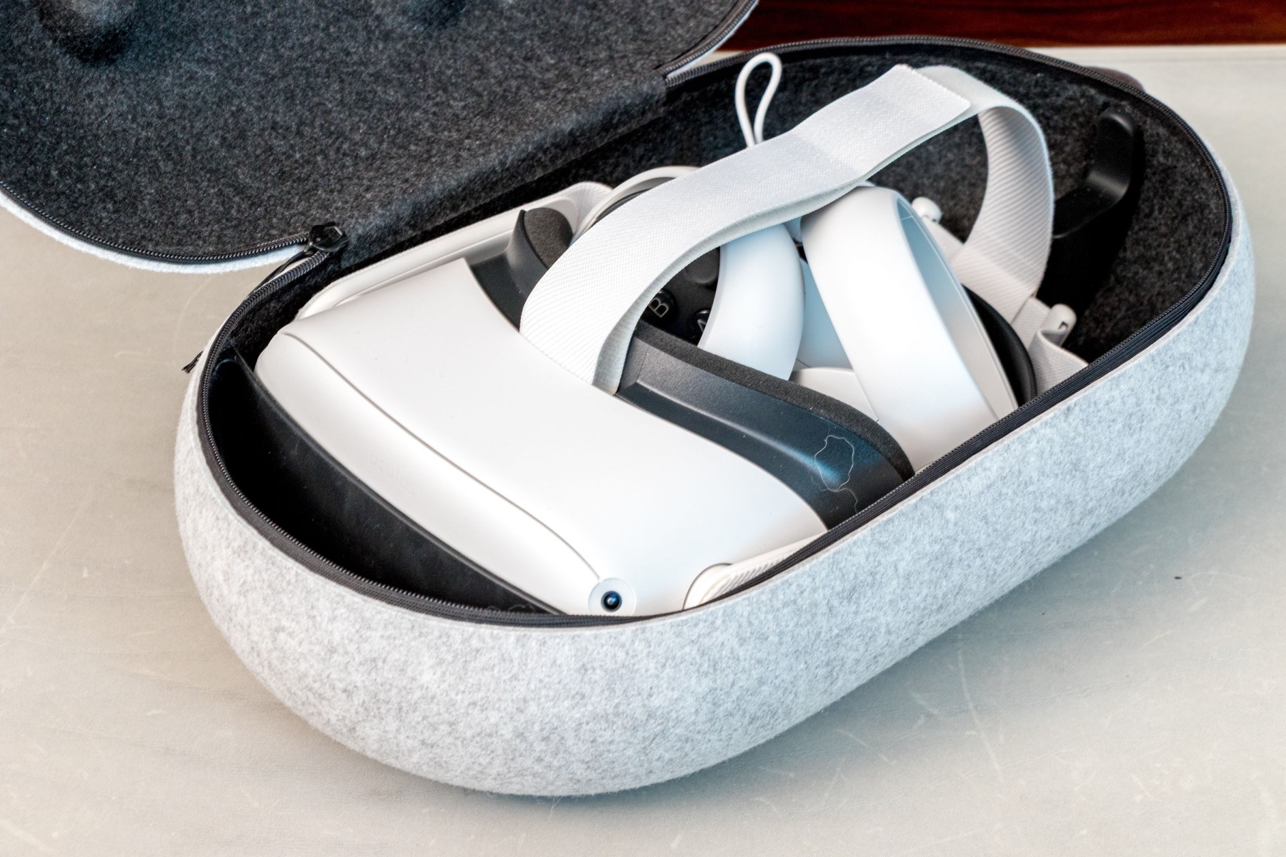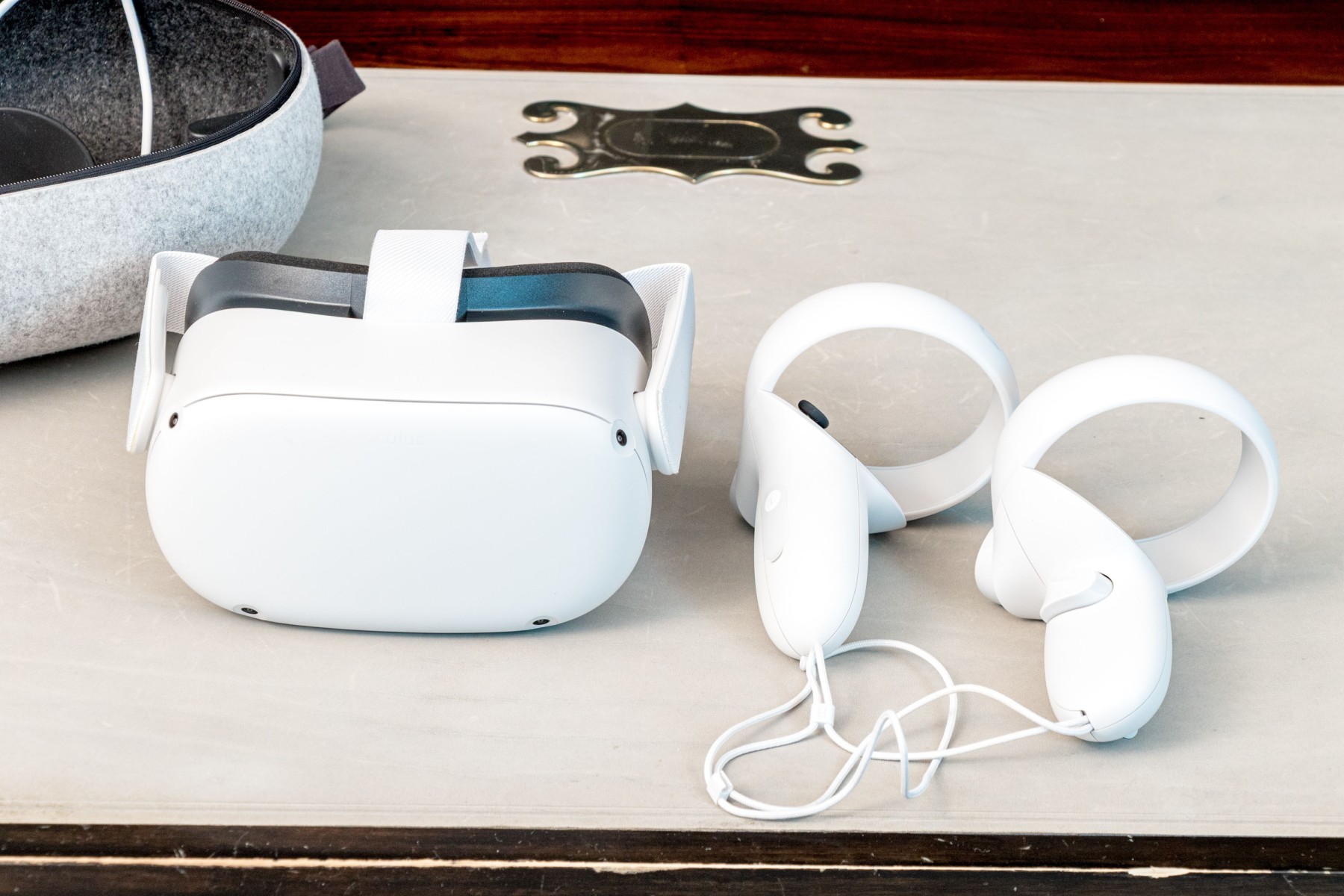 Oculus Meta Quest 2 VR headset with two controllers in classic white with black accents. Includes a zippered protective case.