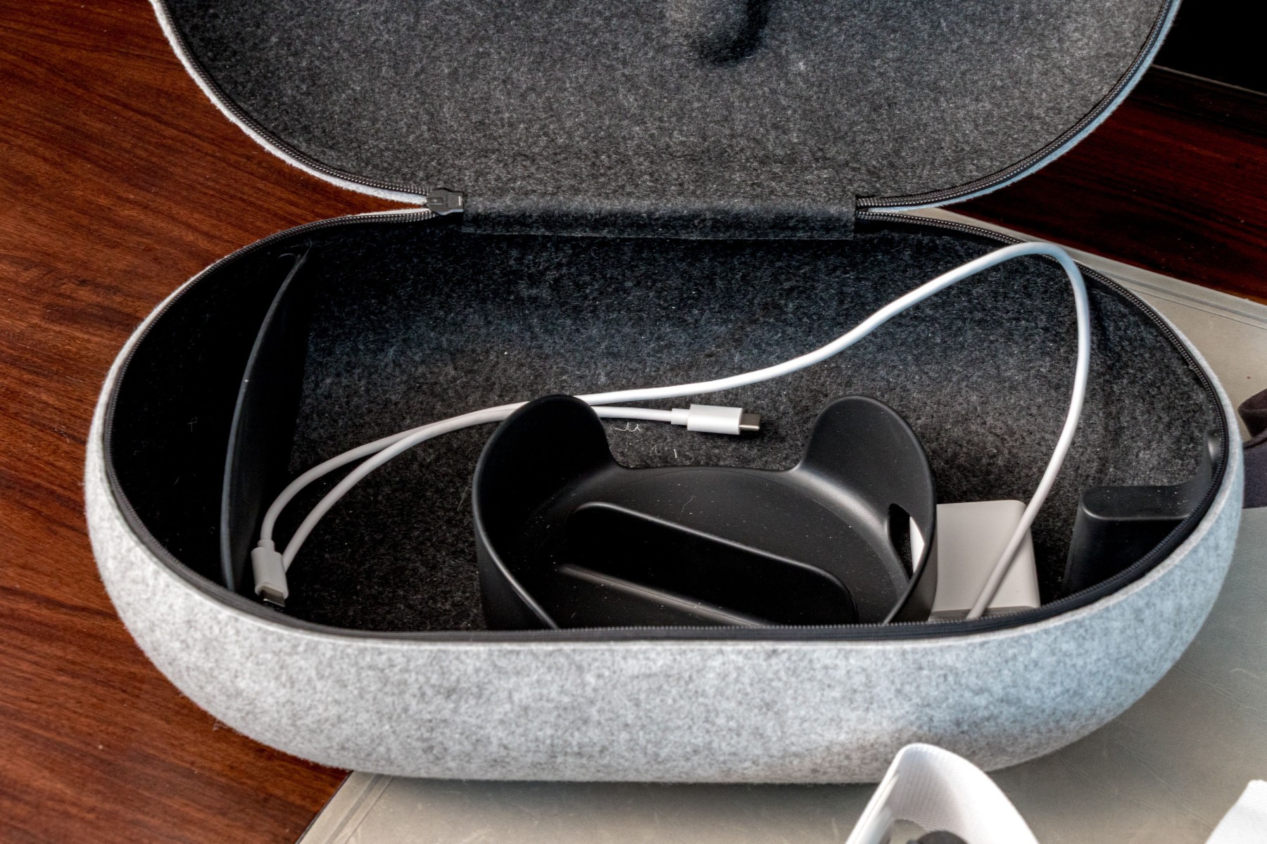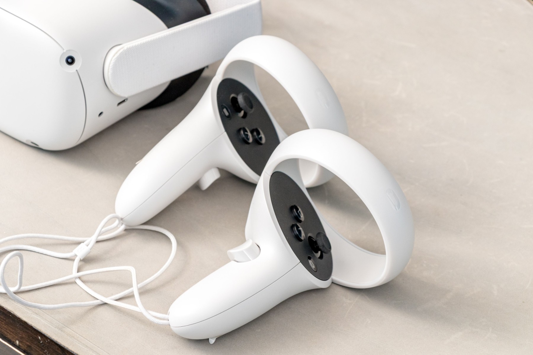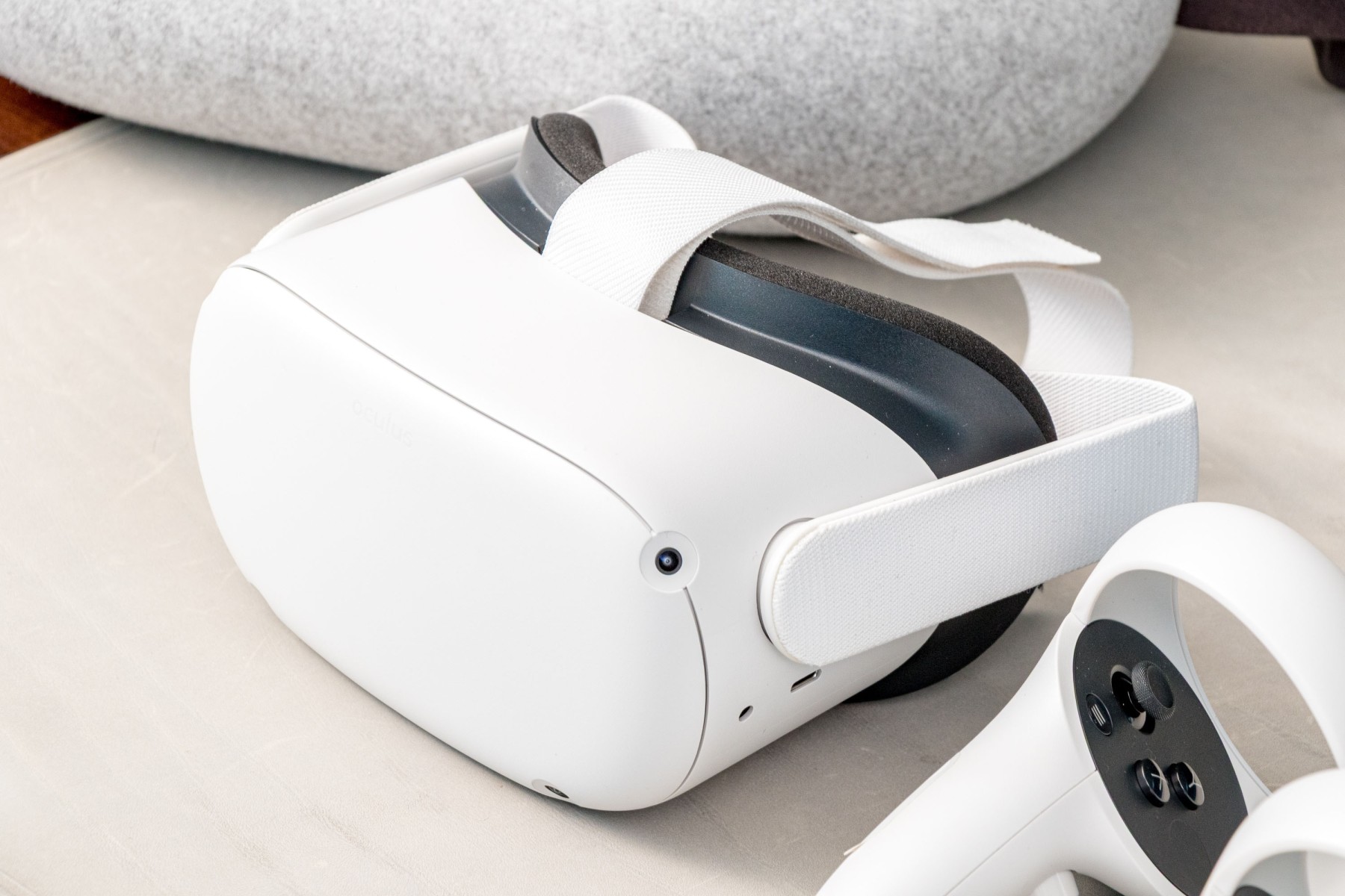 Oculus Meta Quest 2 VR headset with two controllers in classic white with black accents. Includes a zippered protective case.