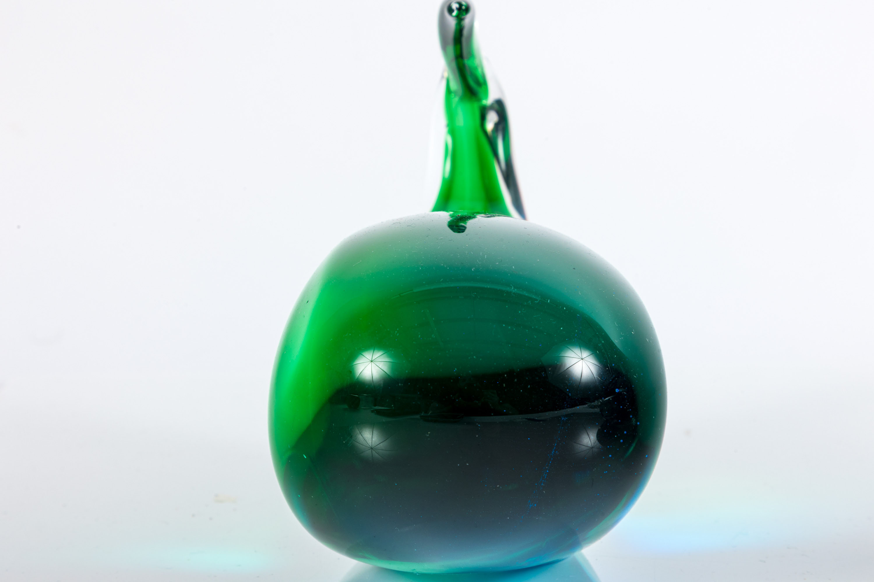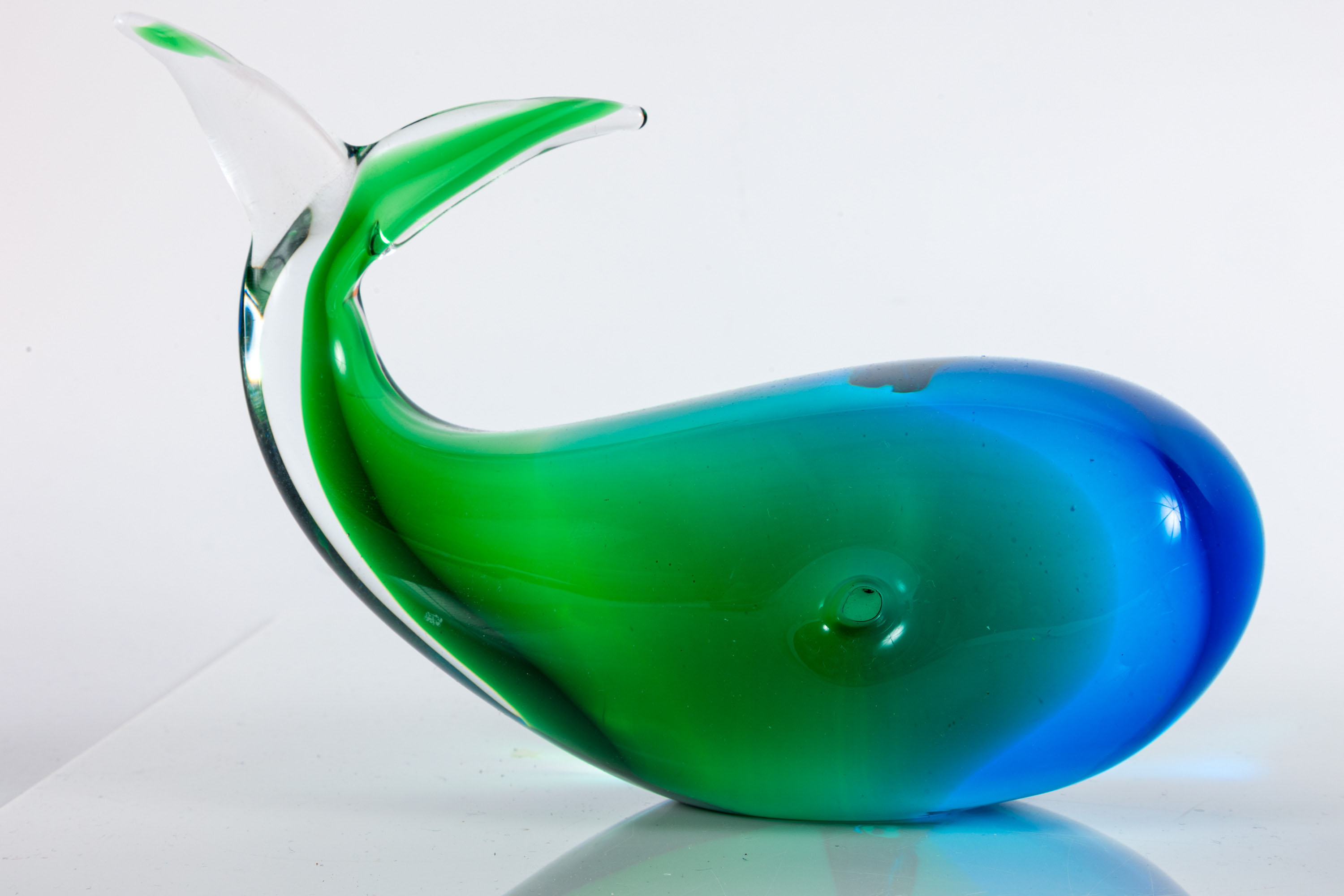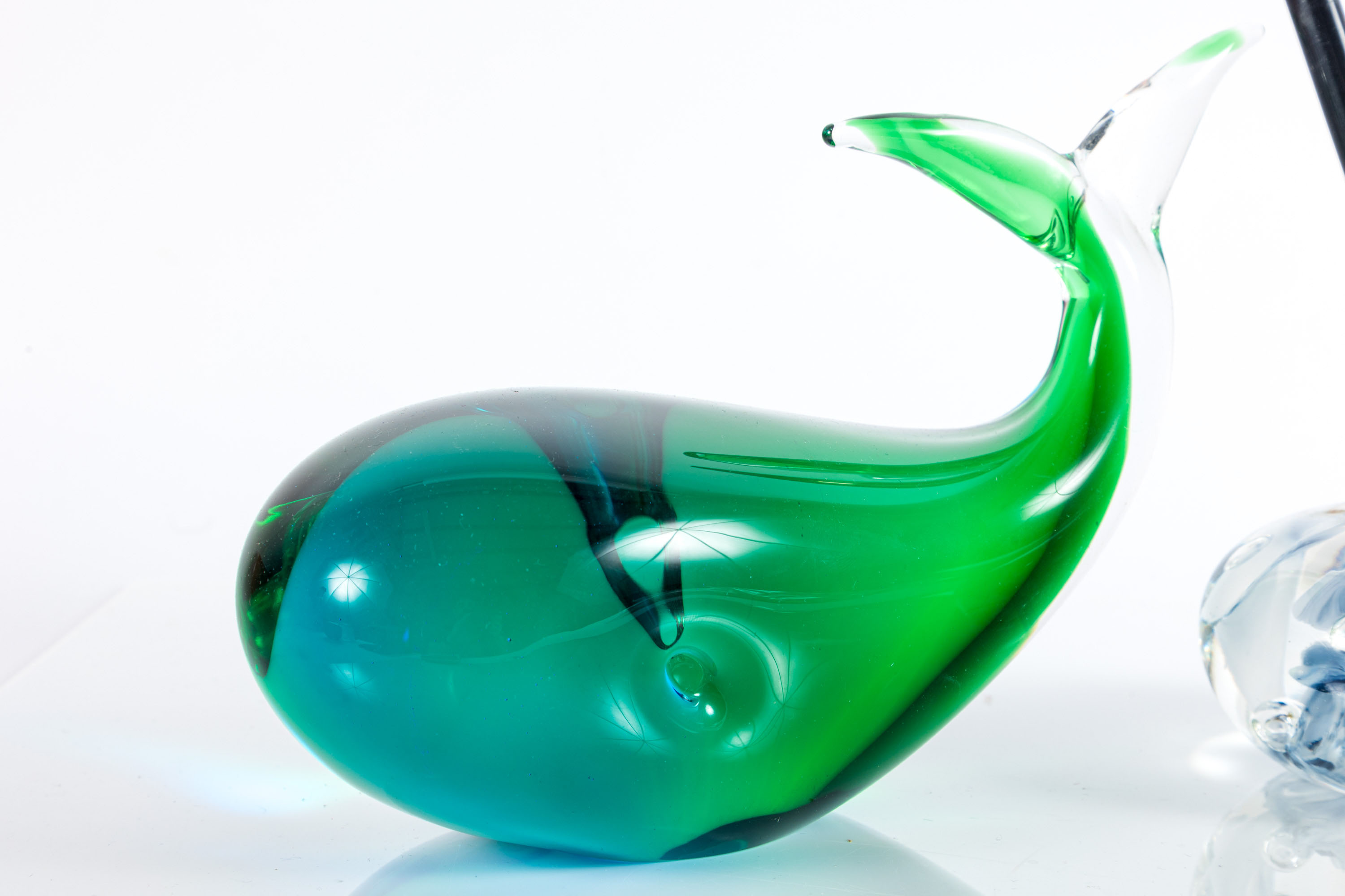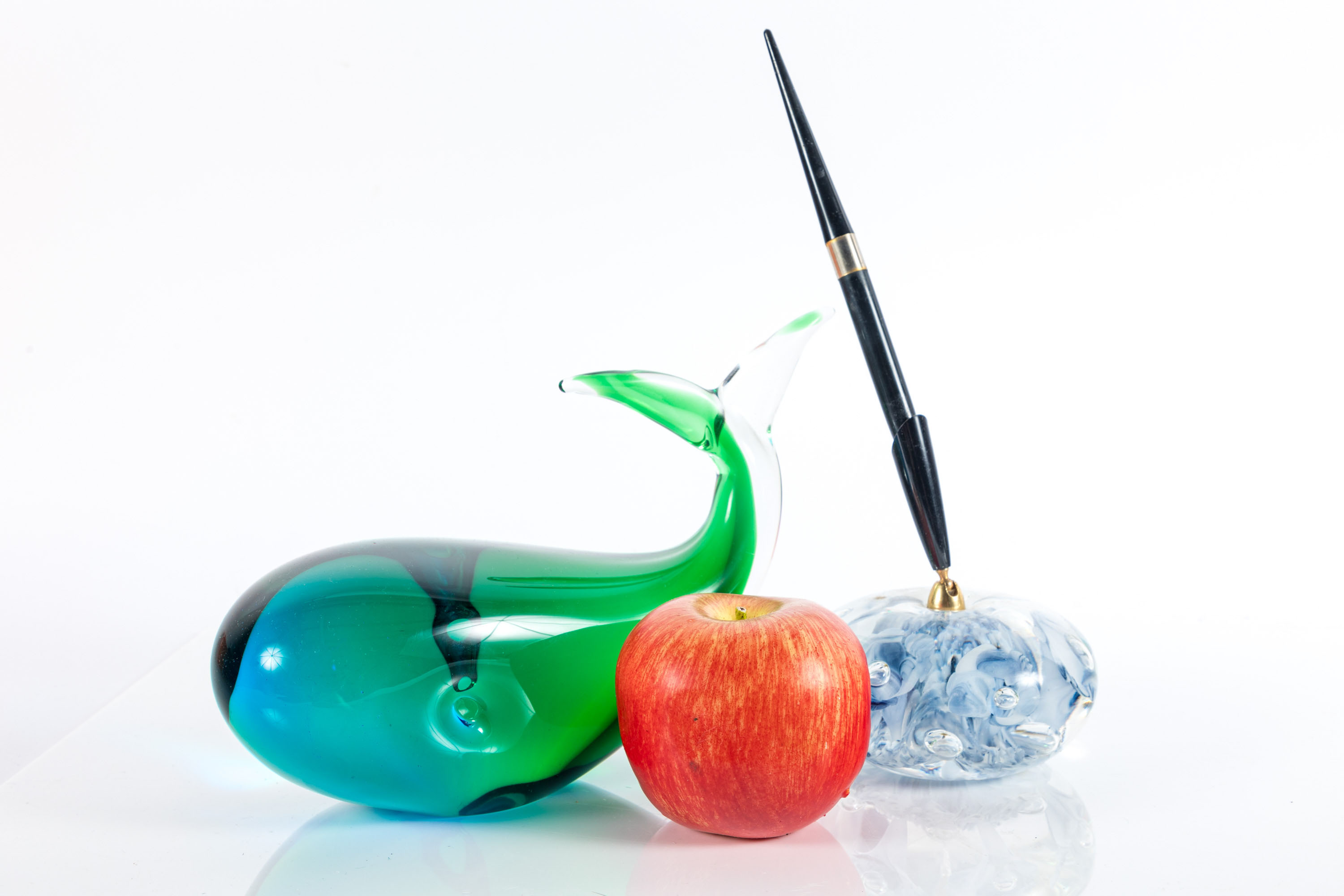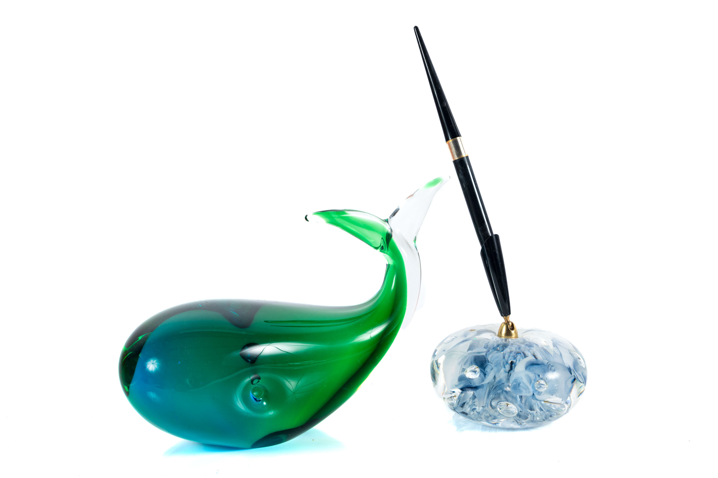 A pairing of art glass desktop items. Features an Oggetti Glass whale sculpture and a Trumpet Flower art glass pen holder attributed to Joe Rice — circa 1970's.