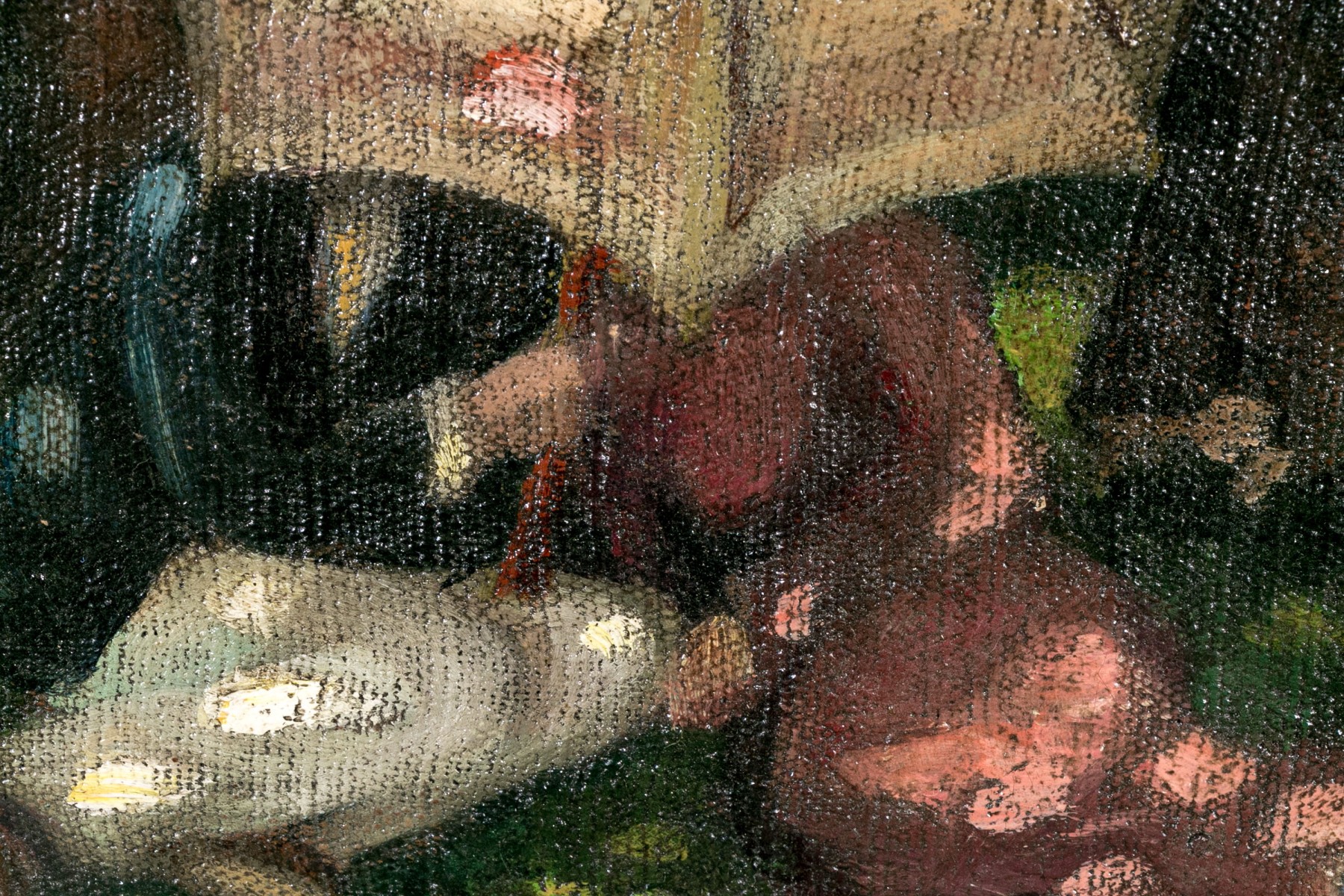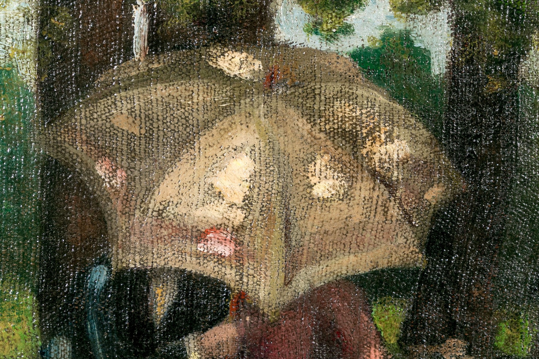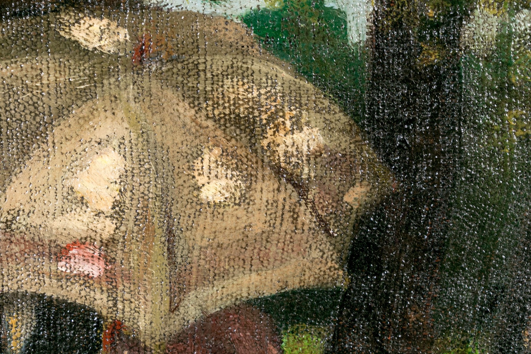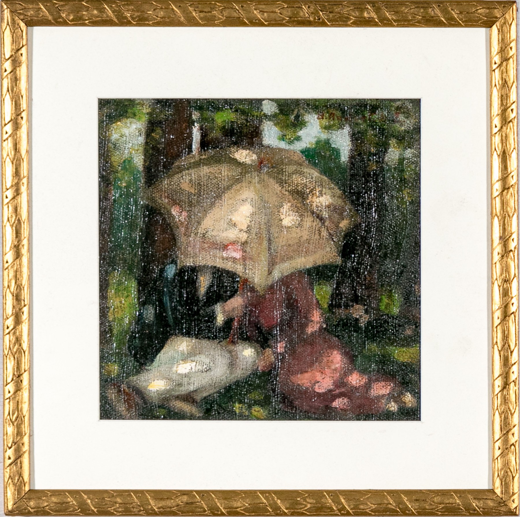 Unsigned. A lady in a long pink dress is seated at a table in a garden under a patterned umbrella. All in subtle colors. Presented in a gilt frame.