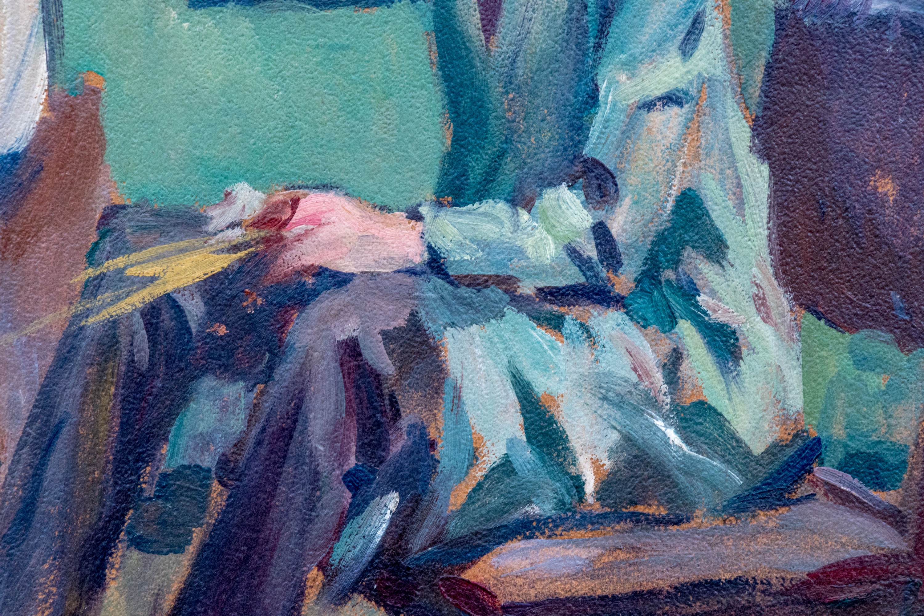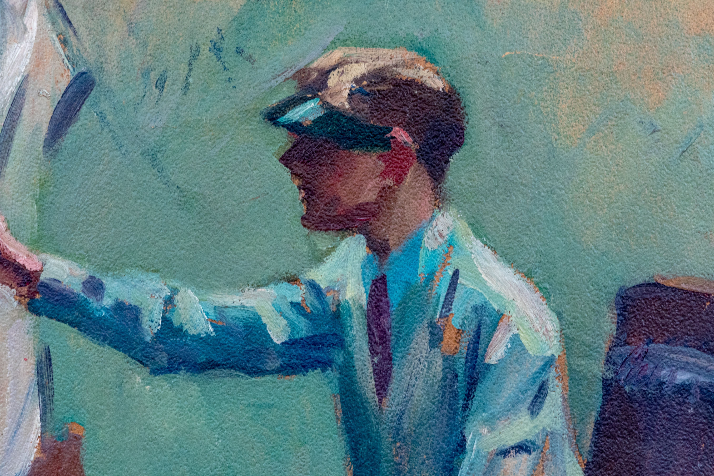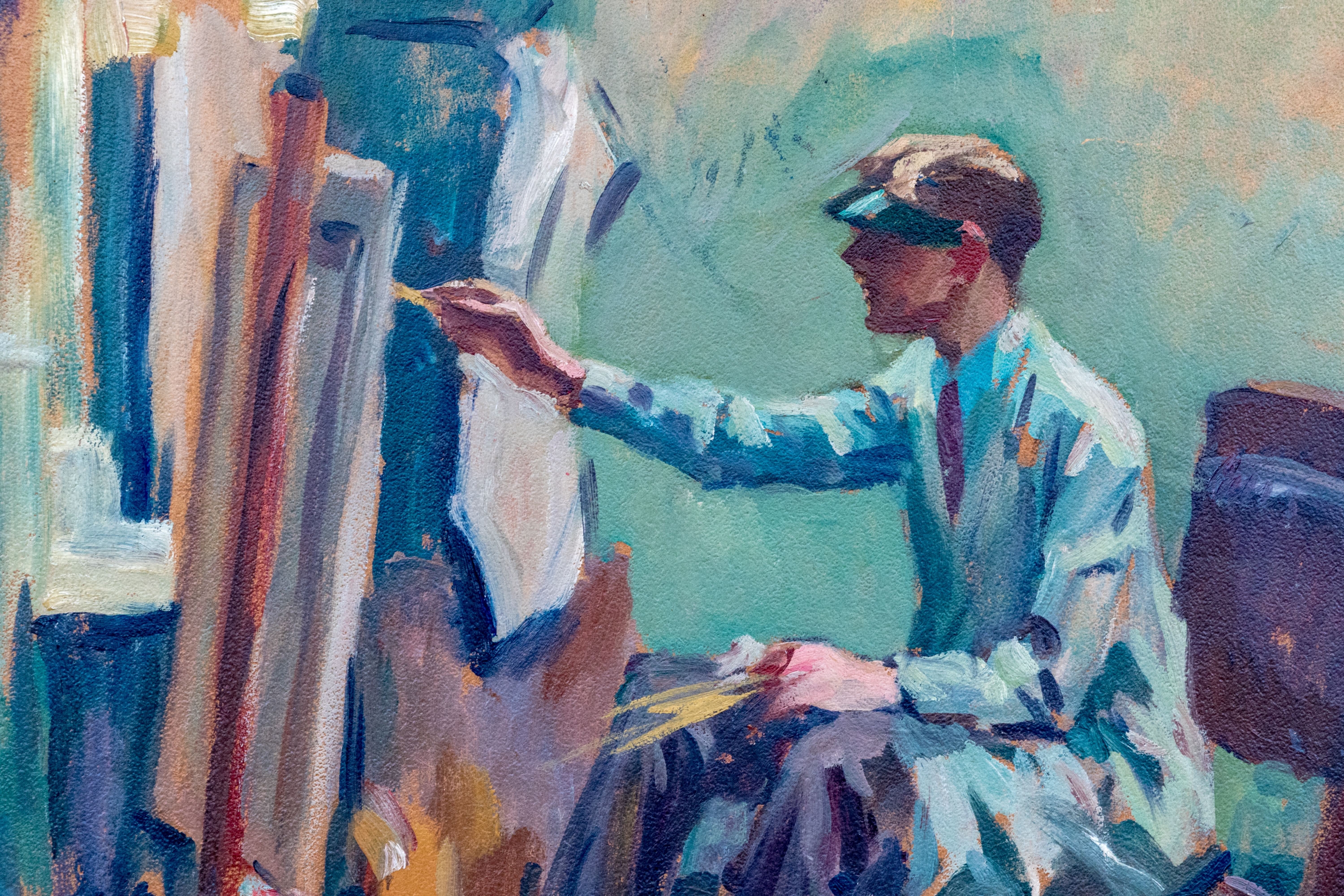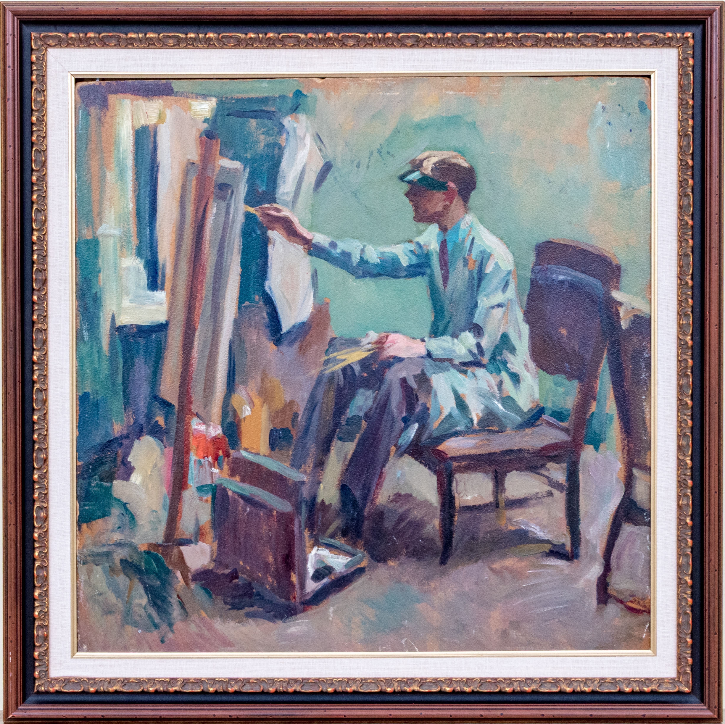 A delightful impressionist oil painting on canvas depicting an artist at work. The gentleman wears a light blue or white jacket over a red tie with warm-toned gray pants, seated on a chair with one arm extending a brush to a canvas on an easel. Appears to be unsigned.