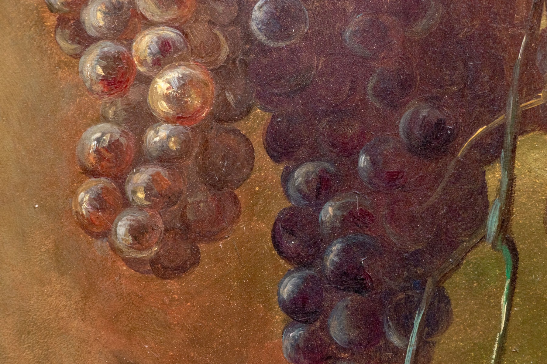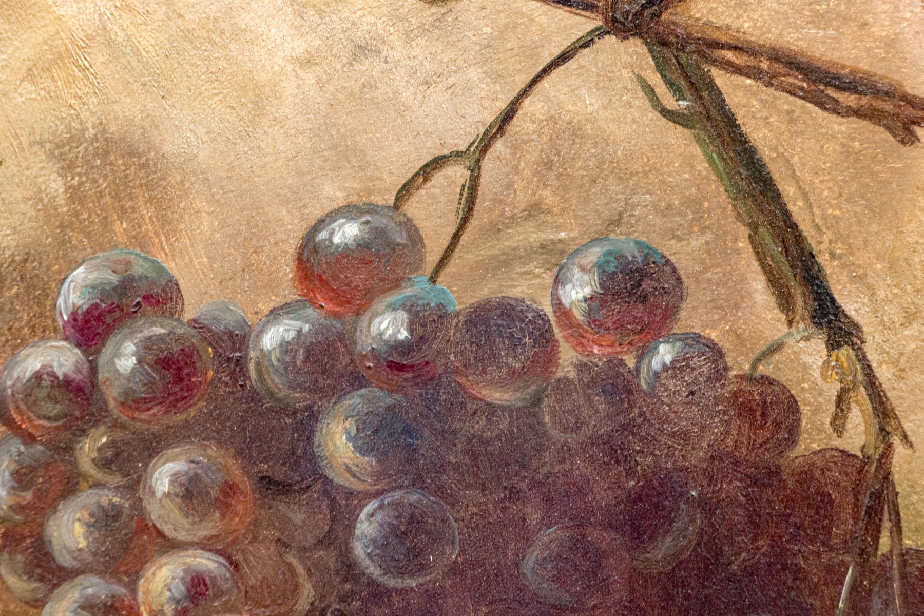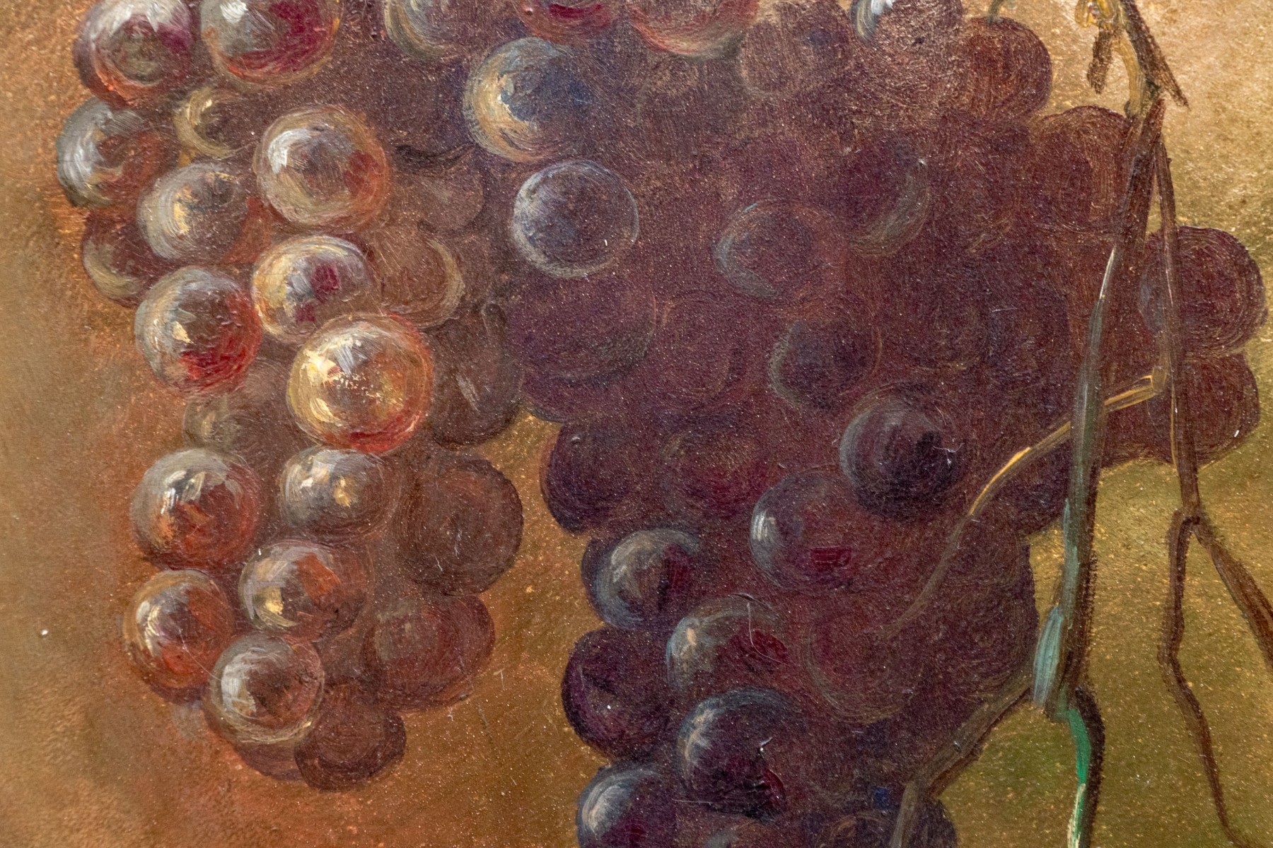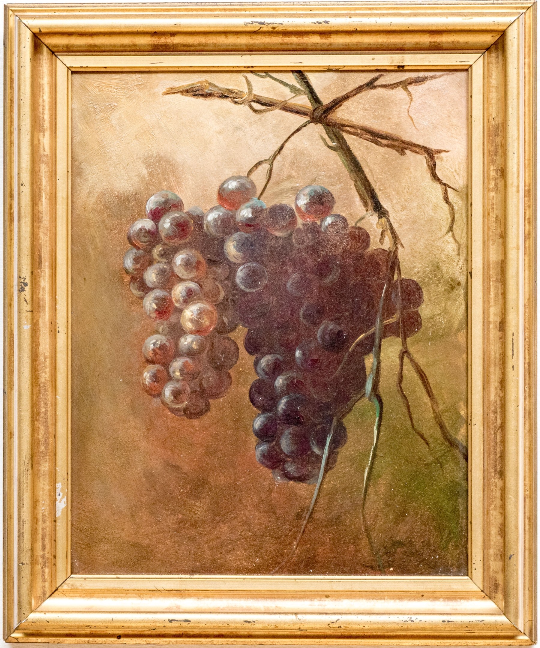 A fantastically detailed painting on board depicting two bunches of grapes hanging from vines against an obscured background.