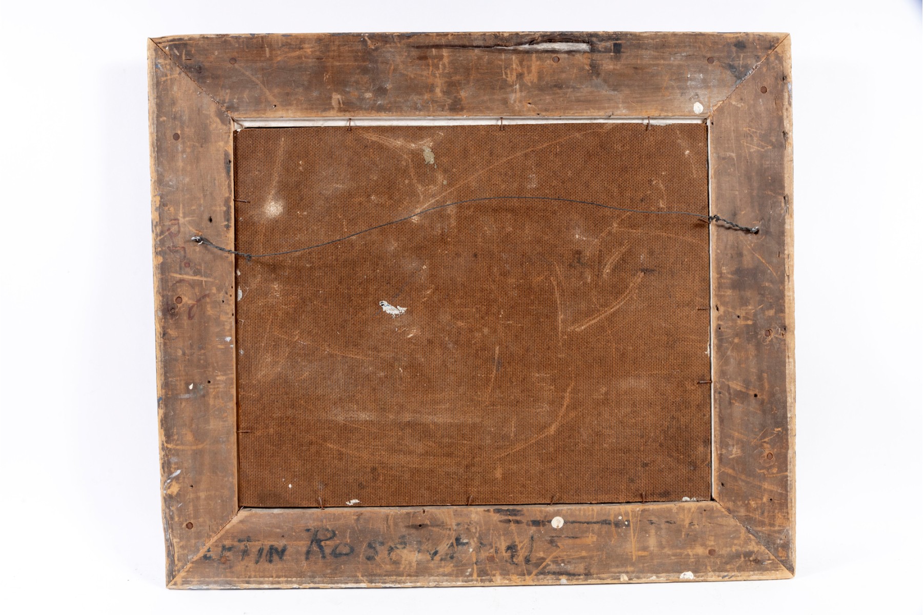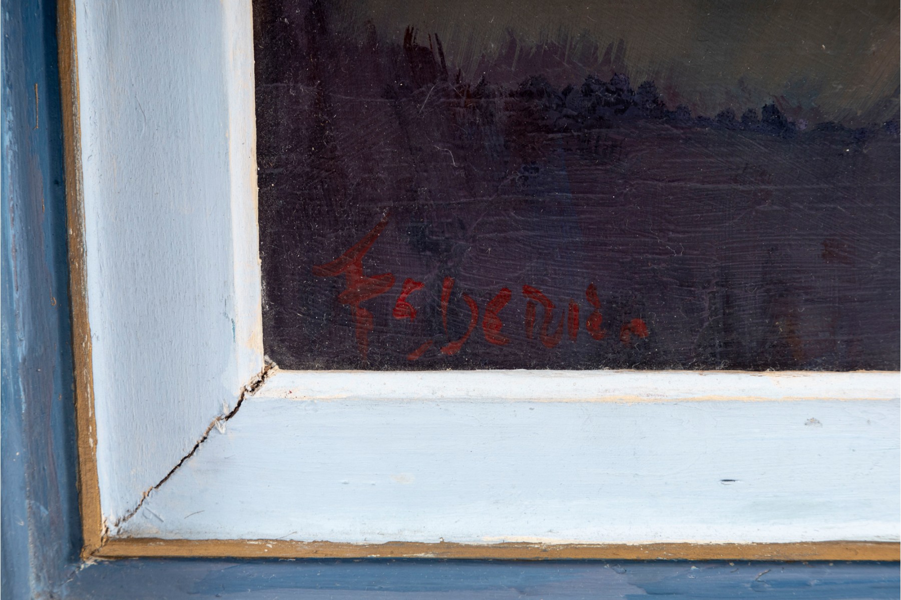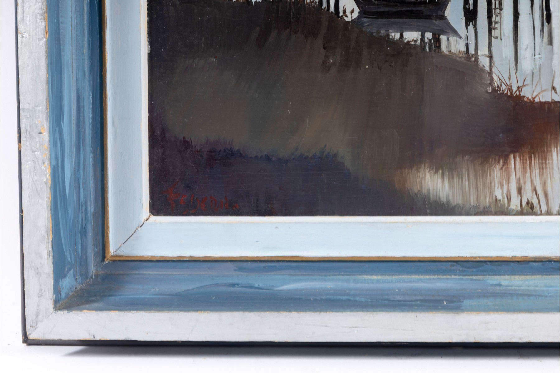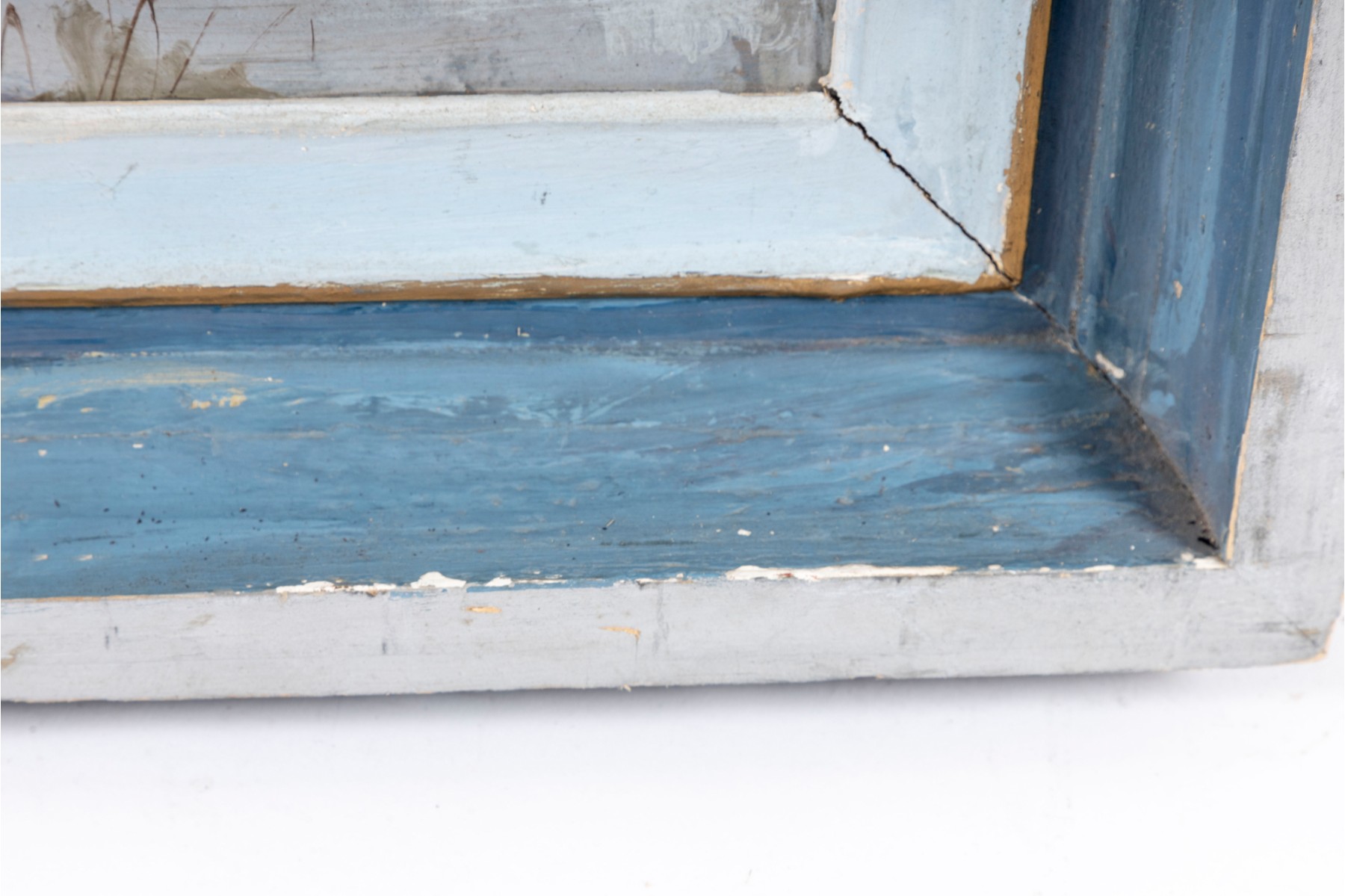 Painting sits loose in frame. Scuffs and scratches to frame.