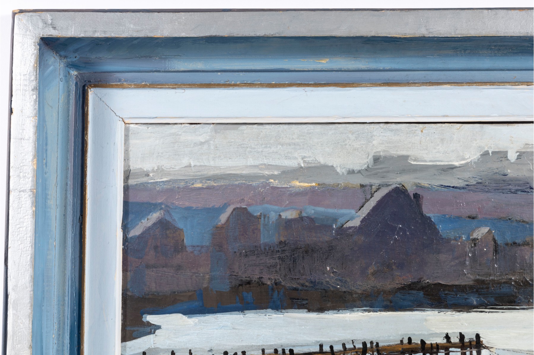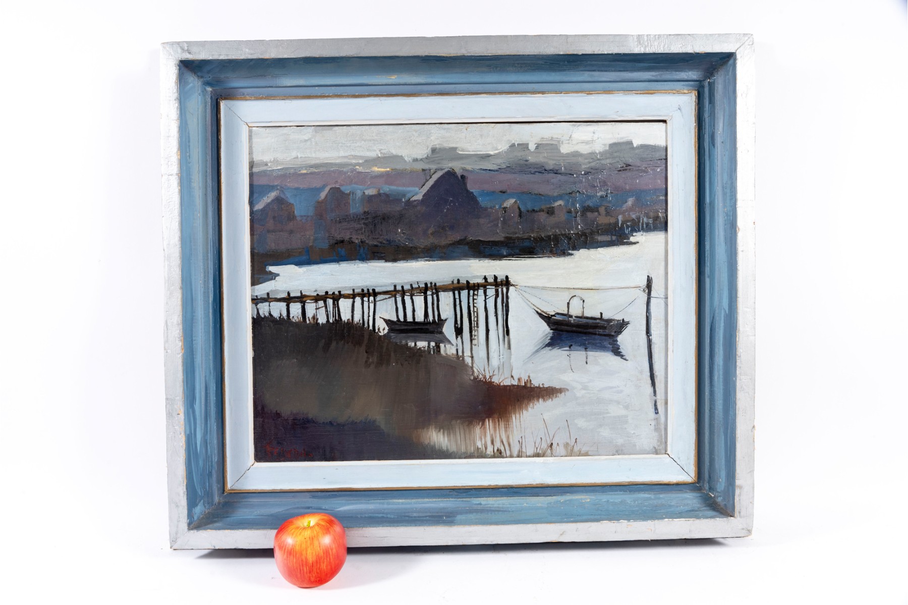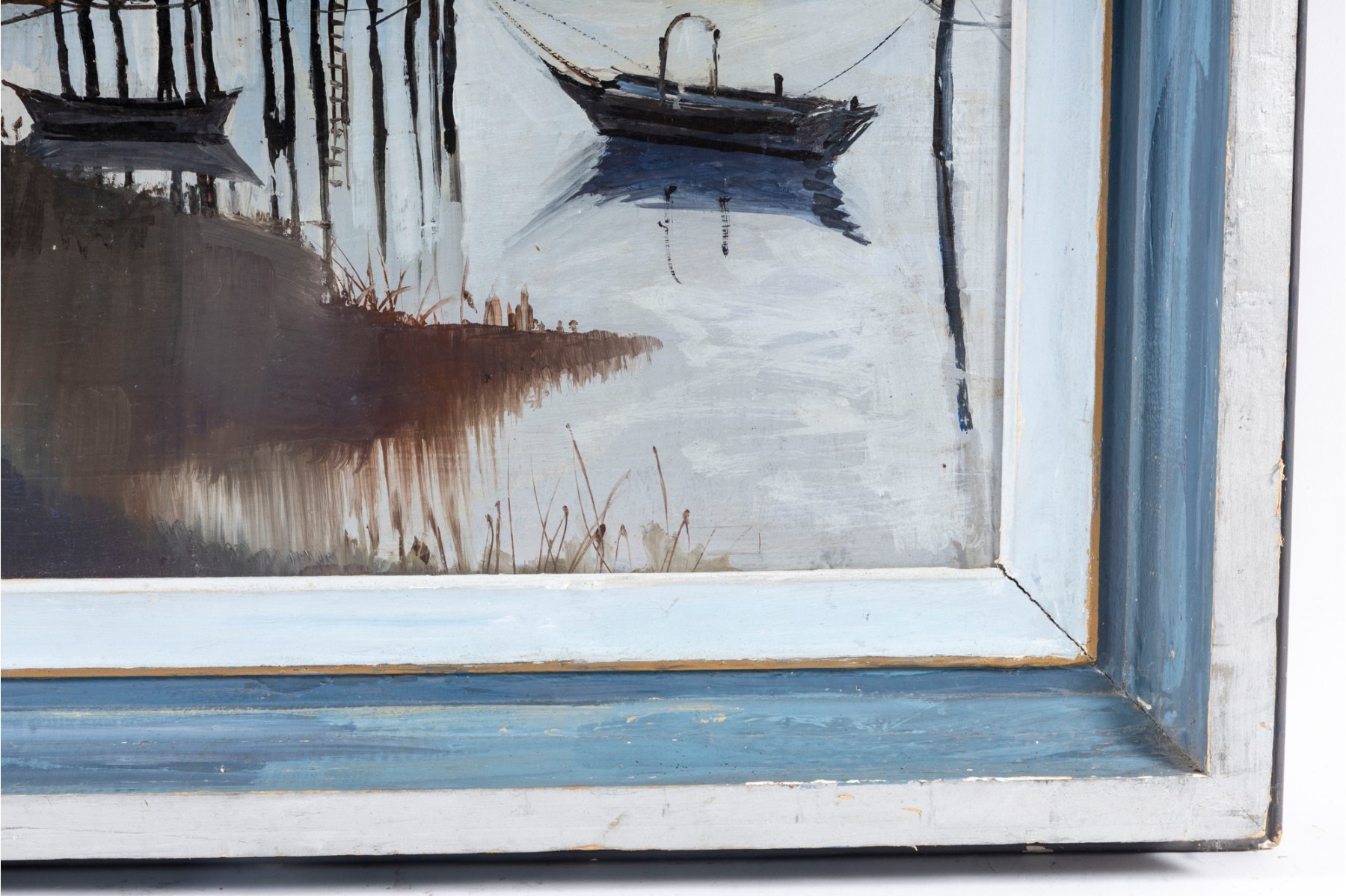 An unsigned oil on board harbor landscape painting in gloomy hues of blue, violet, gray and brown. The artwork is presented openly in a painted frame of matching design, ready to hang.