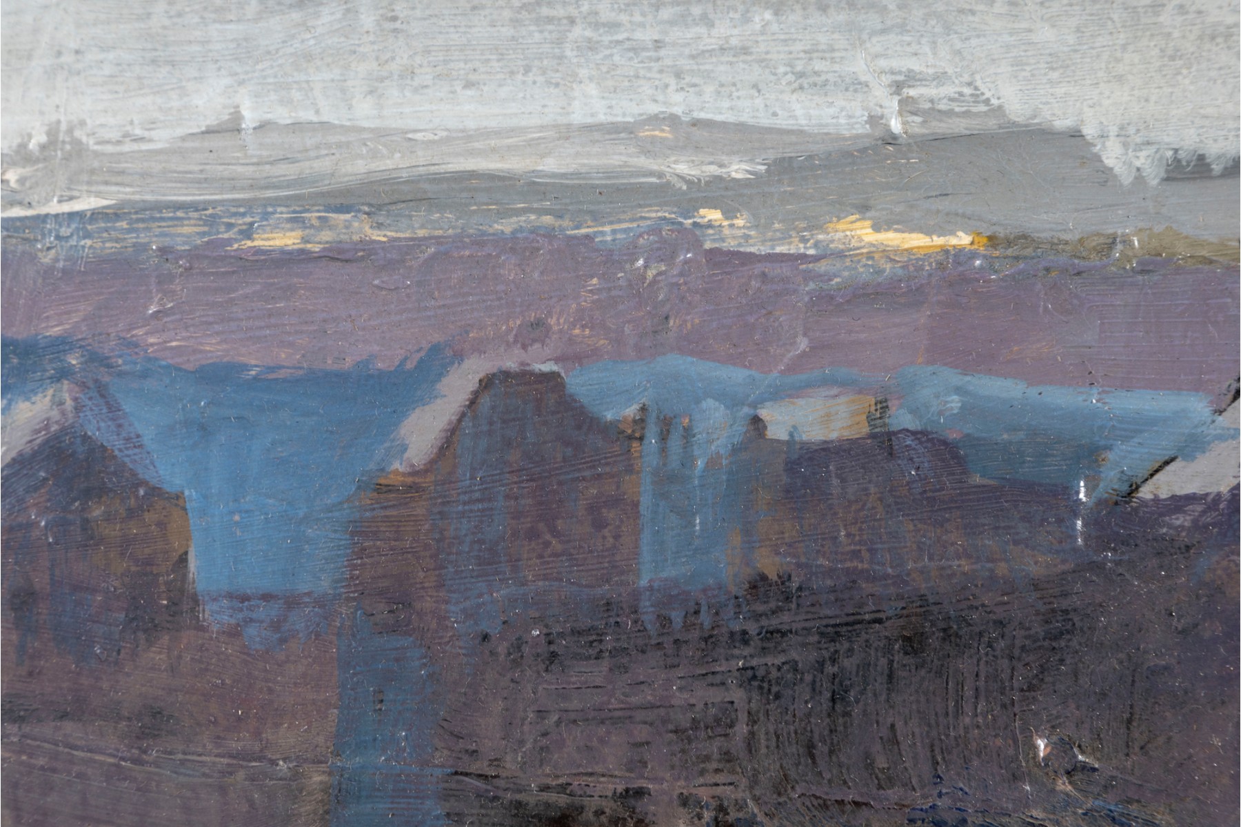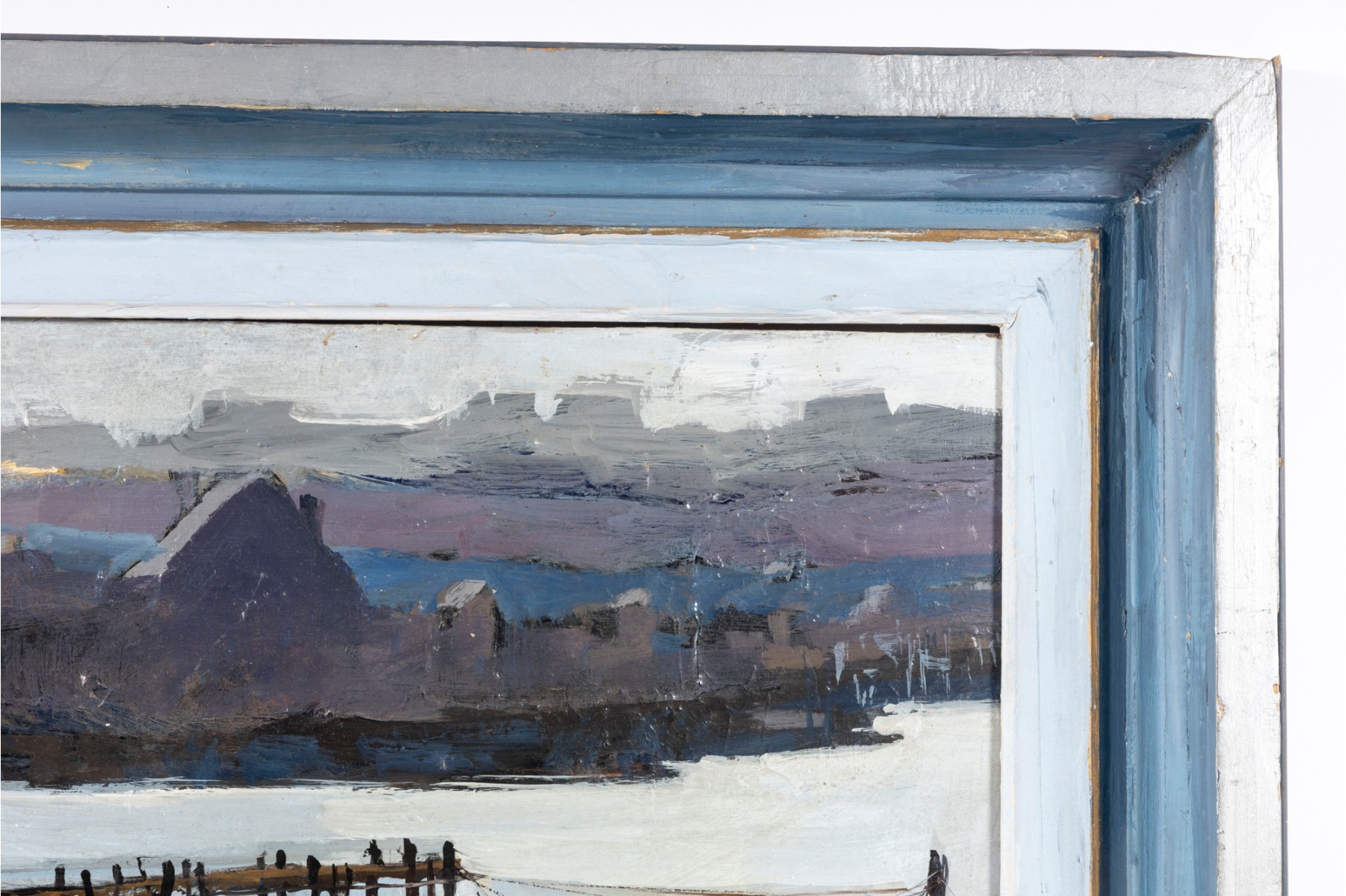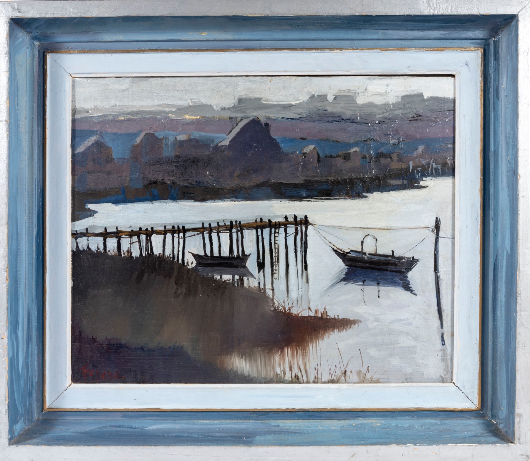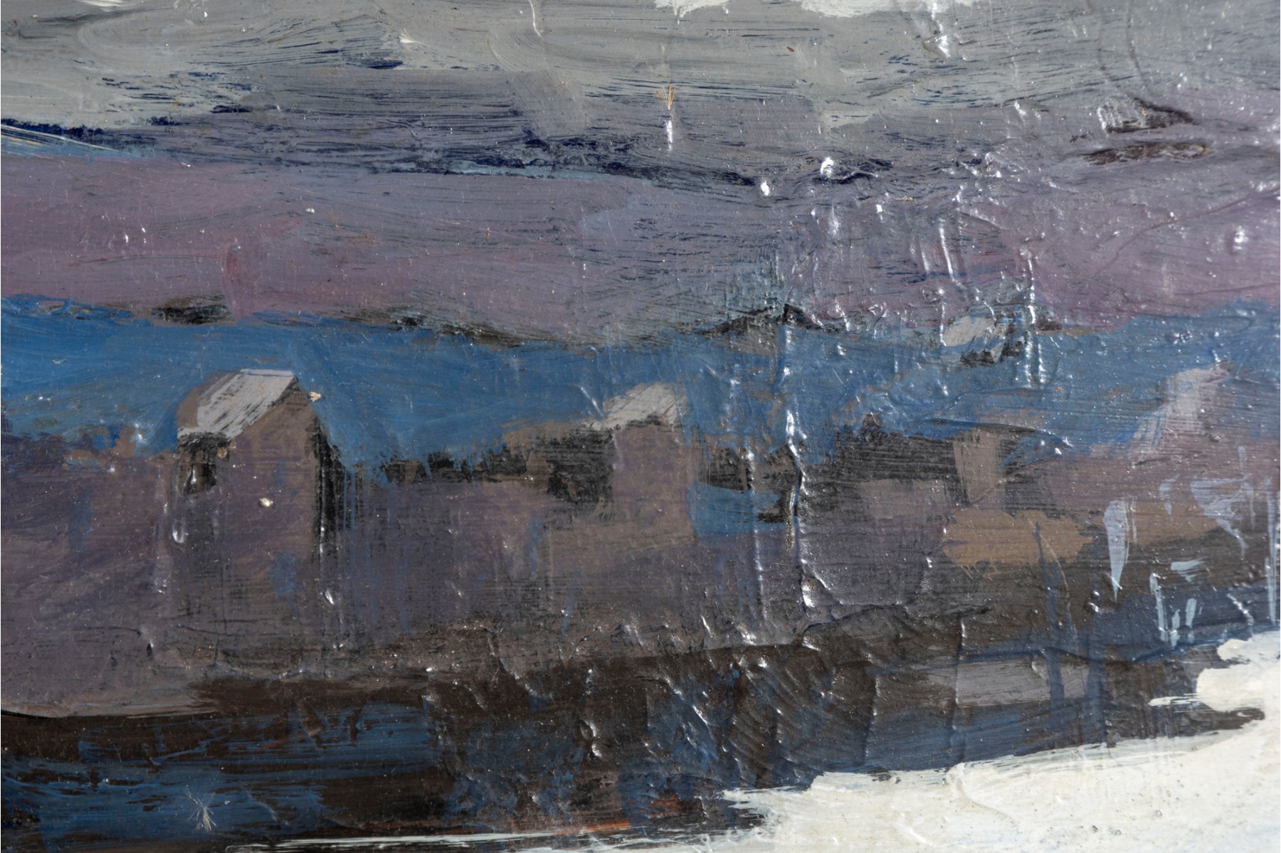 An unsigned oil on board harbor landscape painting in gloomy hues of blue, violet, gray and brown. The artwork is presented openly in a painted frame of matching design, ready to hang.