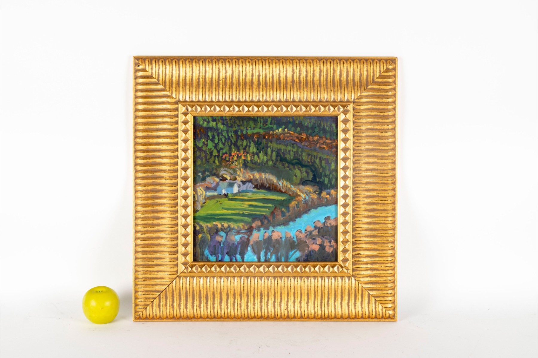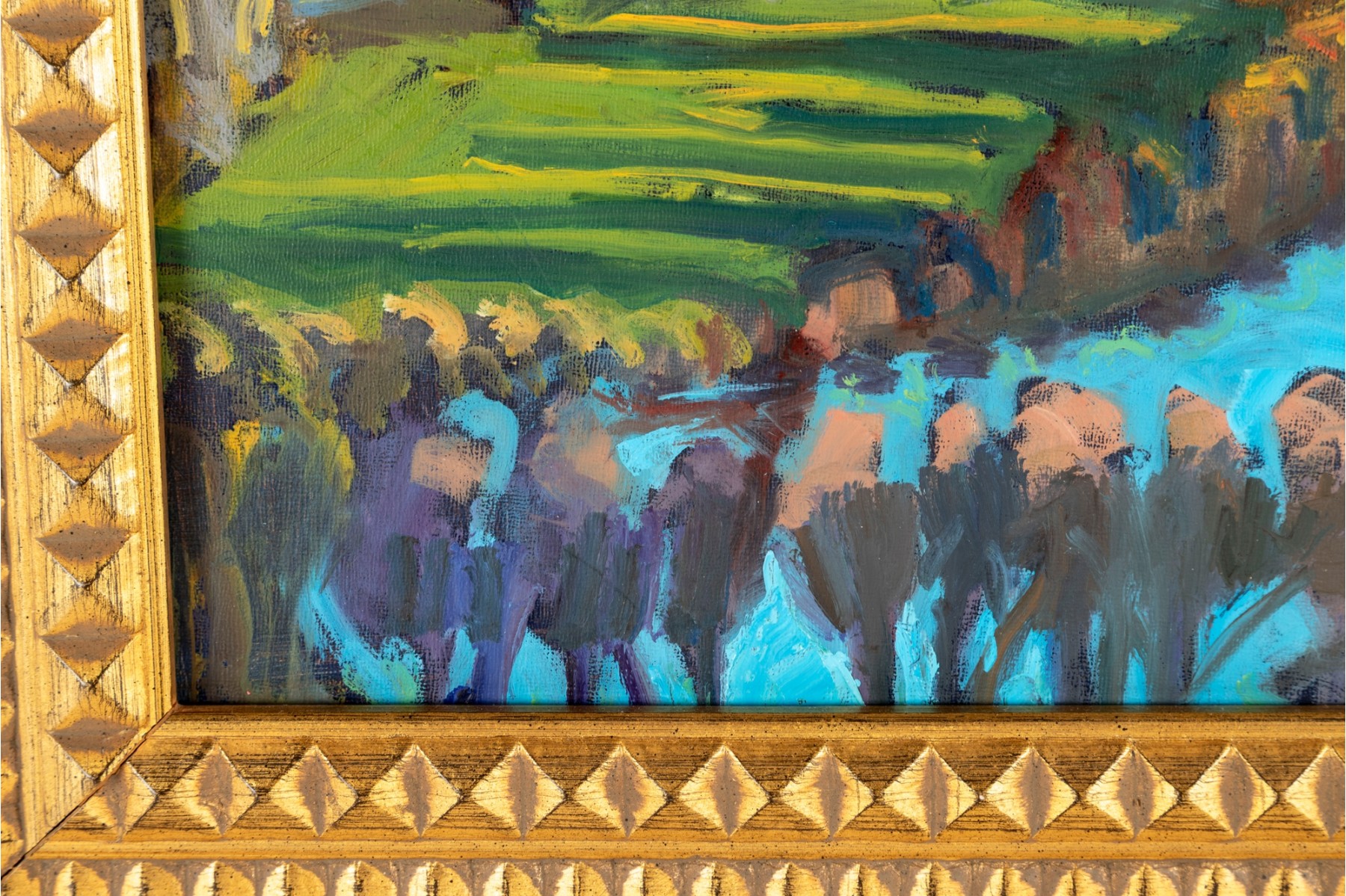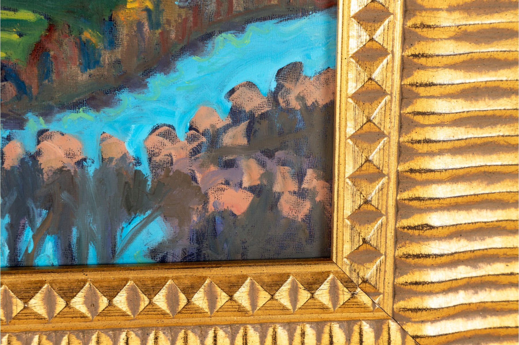 This vibrant oil on board painting presents a lush, impressionistic landscape scene, depicting a countryside river bend bordered by foliage and fields. The artwork is presented openly within an extravagant faceted gold-tone wood frame.