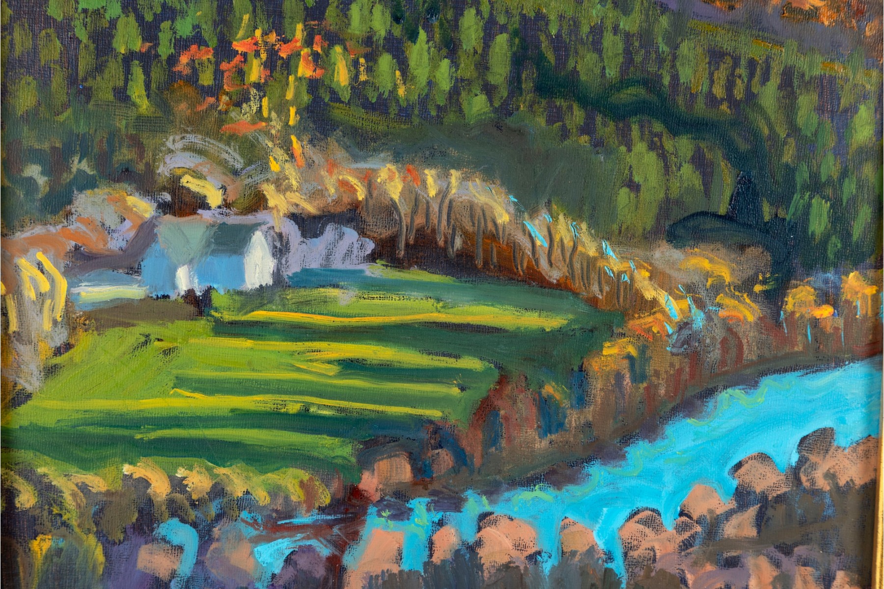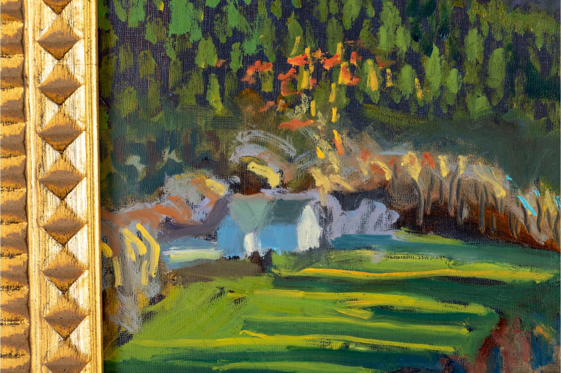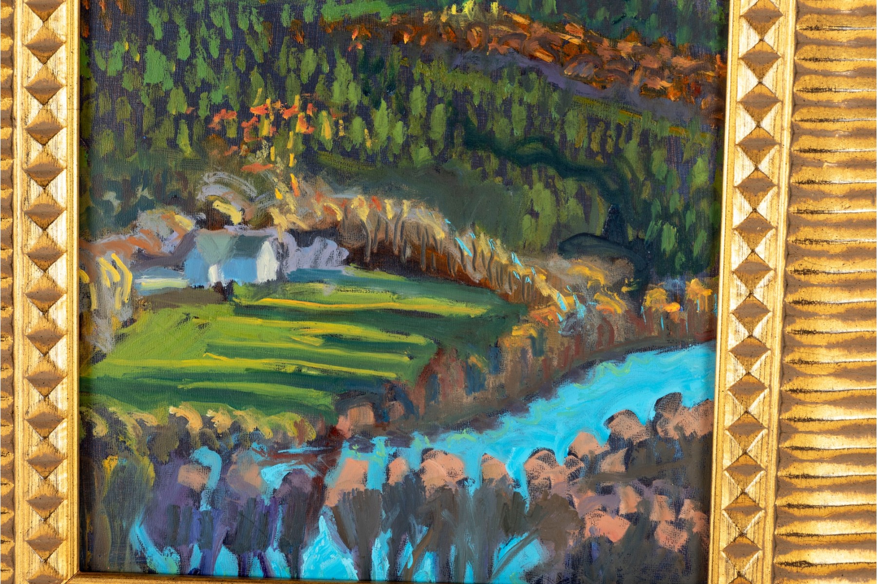 This vibrant oil on board painting presents a lush, impressionistic landscape scene, depicting a countryside river bend bordered by foliage and fields. The artwork is presented openly within an extravagant faceted gold-tone wood frame.