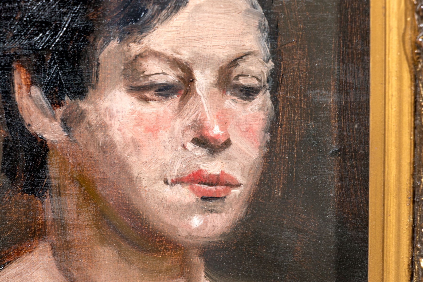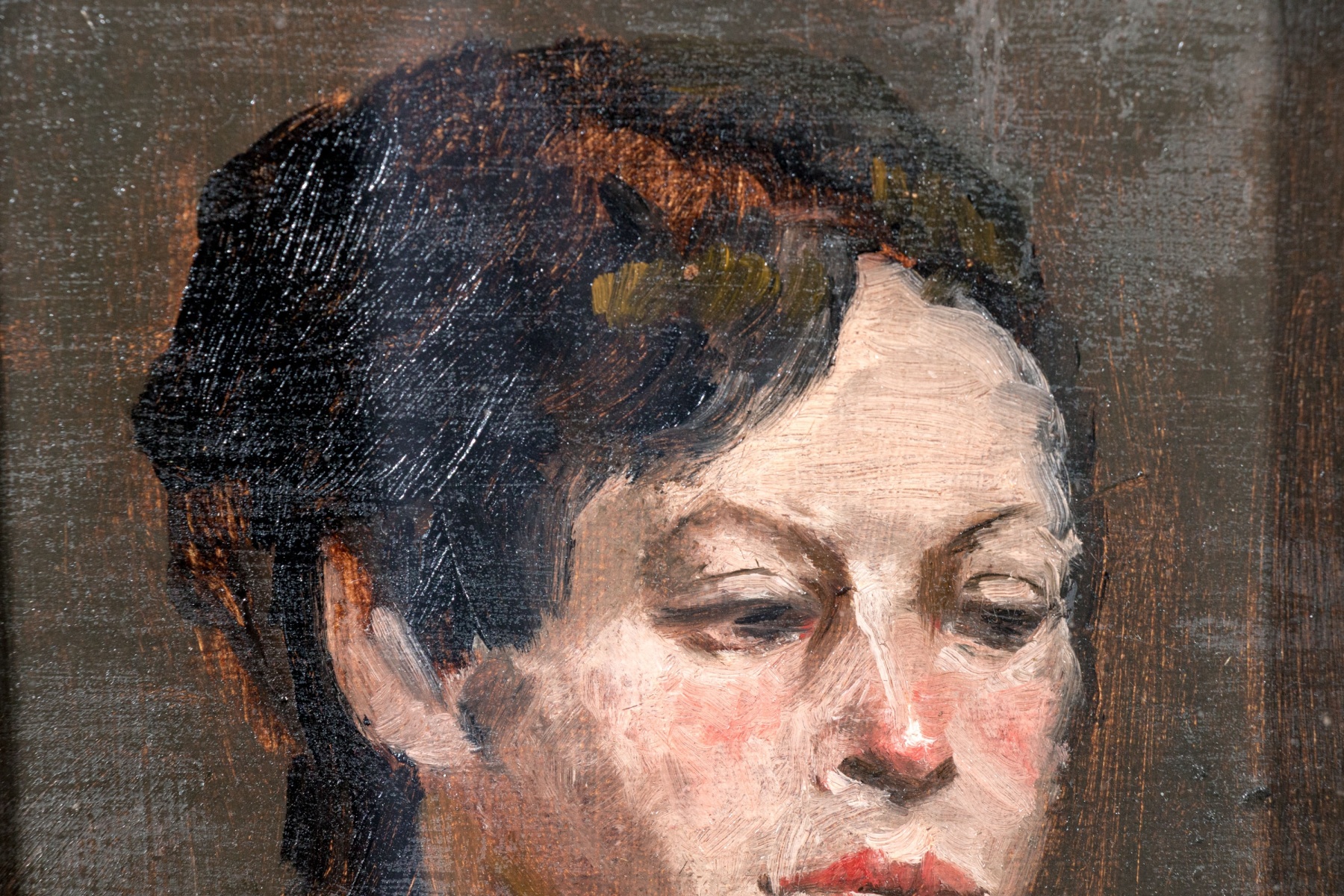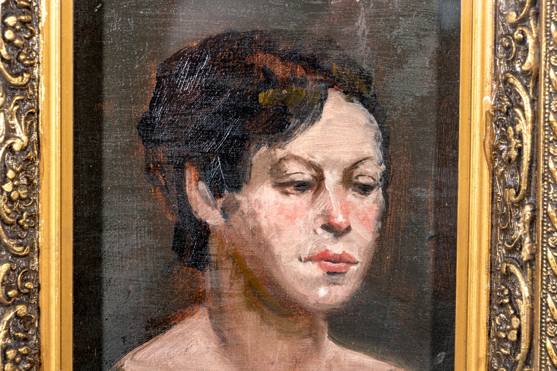 A well rendered oil painting on board portrait of a woman with dark brown hair done up, wearing a dark brown gown with a wide V neckline. The woman poses in three quarter profile looking off to the right with a calm, neutral expression against a dark brown ground.