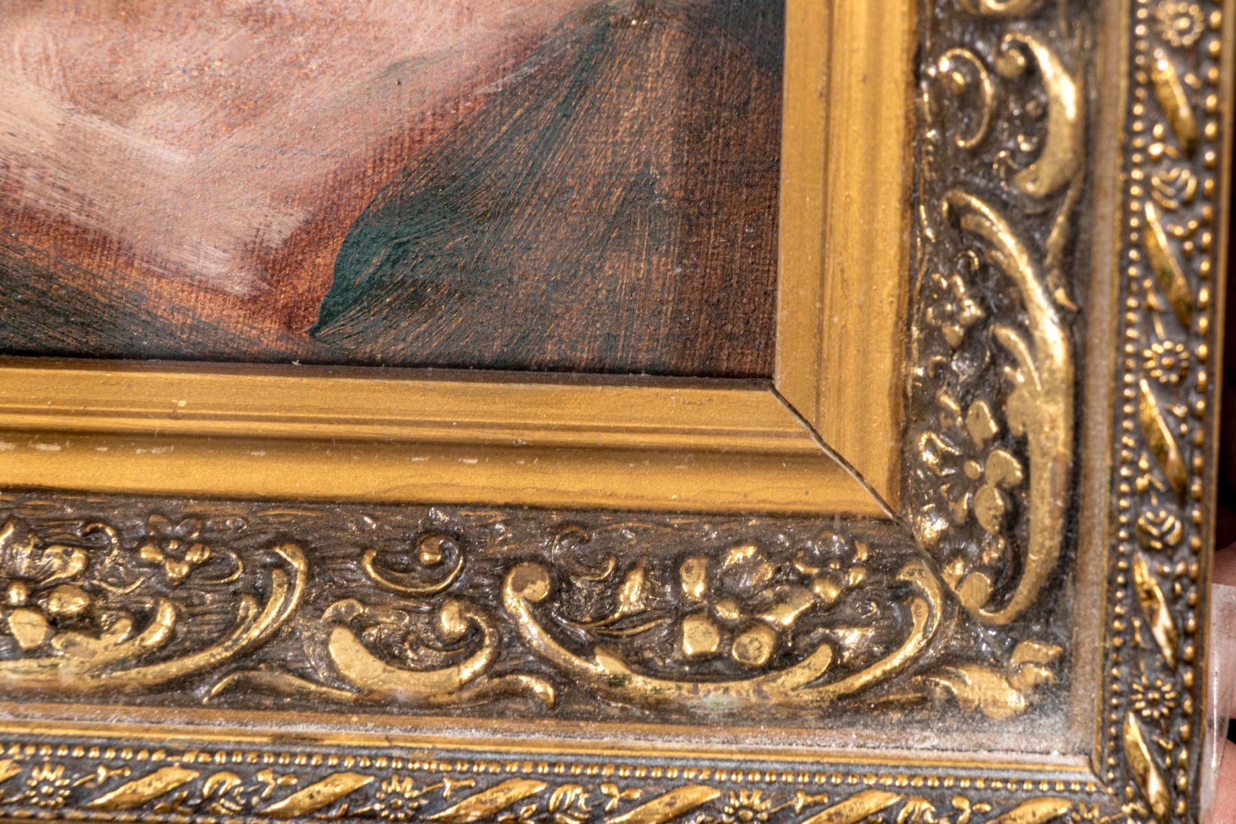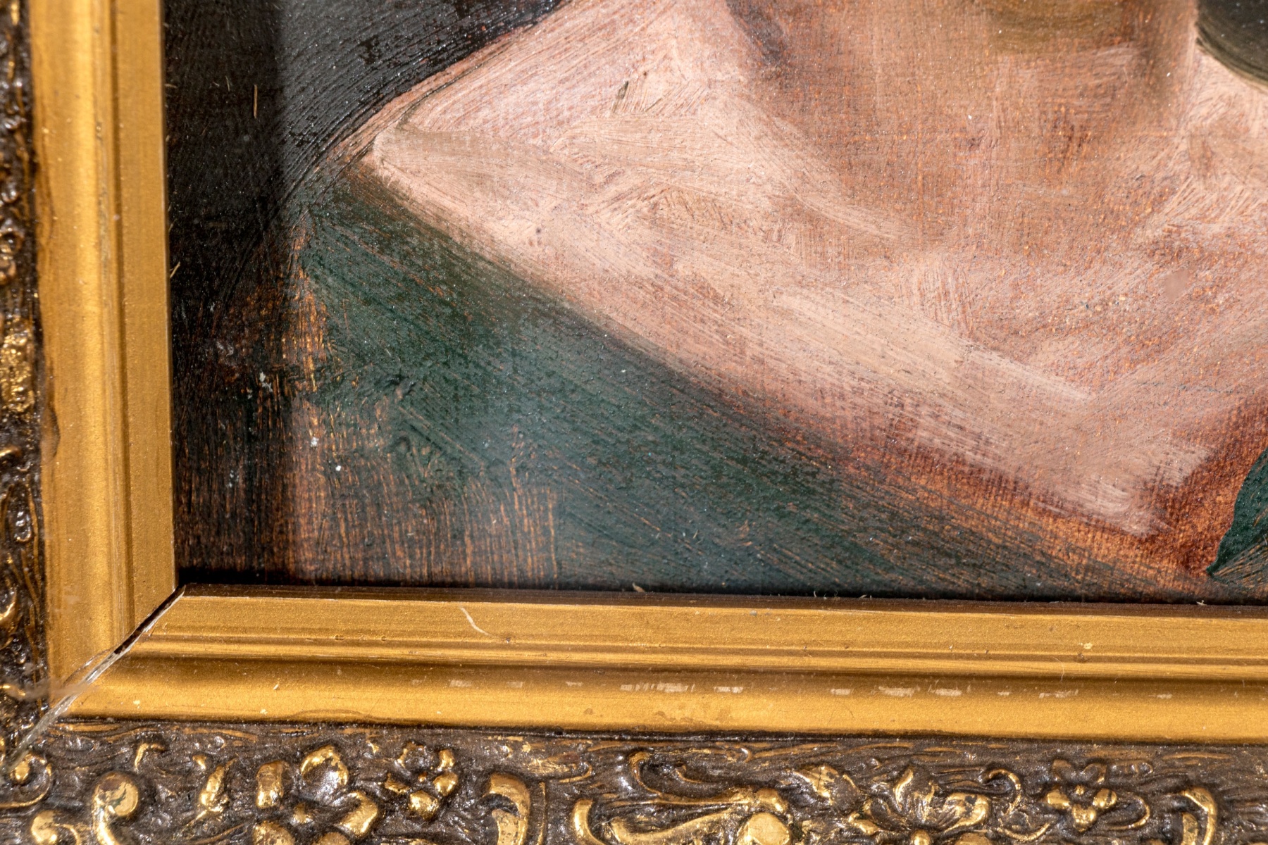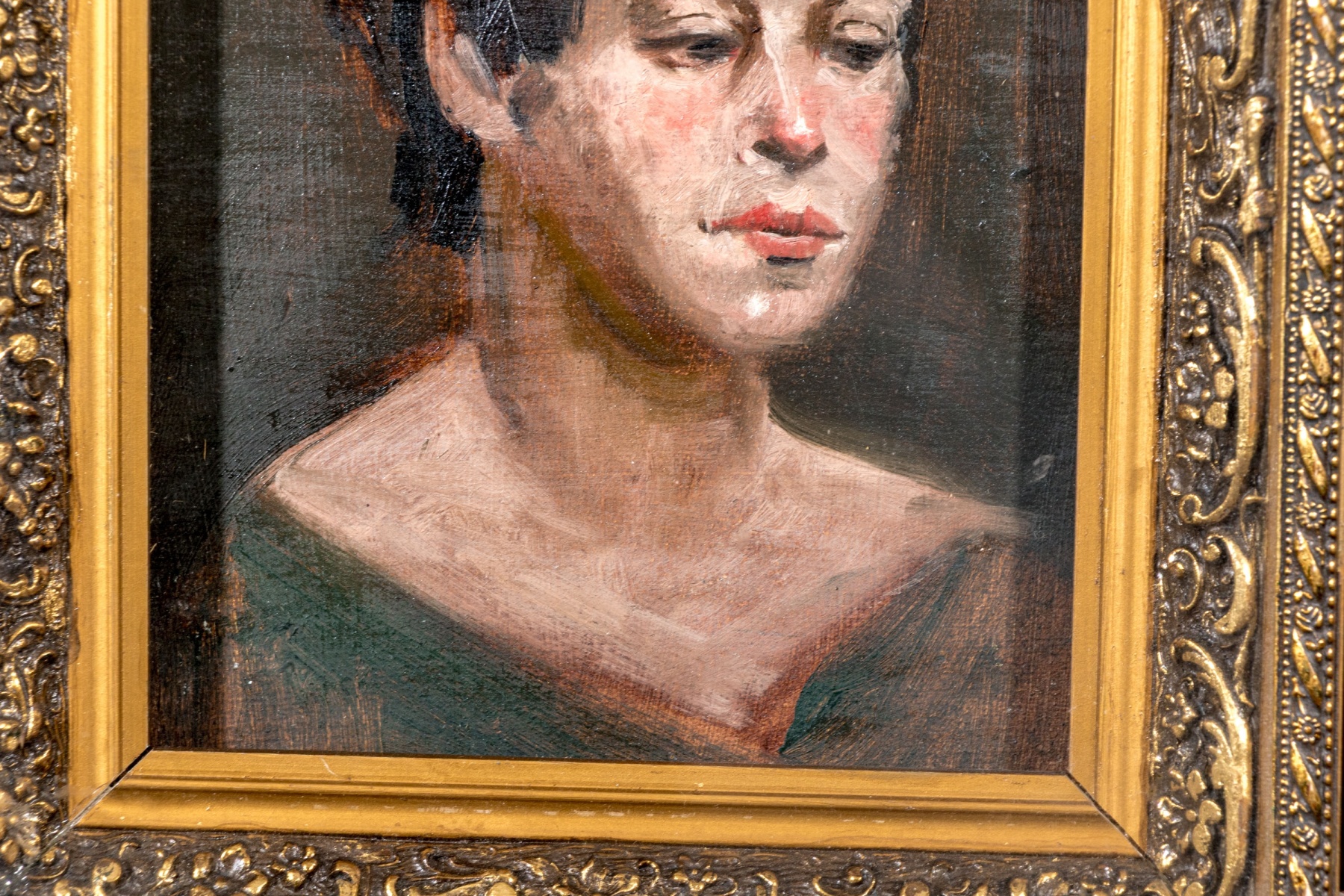 A well rendered oil painting on board portrait of a woman with dark brown hair done up, wearing a dark brown gown with a wide V neckline. The woman poses in three quarter profile looking off to the right with a calm, neutral expression against a dark brown ground.